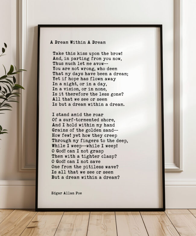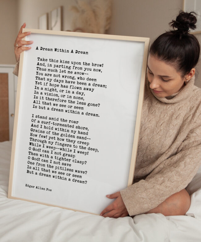 Delve into the depths of introspection with our Typography Art Print of “A Dream Within A Dream” by Edgar Allan Poe. This hauntingly beautiful poem captures the essence of fleeting moments and the fragility of life, making it a perfect addition to your literary collection. The minimalist design ensures that it seamlessly blends into any decor, while the poignant words invite reflection and contemplation. Whether displayed in your home, office, or gifted to a poetry lover, this print serves as a timeless reminder of the delicate nature of our dreams and realities.