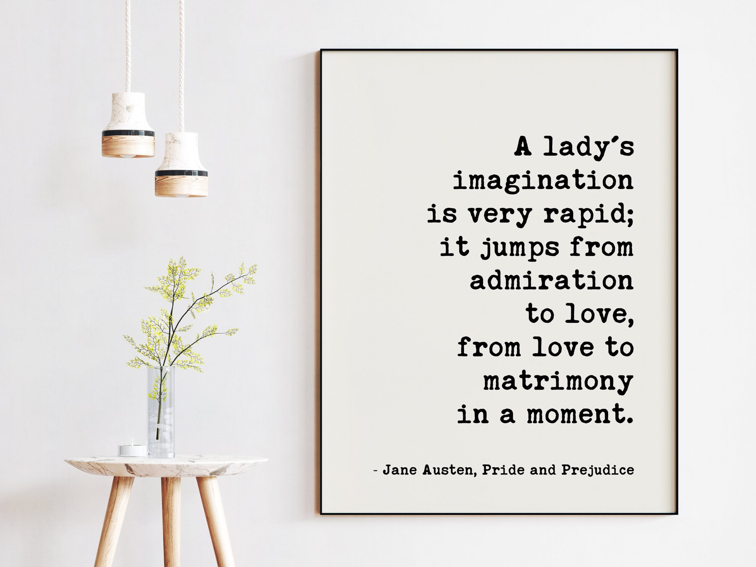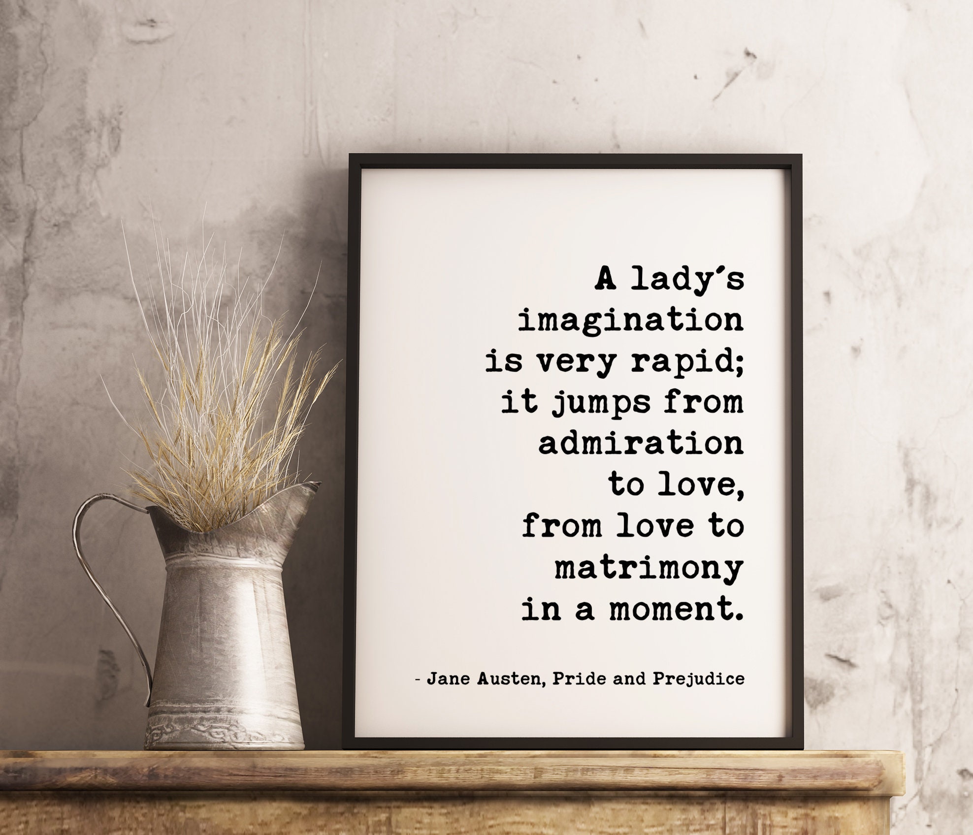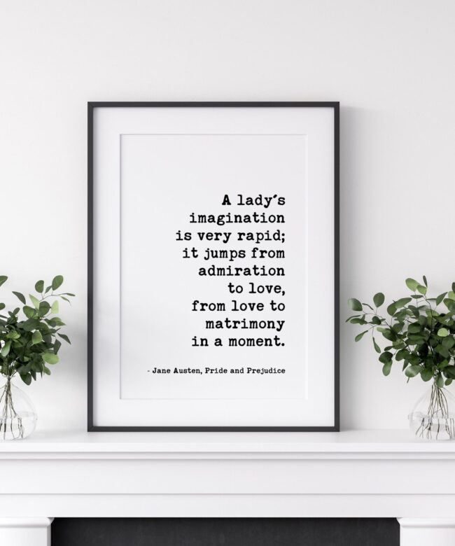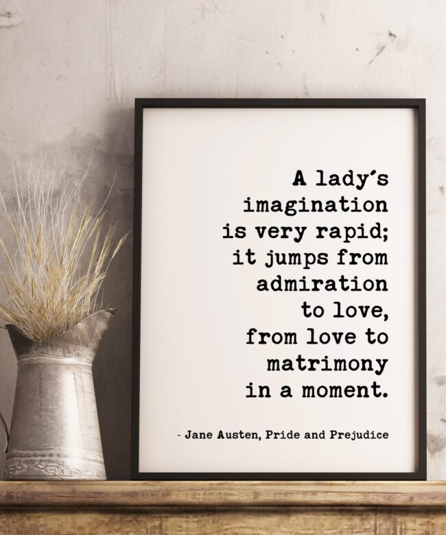 A lady’s imagination is very rapid; it jumps from admiration to love, from love to matrimony in a moment. -Jane Austen, Pride and Prejudice