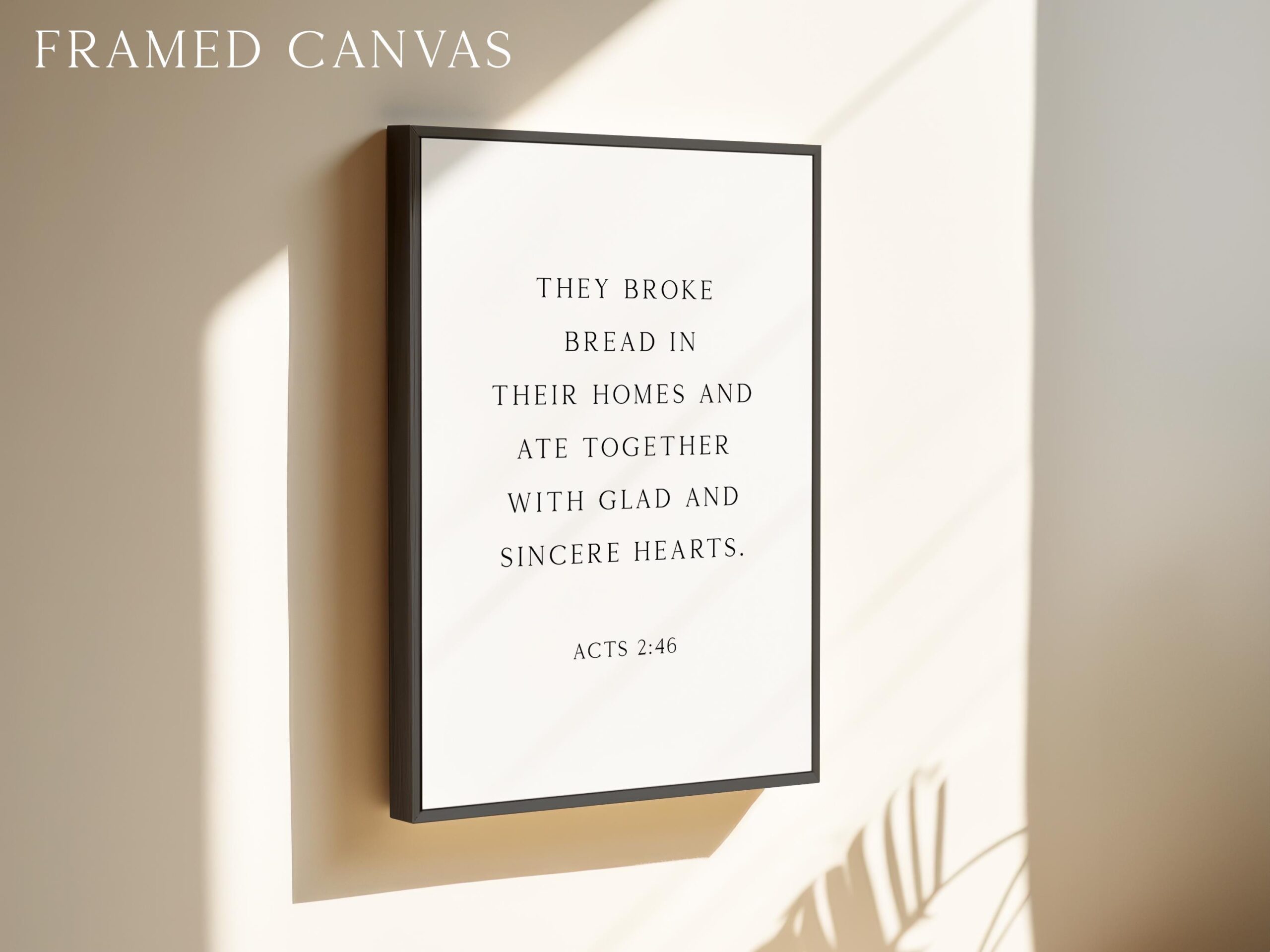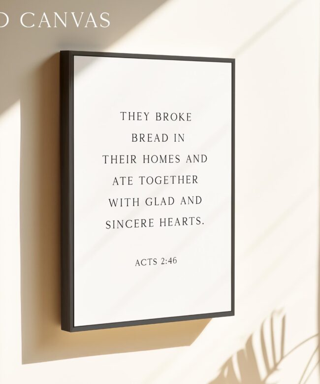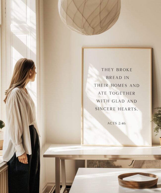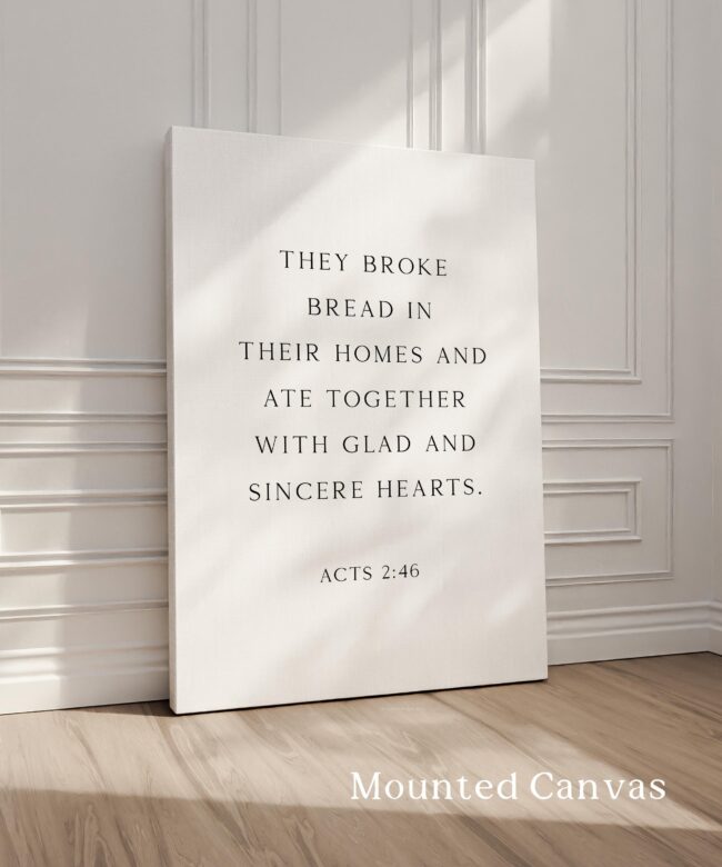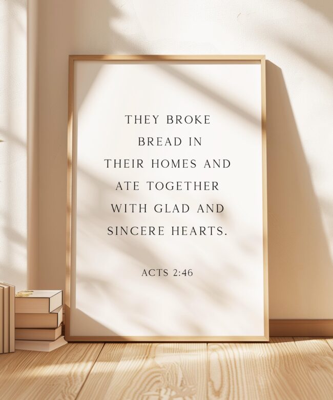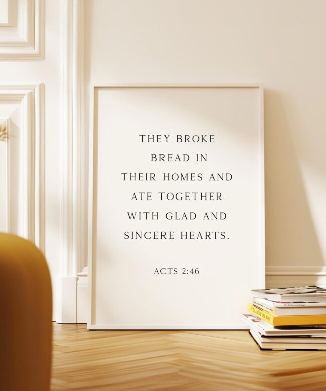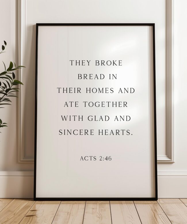 This Typography Art Print features Acts 2:46: “They broke bread in their homes and ate together with glad and sincere hearts.” The minimalist design brings quiet warmth to any space, reminding us of gratitude, fellowship, and the joy of sharing meals with others.