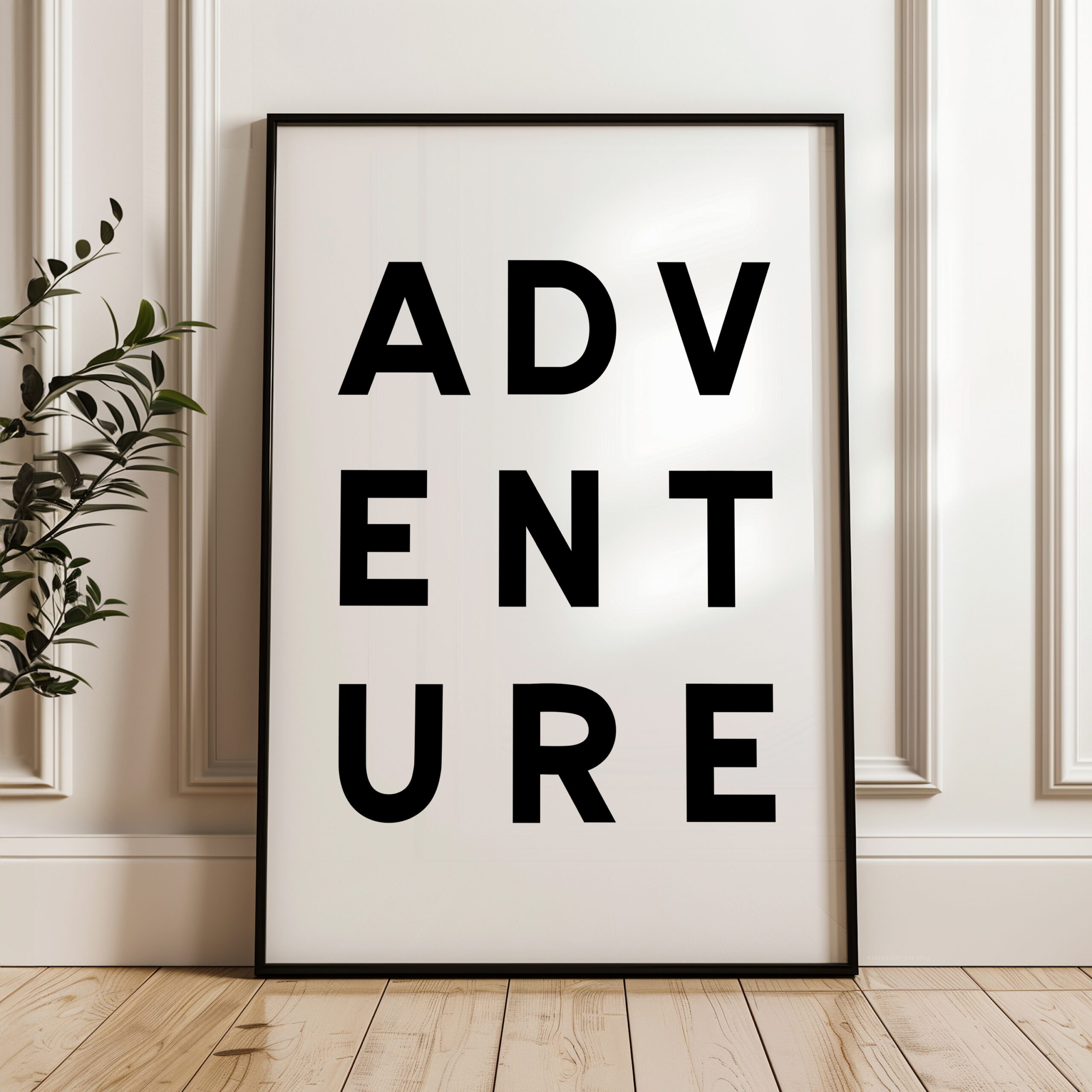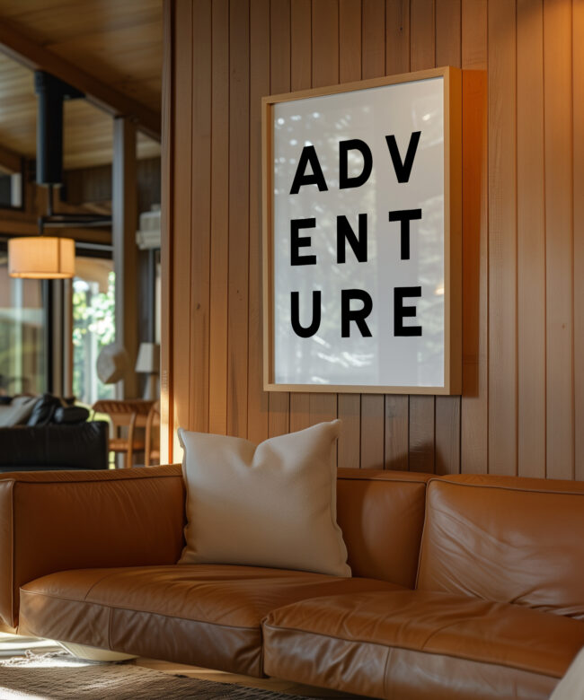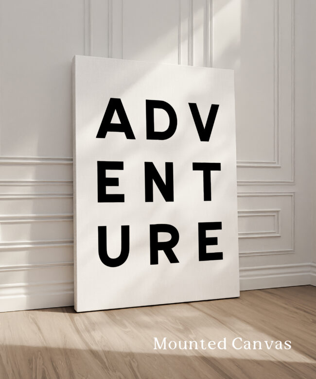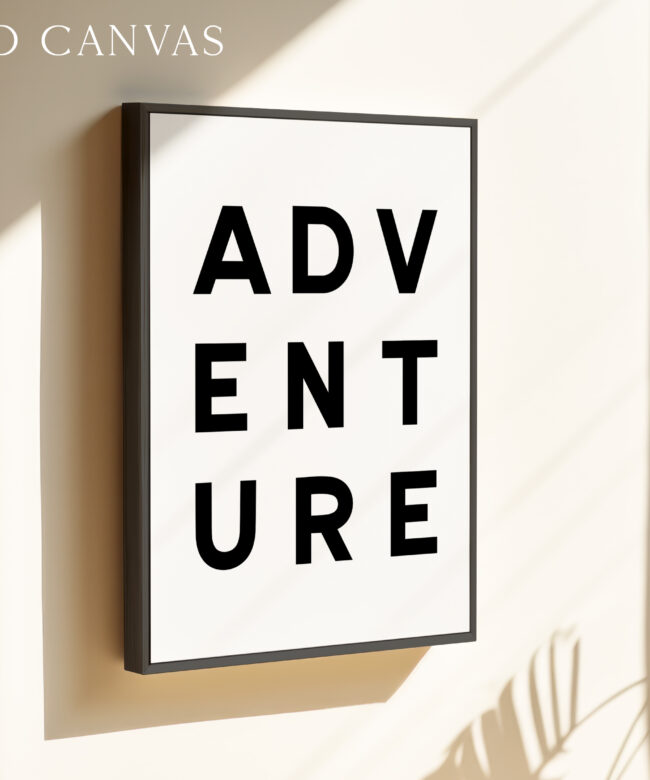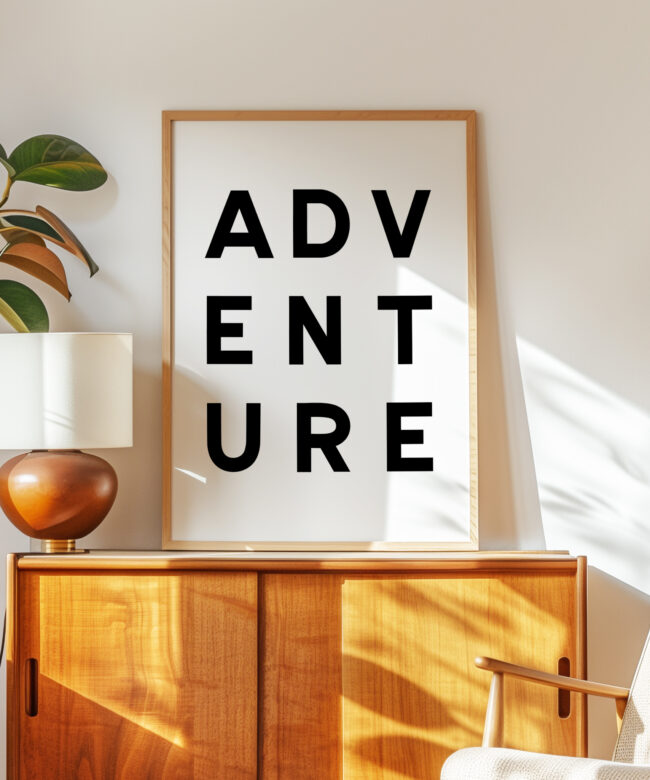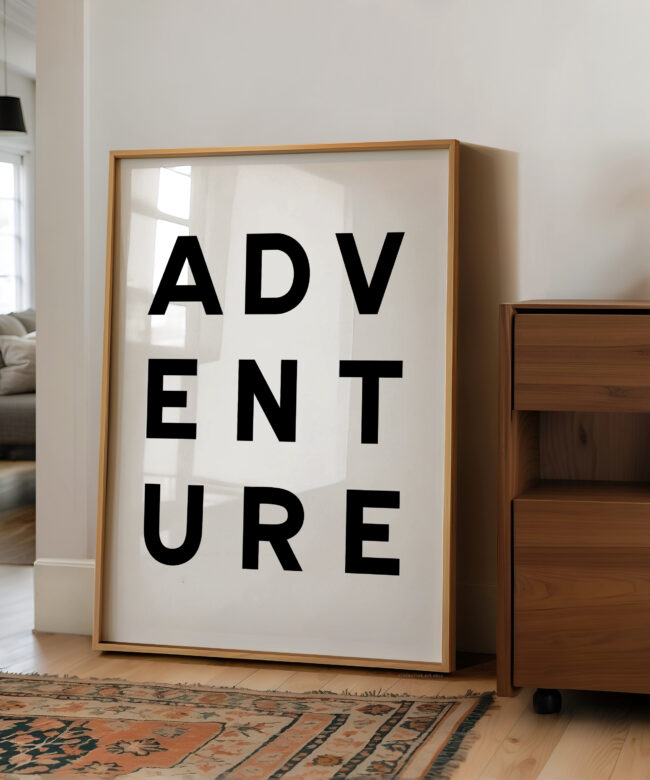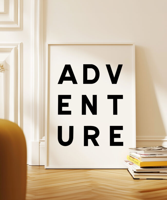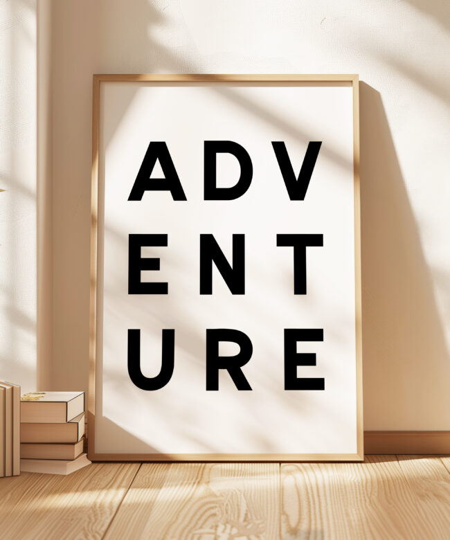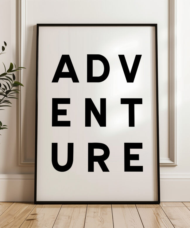 Make a statement with this modern typography art print showcasing the word “ADVENTURE” in bold, structured lettering. The unique vertical arrangement creates a strong focal point, making it ideal for minimalist home decor and gallery walls.