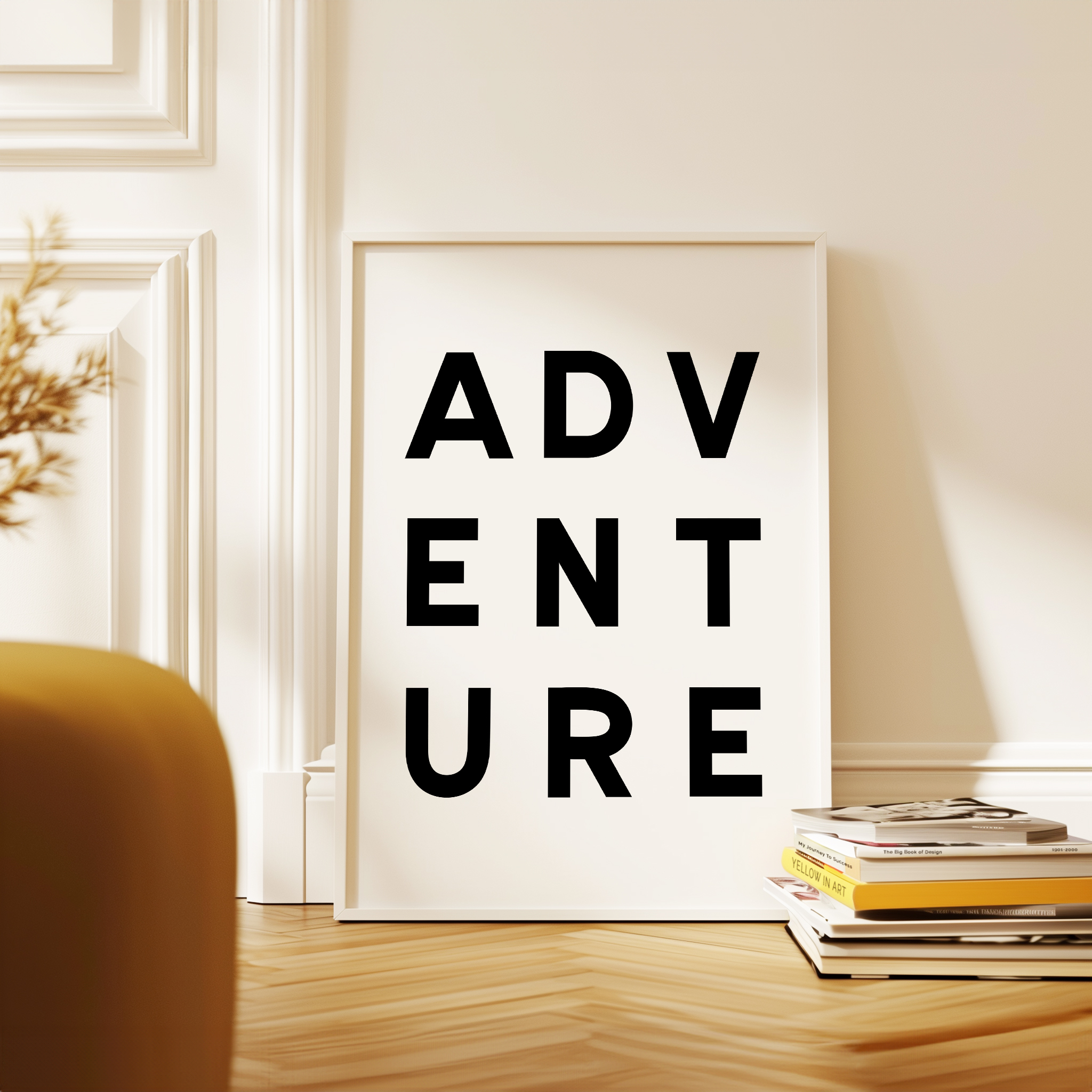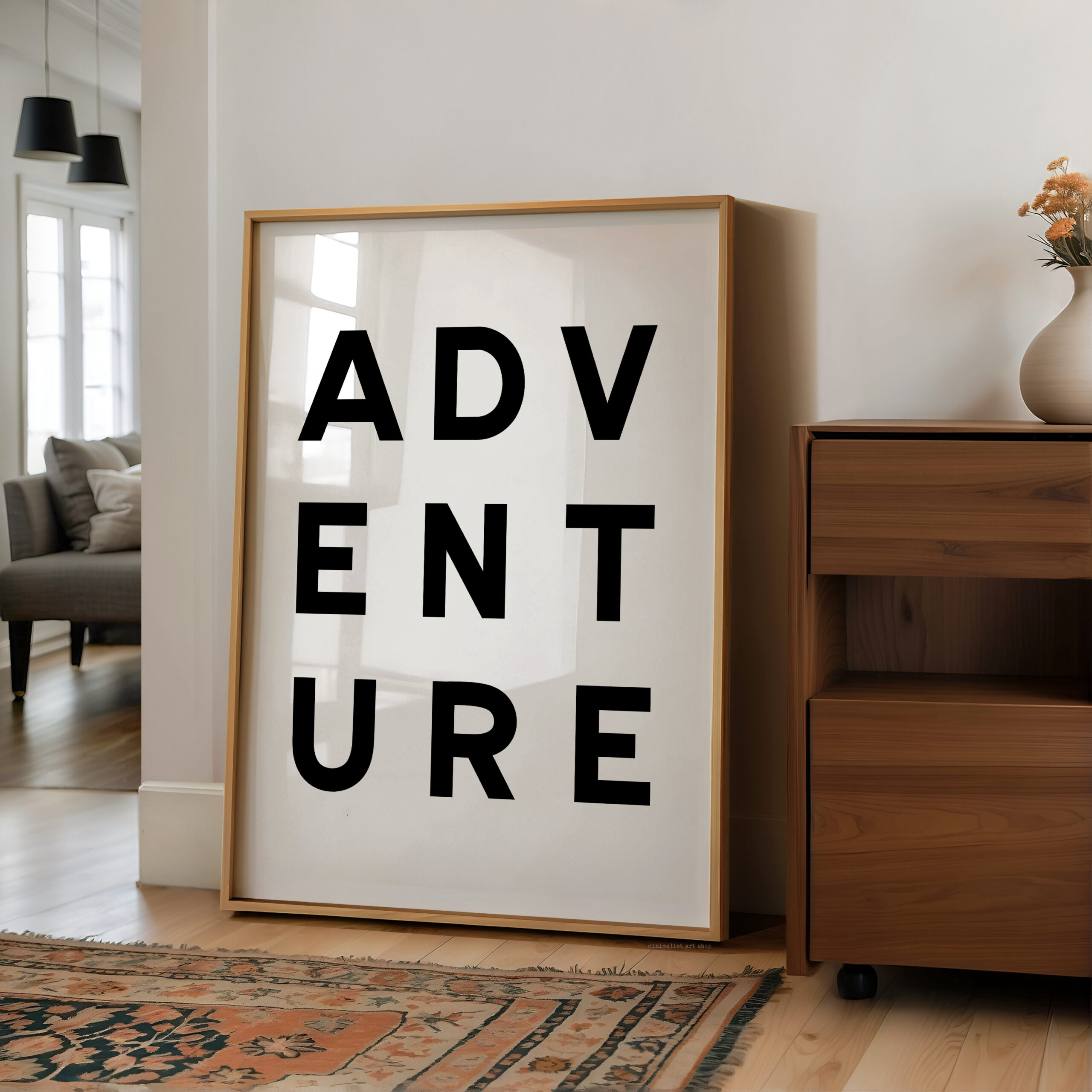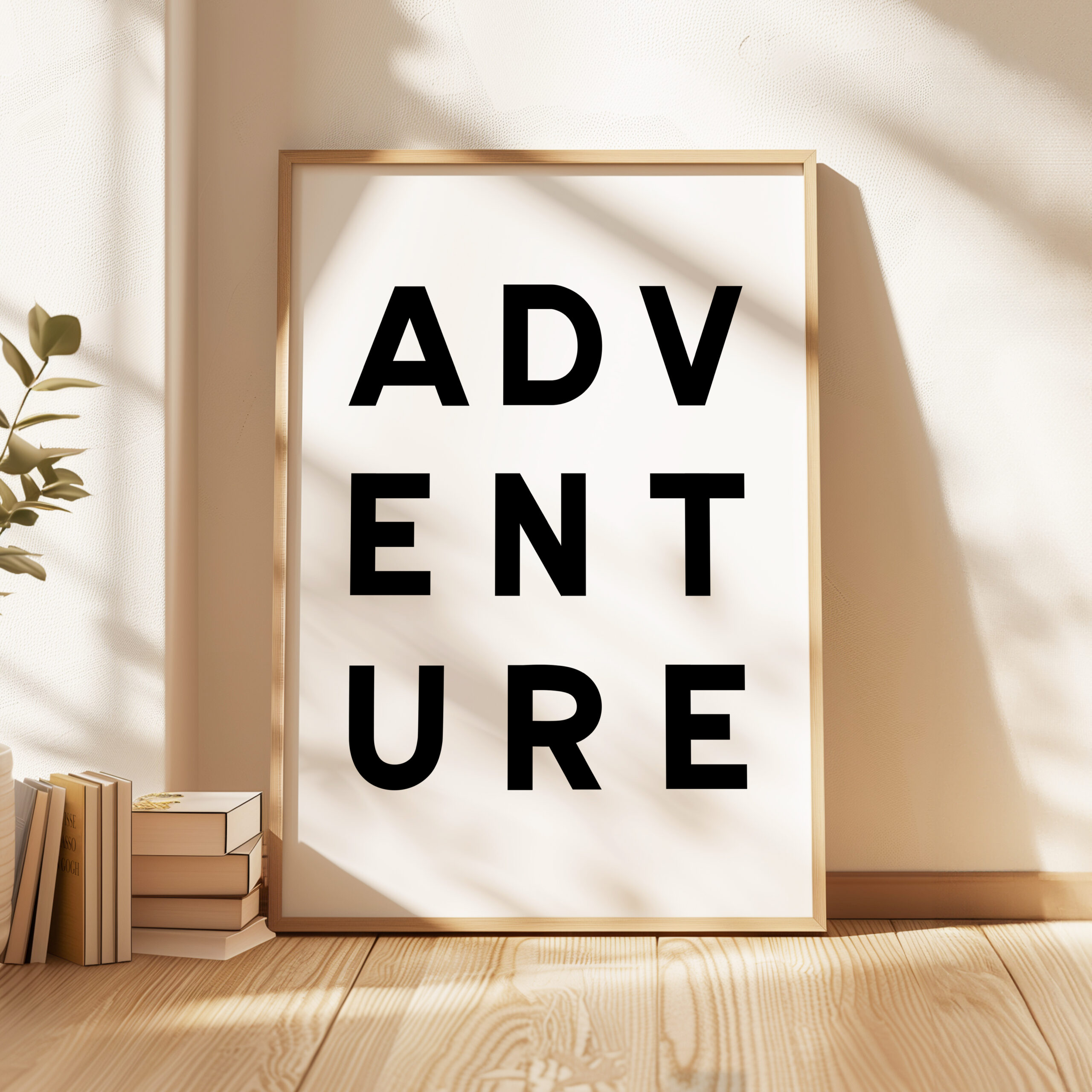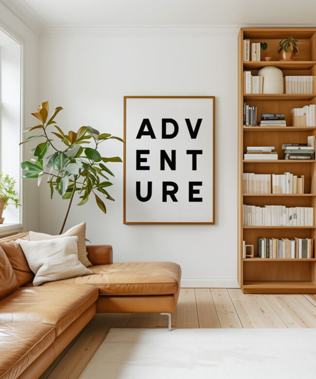 Make a statement with this modern typography art print showcasing the word “ADVENTURE” in bold, structured lettering. The unique vertical arrangement creates a strong focal point, making it ideal for minimalist home decor and gallery walls.