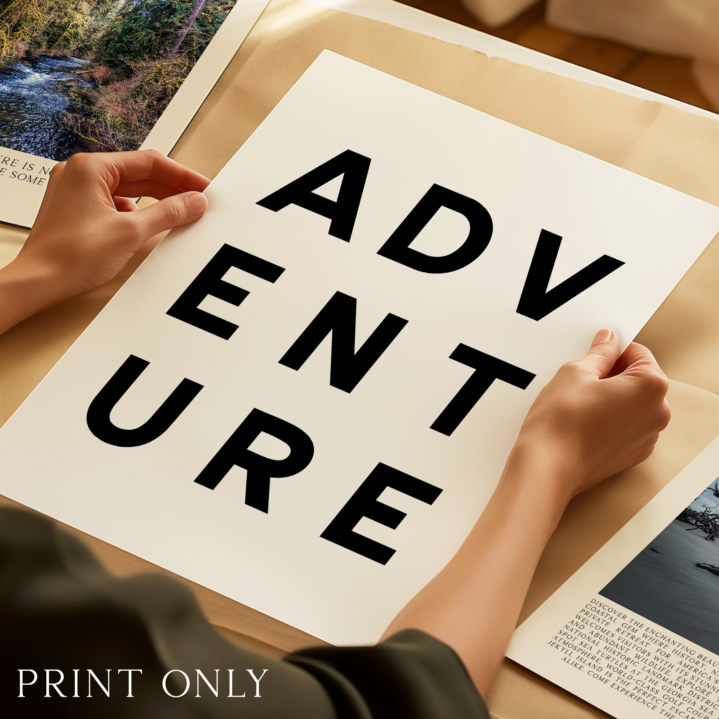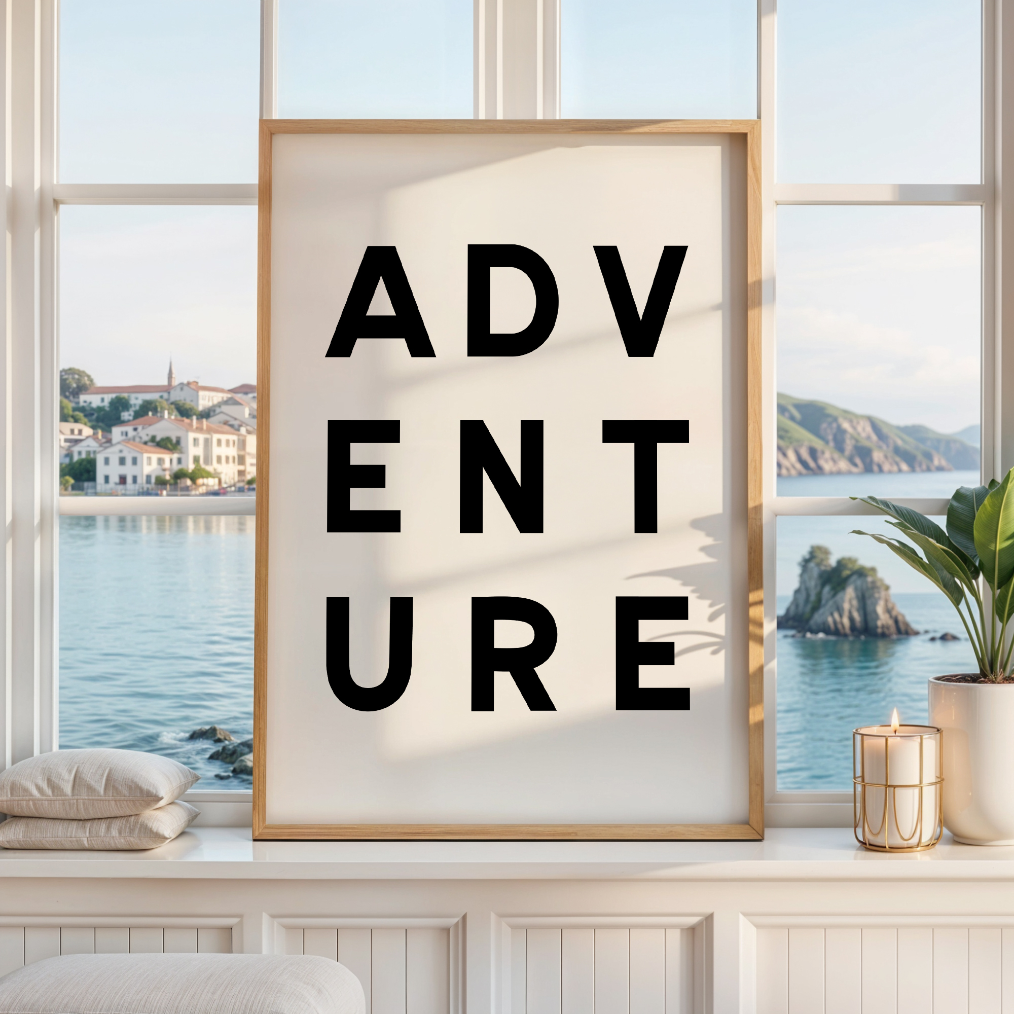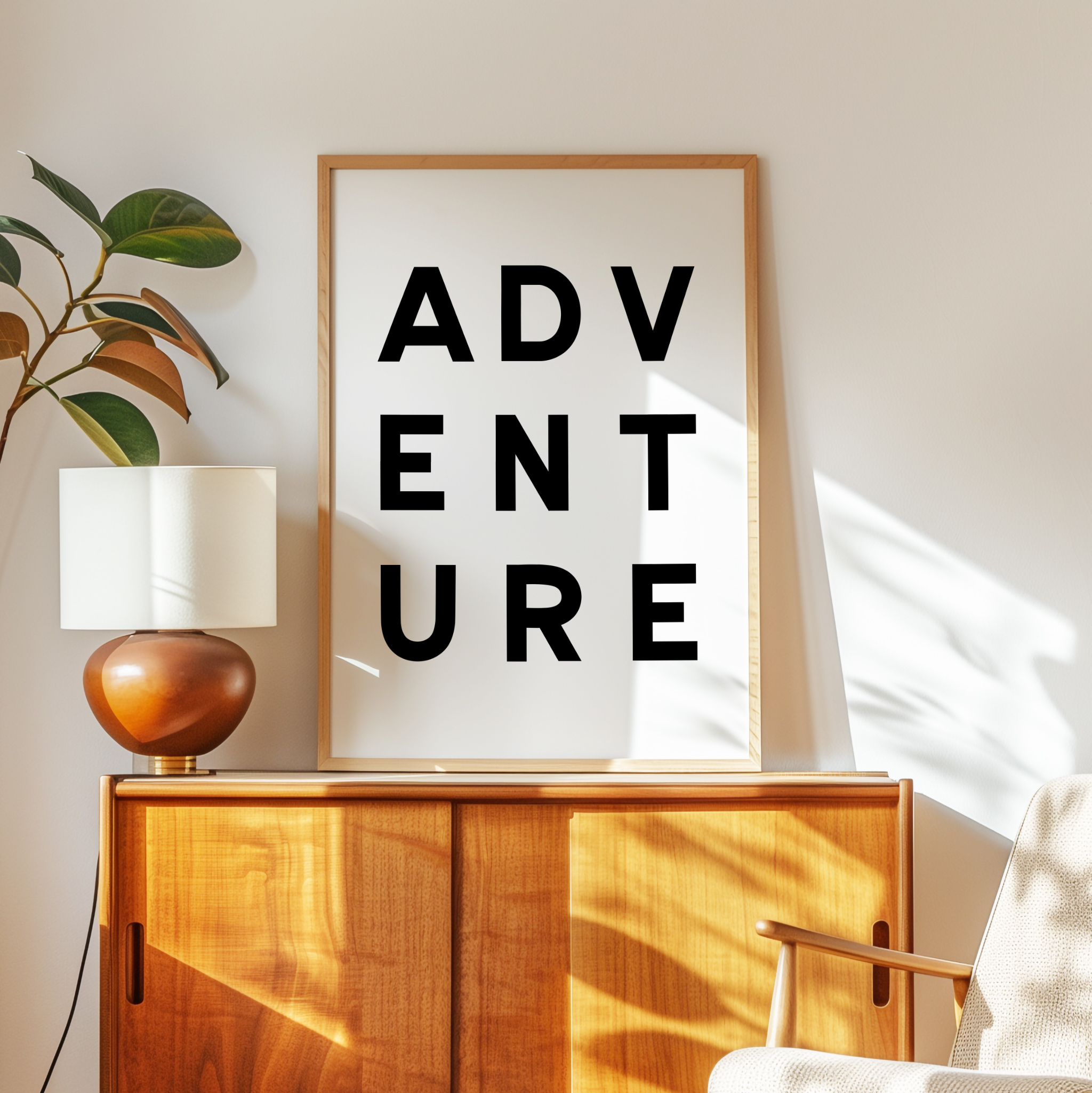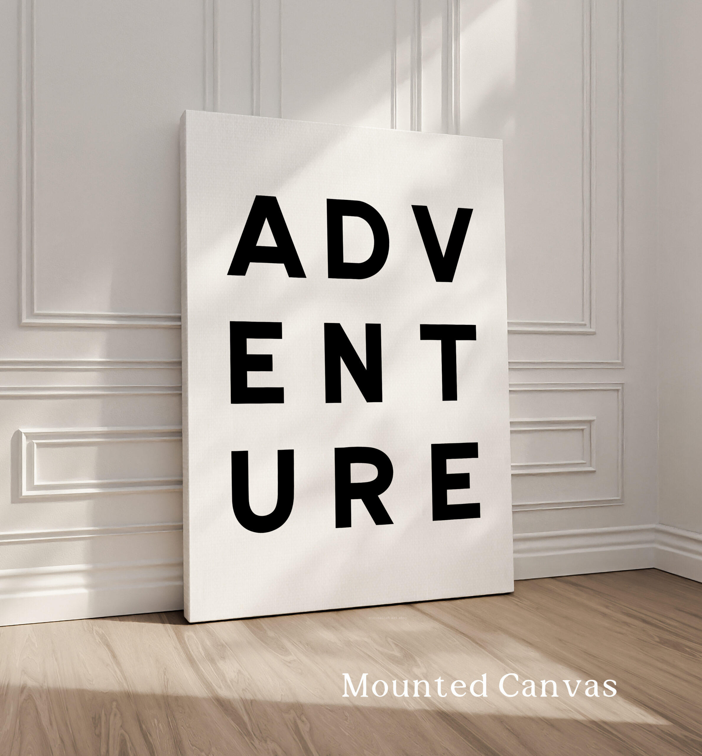 Make a statement with this modern typography art print showcasing the word “ADVENTURE” in bold, structured lettering. The unique vertical arrangement creates a strong focal point, making it ideal for minimalist home decor and gallery walls.