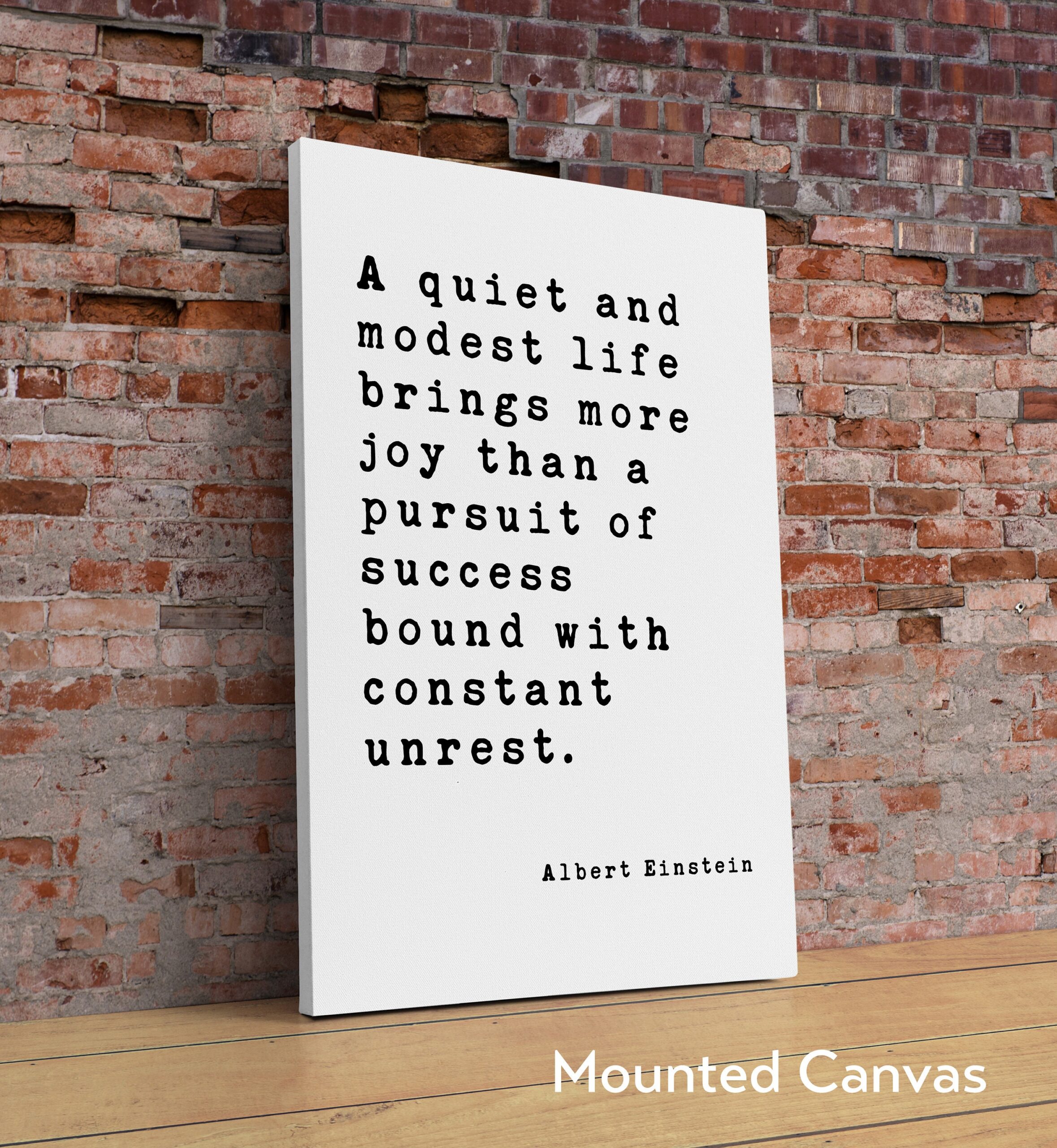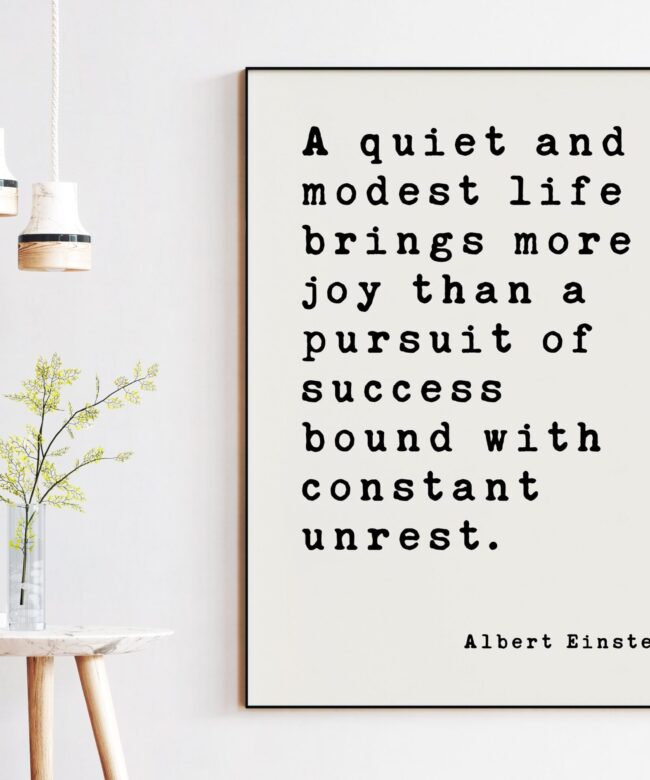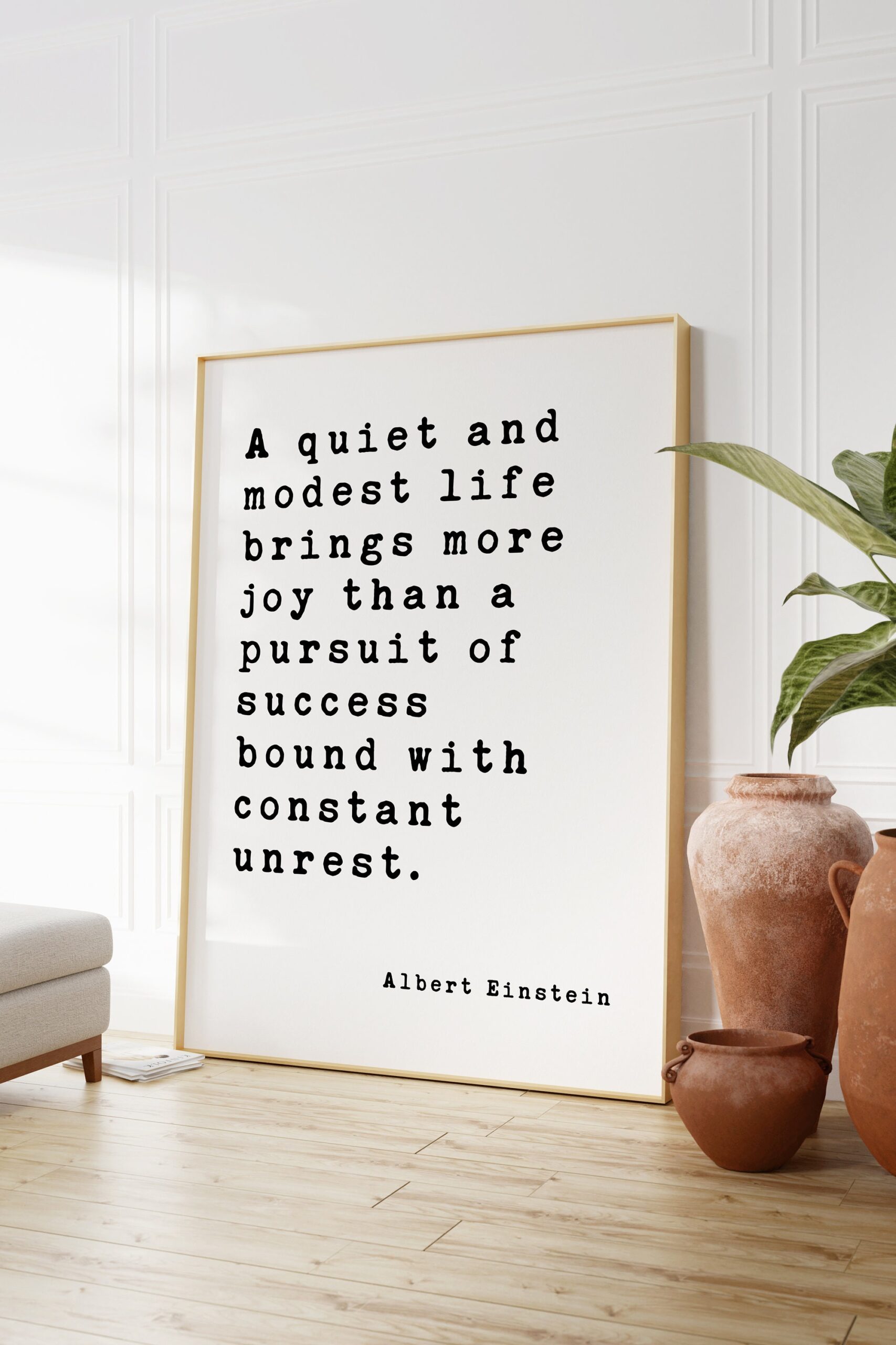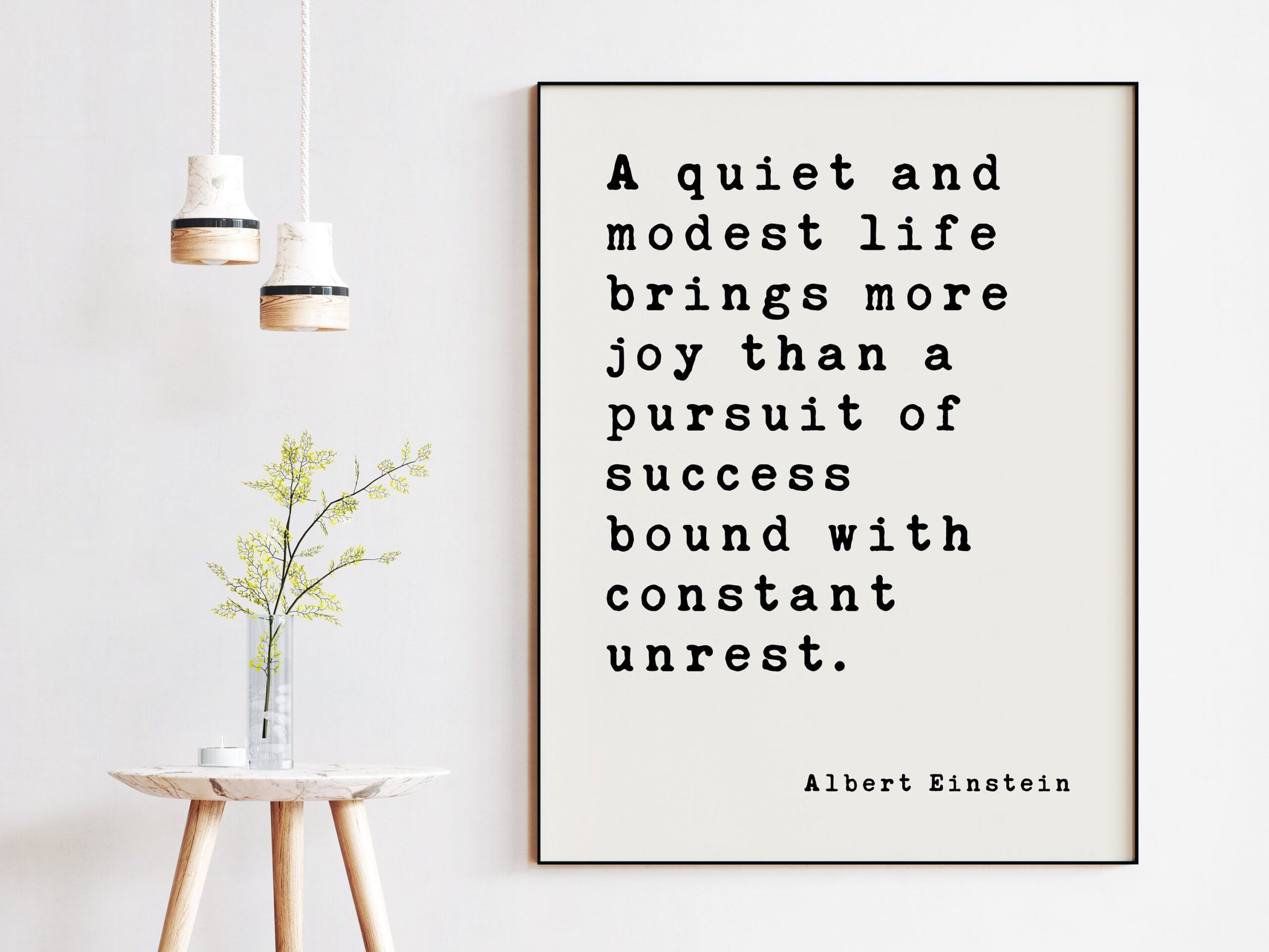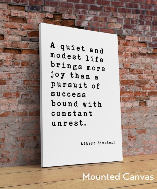Einstein’s brilliance transcends science and touches the essence of a fulfilled life. Our Typography Art Print showcases his profound words: “A quiet and modest life brings more joy than a pursuit of success bound with constant unrest.” This quote reminds us that true happiness can be found in simplicity and contentment.
