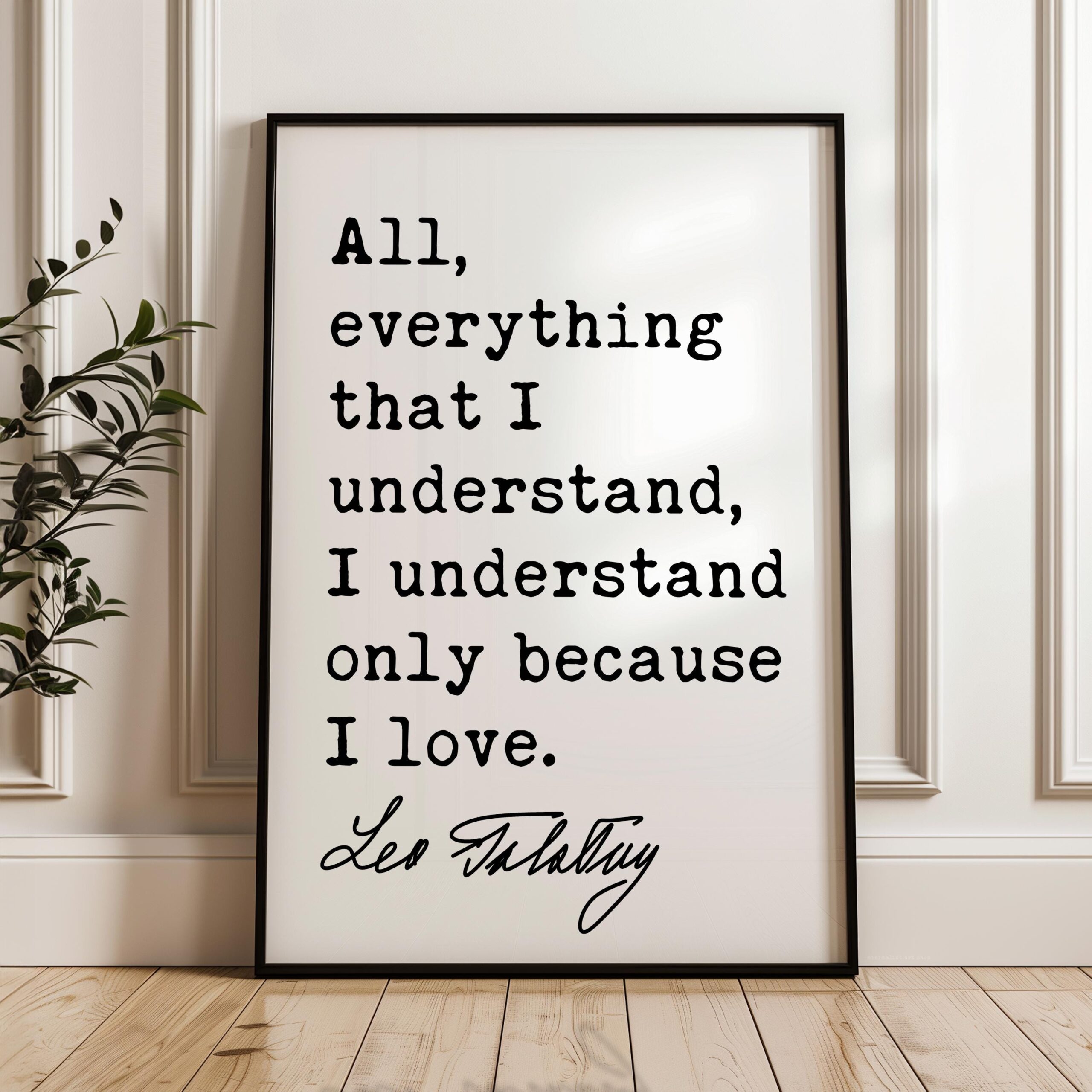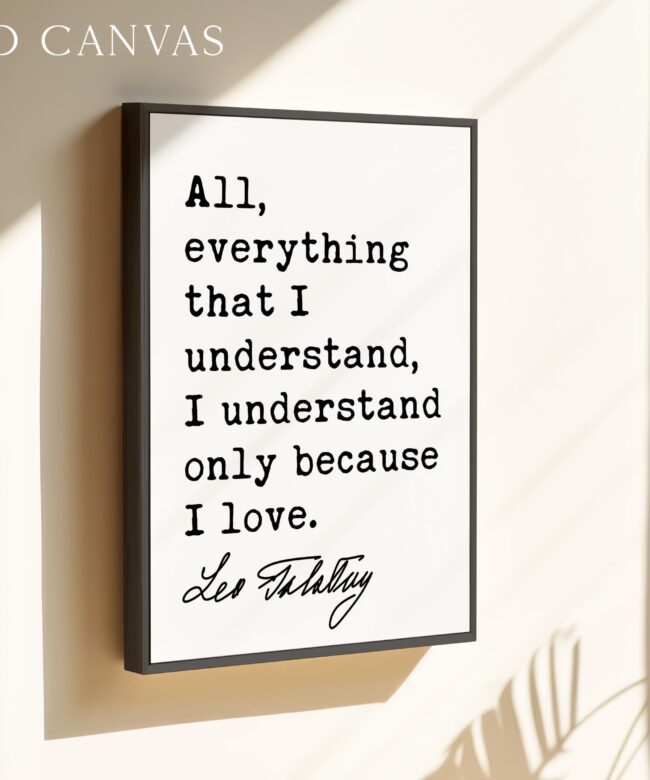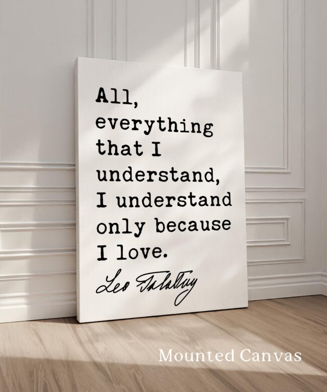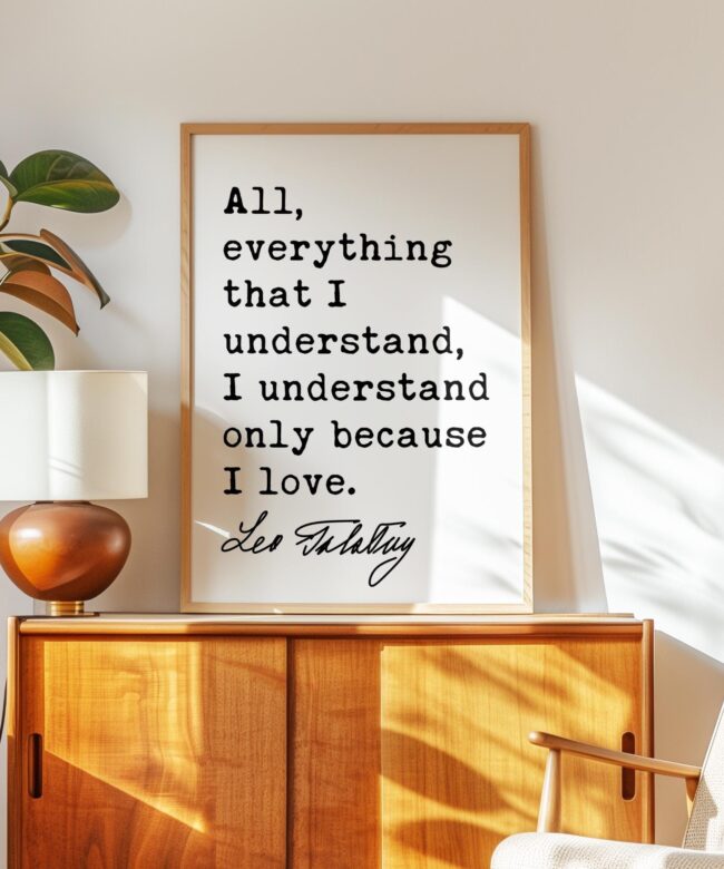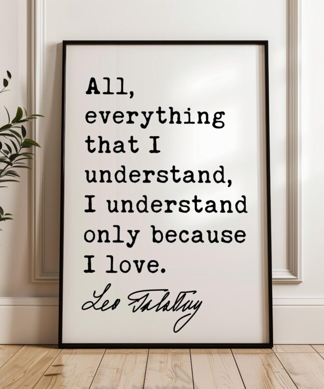 Bring Tolstoy’s enduring wisdom into your home with this minimalist wall art print. “All, everything that I understand, I understand only because I love.” is a profound reminder of the role love plays in shaping our lives. A thoughtful and romantic gift for loved ones, this piece is ideal for celebrating life’s meaningful moments.