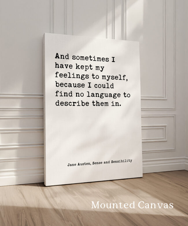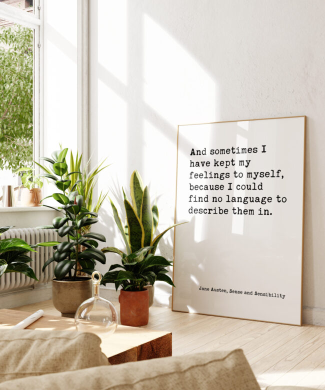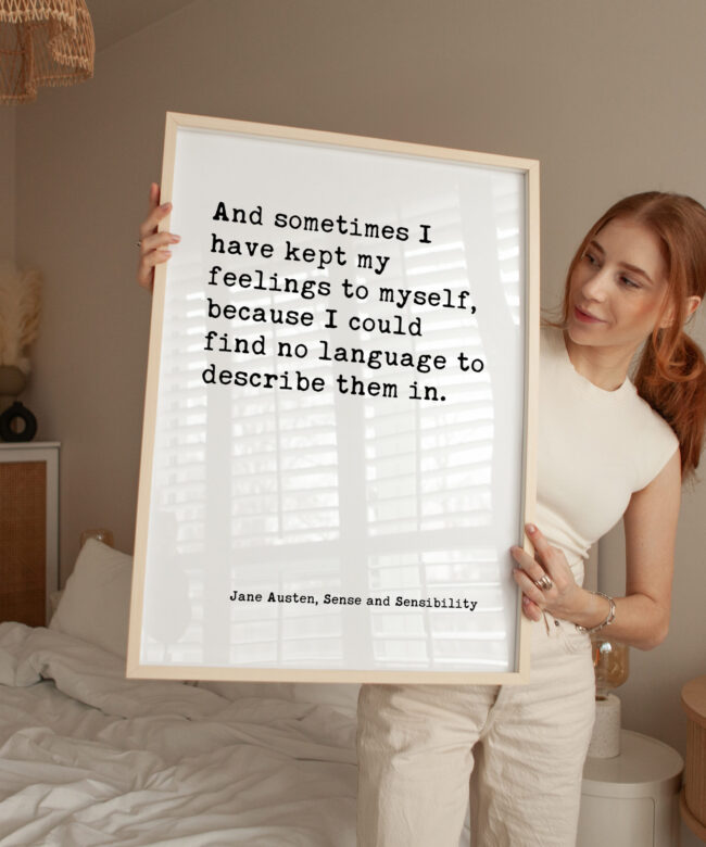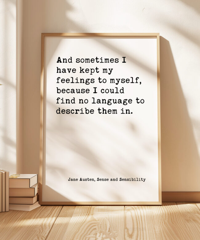 Capture the quiet strength of unspoken feelings with this beautiful typography art print. Featuring a heartfelt quote by Jane Austen, “And sometimes I have kept my feelings to myself, because I could find no language to describe them in,” this piece offers a relatable message for anyone who’s ever struggled to express their emotions.