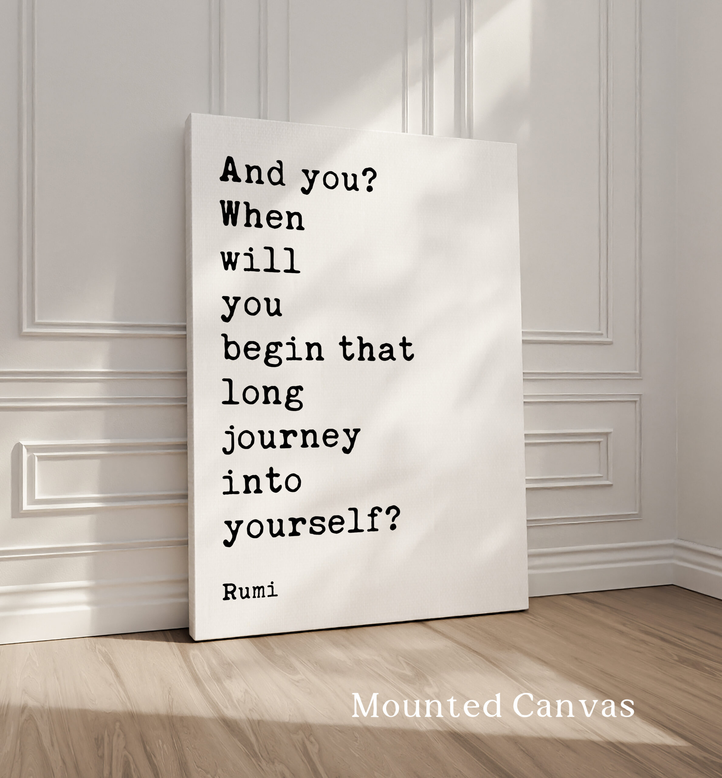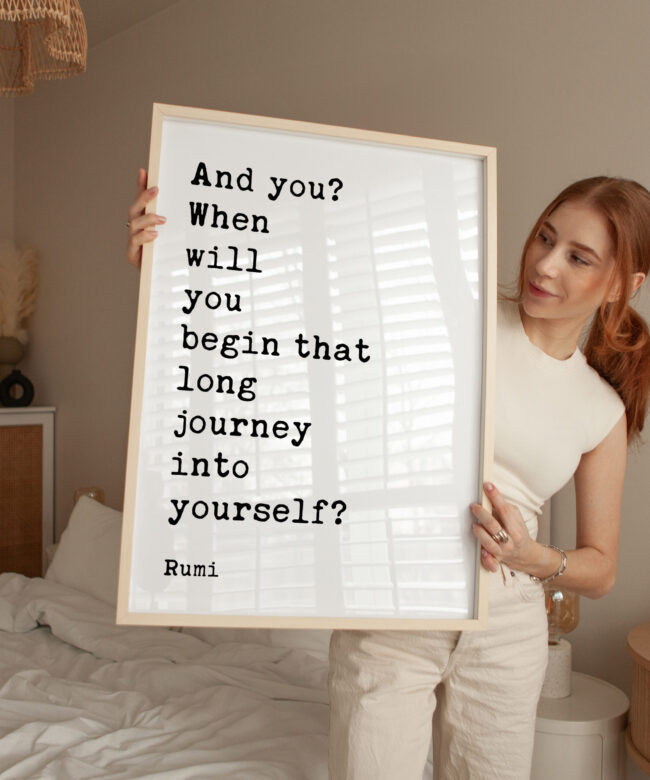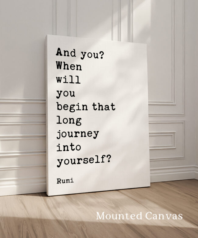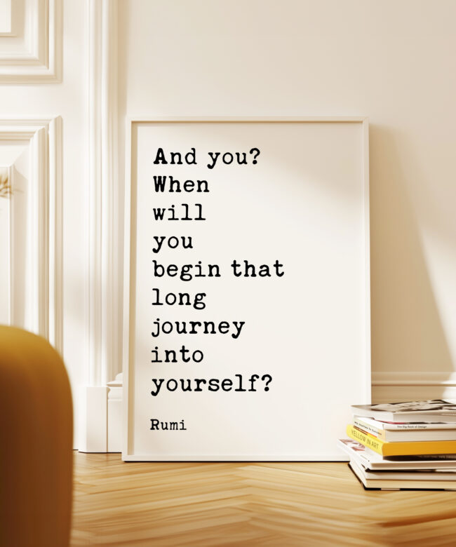 This thought-provoking typography art print features a powerful quote from Rumi: “And you? When will you begin that long journey into yourself?” A call for introspection, this print serves as a reminder to embark on the meaningful journey of self-discovery. Perfect for adding depth and inspiration to any space, this piece encourages a closer look at the inner workings of the soul.