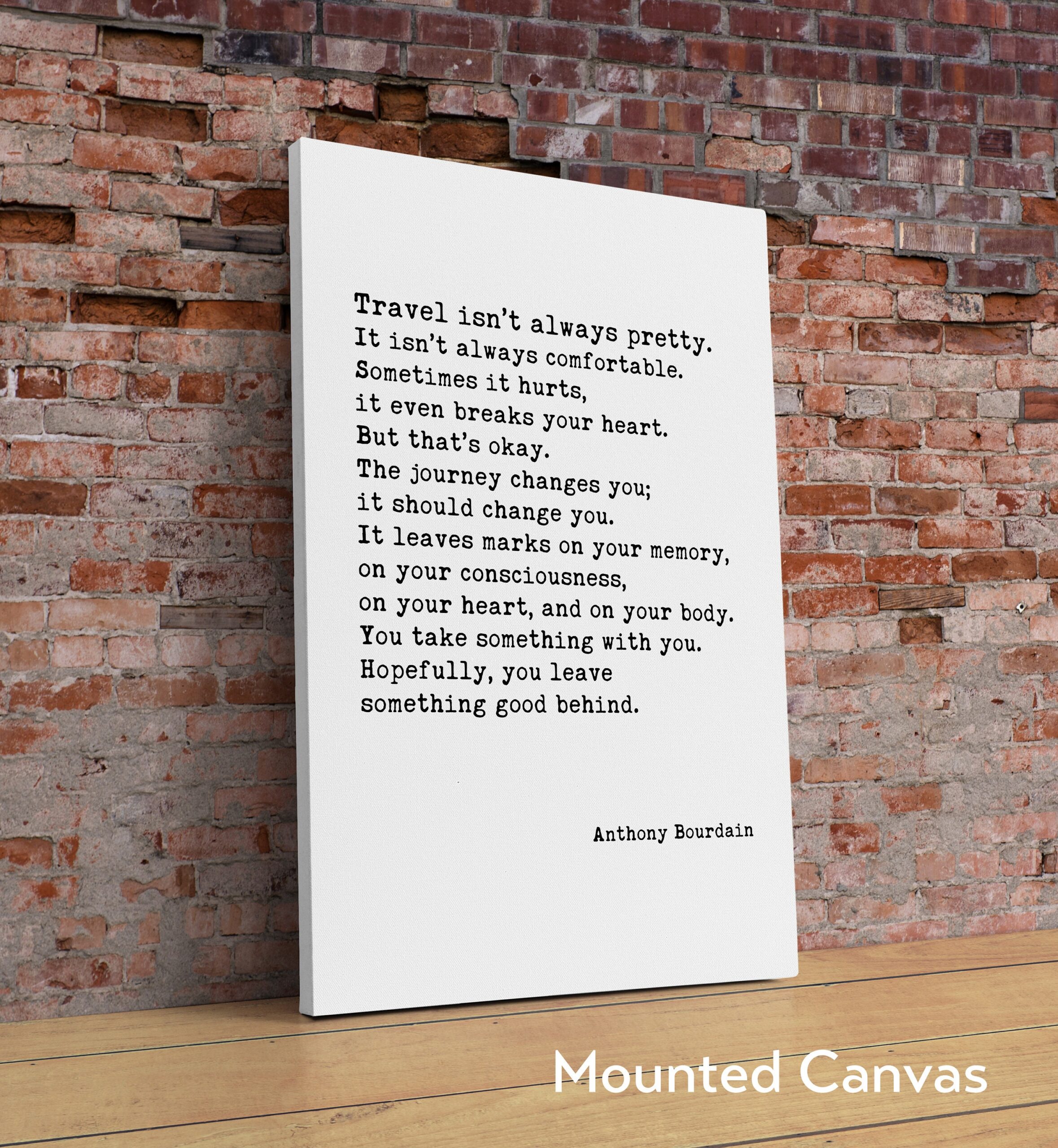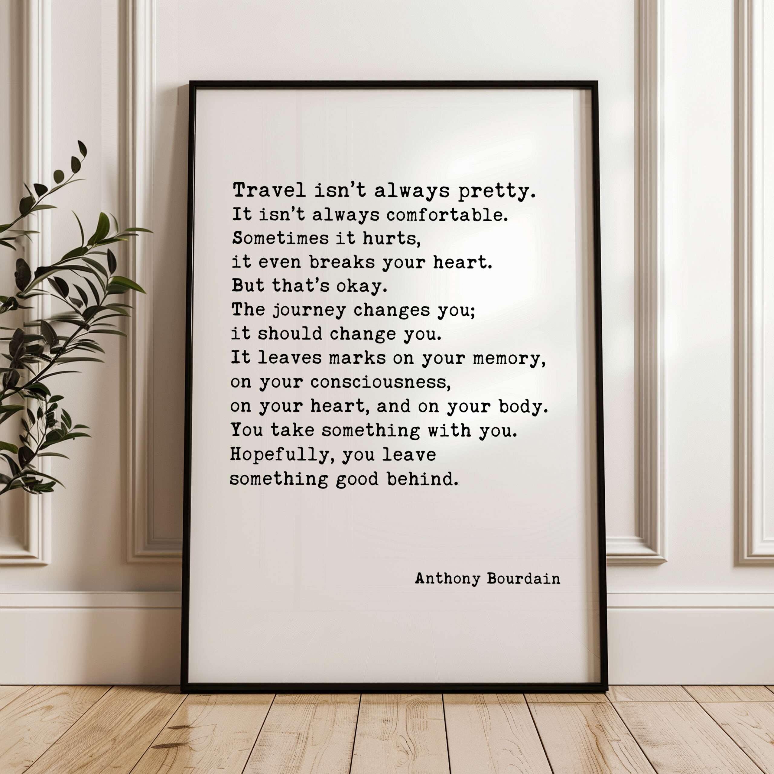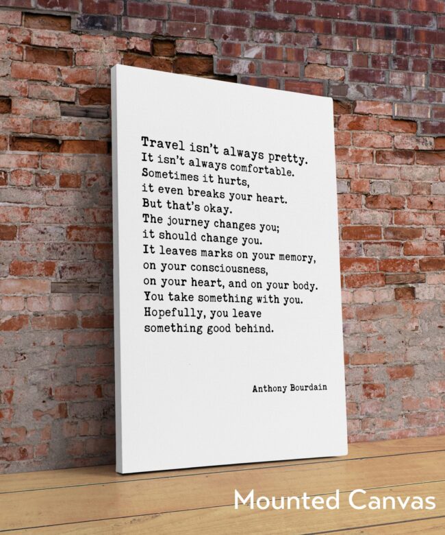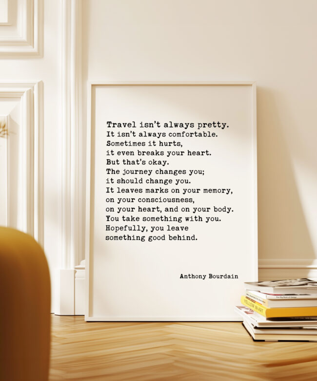 Embrace the transformative power of travel with our Typography Art Print featuring the poignant words of Anthony Bourdain. “Travel isn’t always pretty. It isn’t always comfortable…” captures the essence of adventure, highlighting the beauty found in both the struggles and joys of exploration. This print serves as a powerful reminder that every journey leaves its mark on us, shaping who we are. Perfect for your living room, office, or travel nook, it’s an inspiring addition for wanderers and dreamers alike.