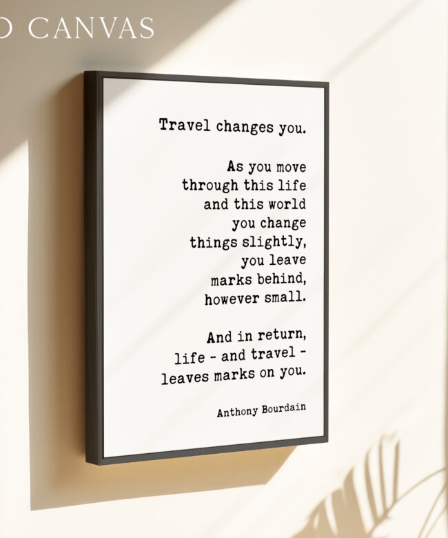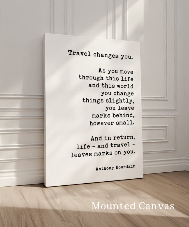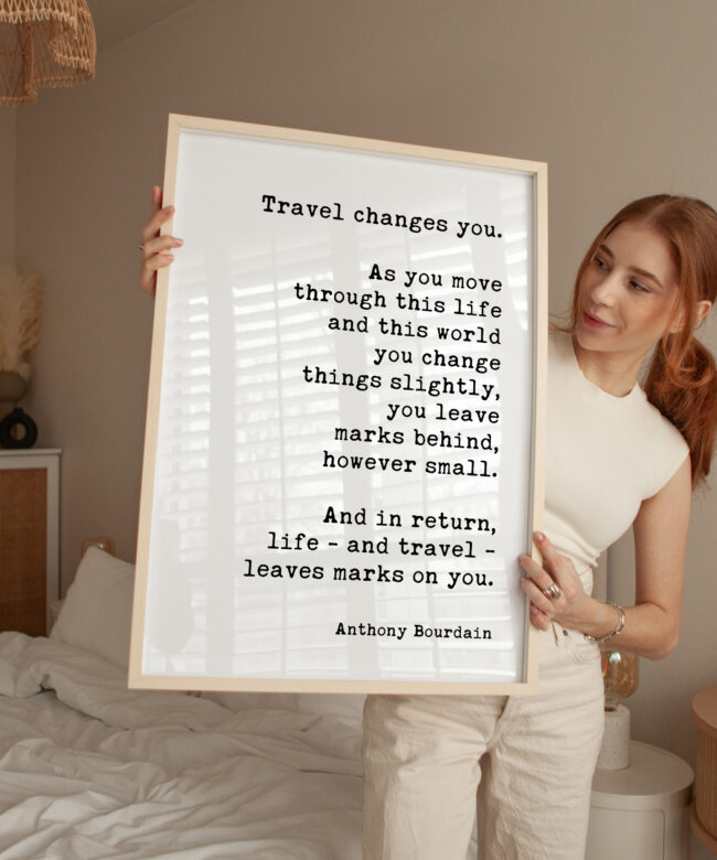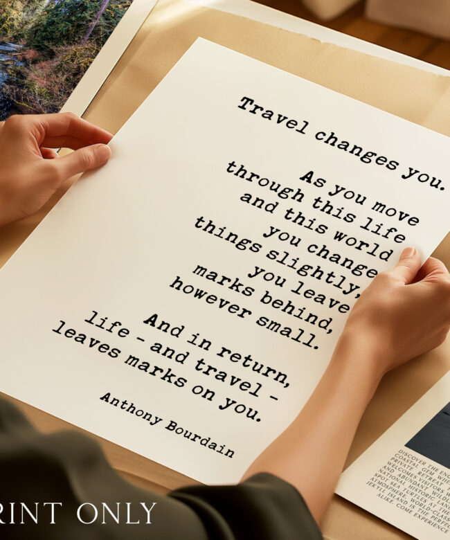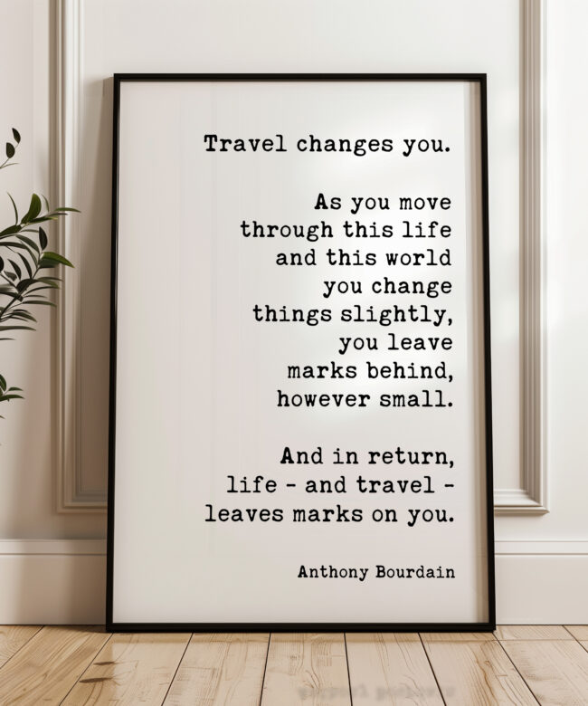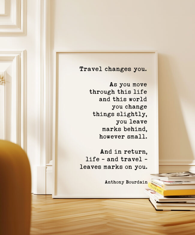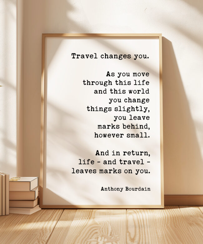 Celebrate the beauty of exploration with this minimalist typography art print featuring Anthony Bourdain’s inspiring words: “Travel changes you…” This timeless piece captures the transformative power of travel and the marks we leave—and receive—along the way.