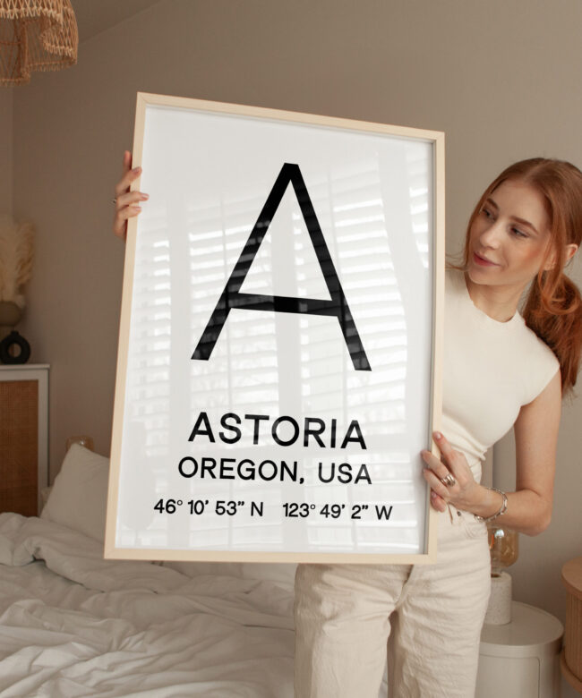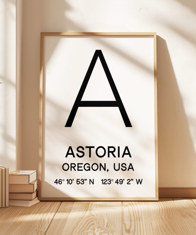 Immerse yourself in the rich history and coastal charm of Astoria, Oregon with this captivating typography art print, a tribute to this captivating city.