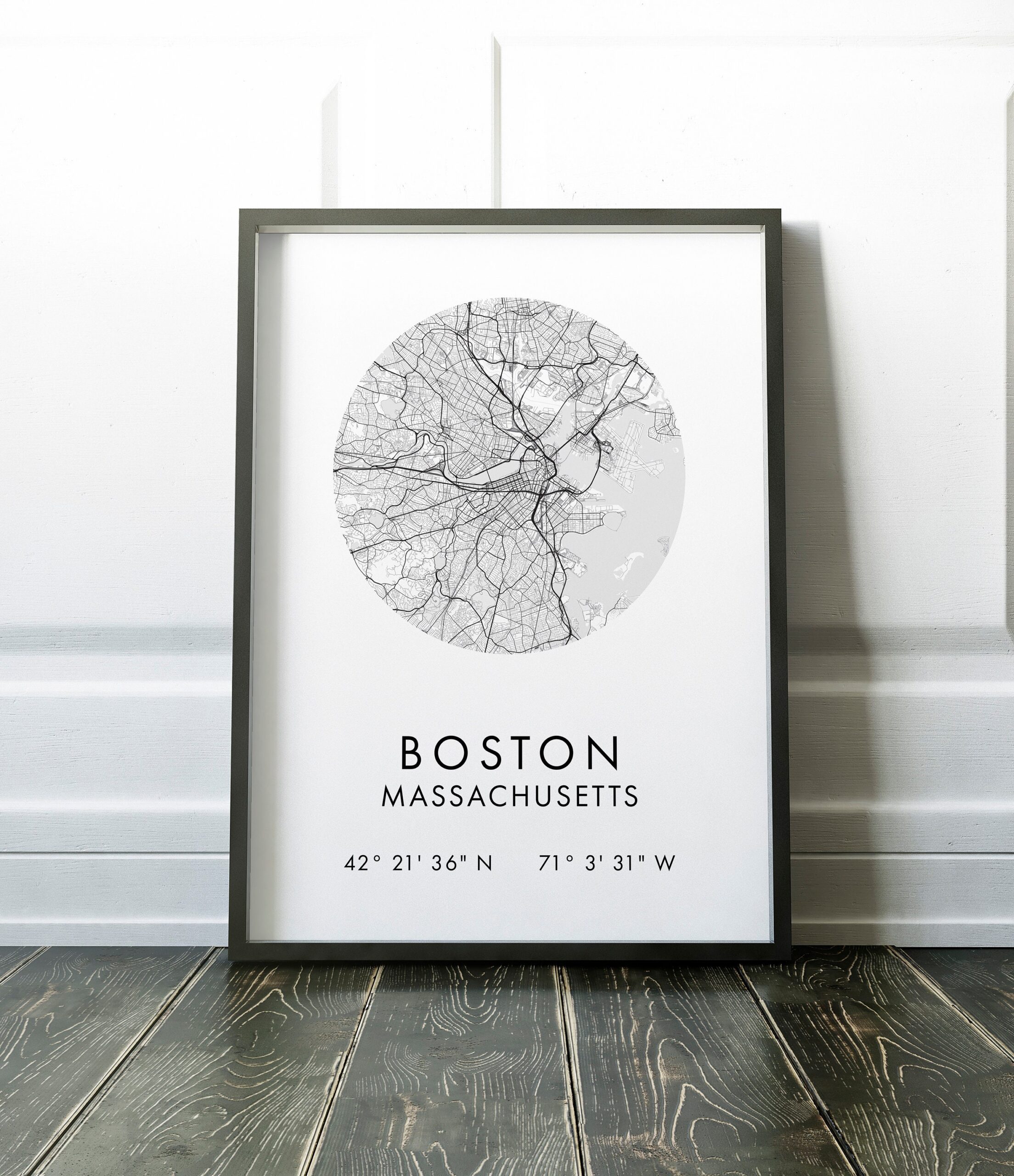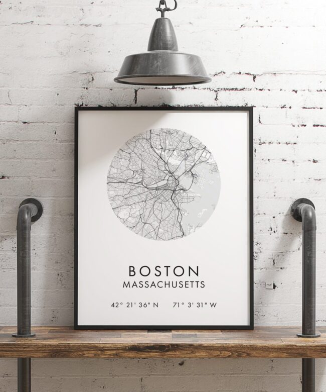 Boston Massachusetts City Street Map with GPS Coordinates Art Print – Office – Home Decor – Restaurant – Apartment – Condo – Typography