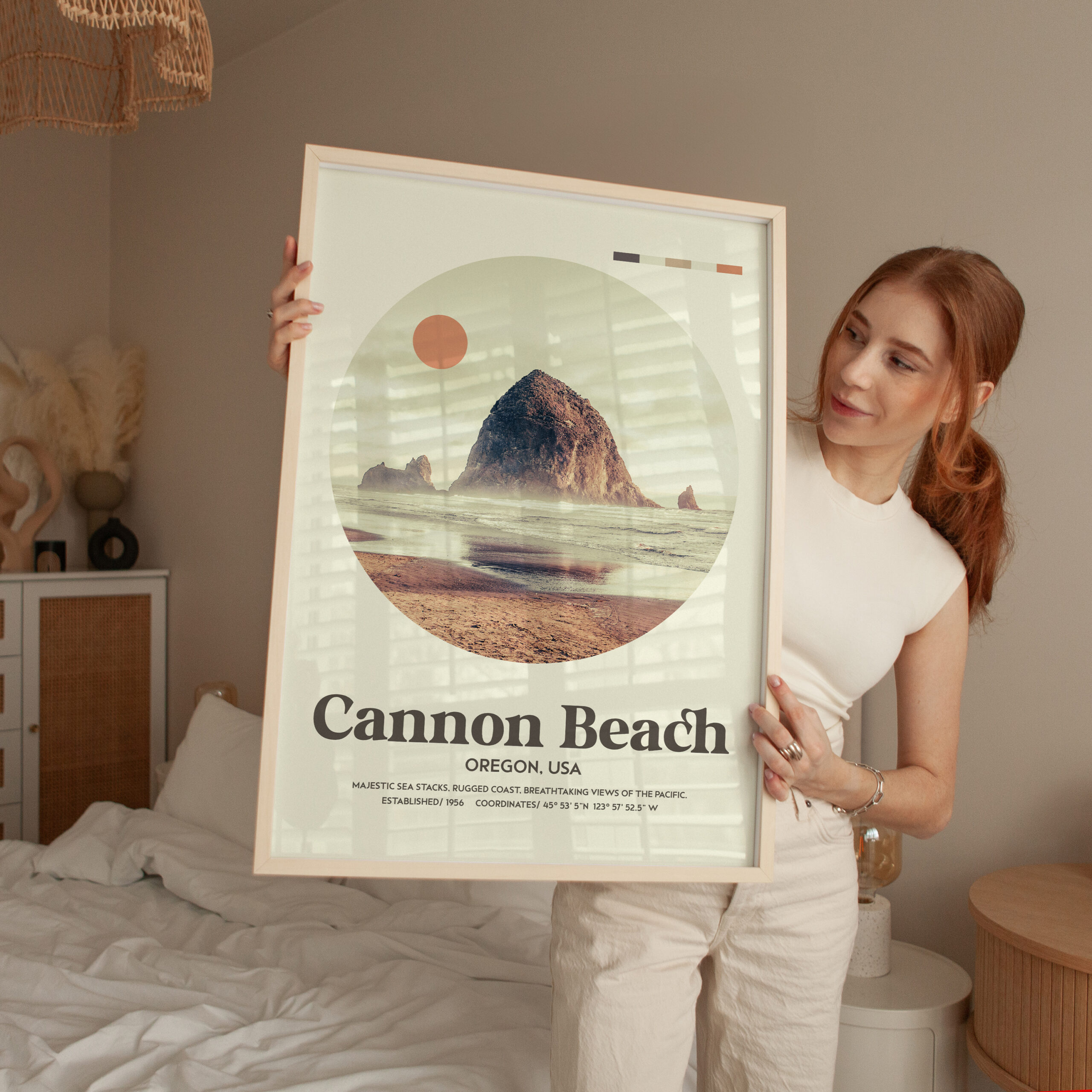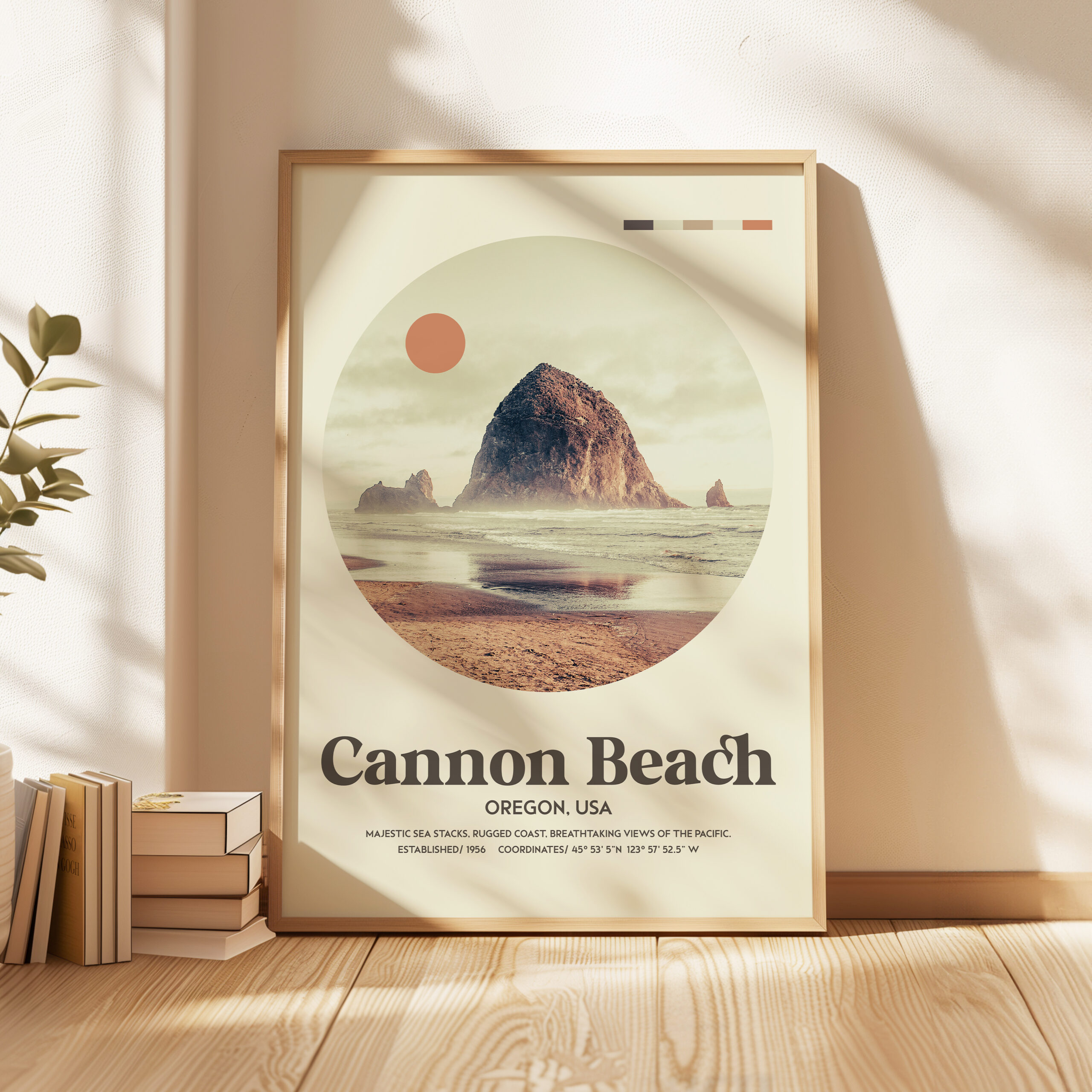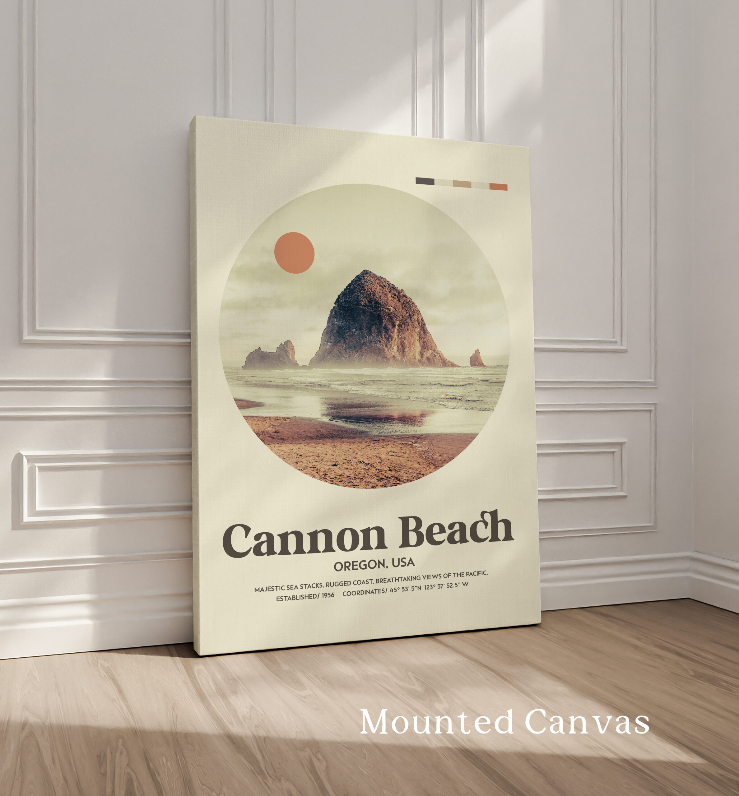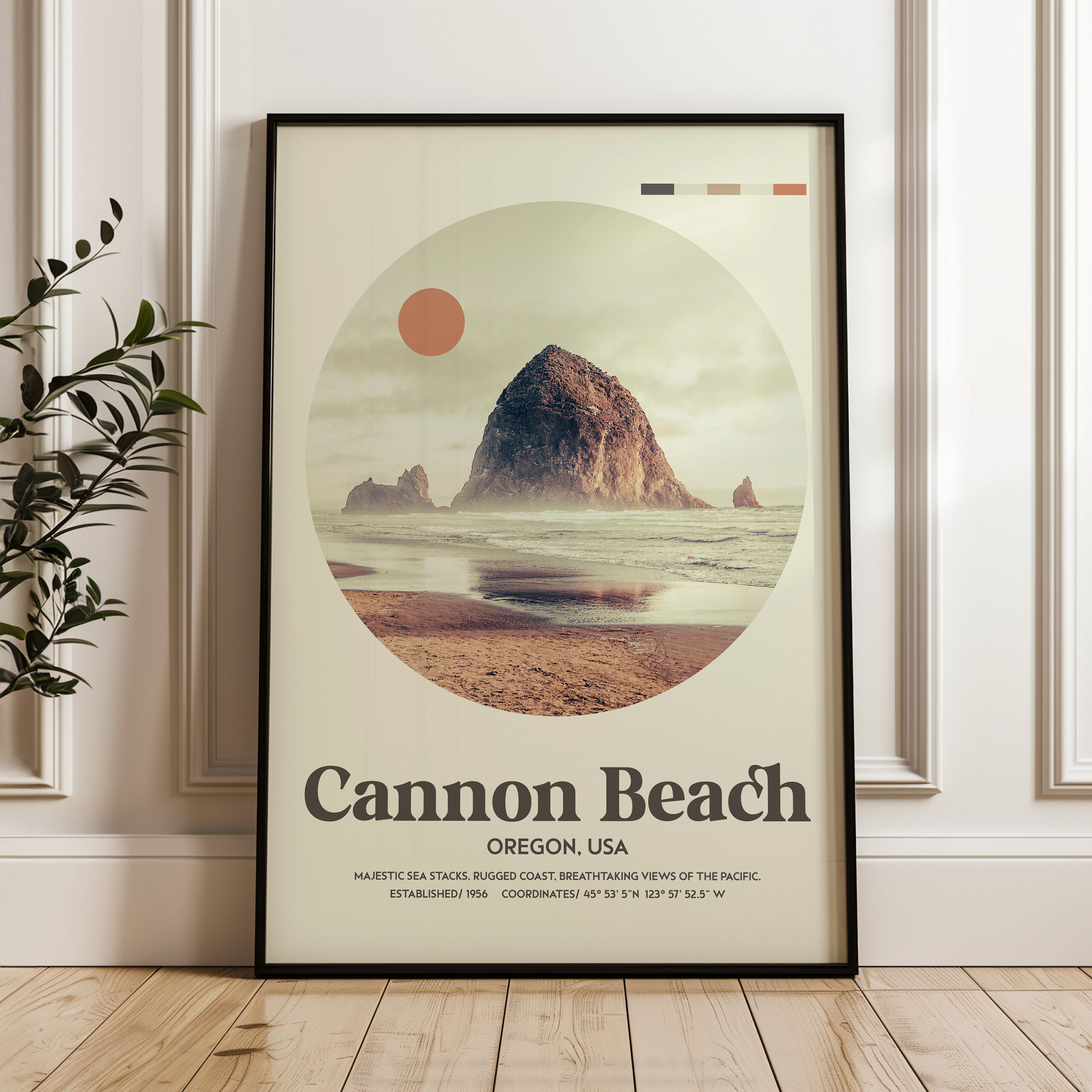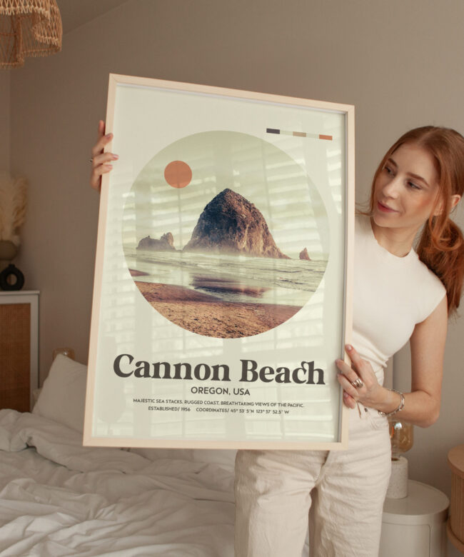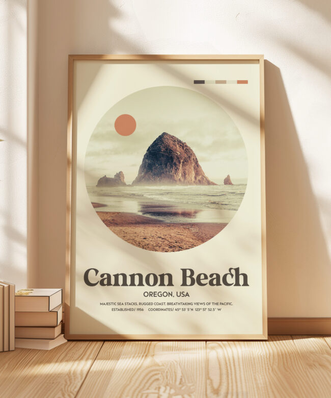 Bring the majestic beauty of Cannon Beach into your home with this mid-century inspired typography art print. Featuring a serene, circular photograph of Cannon Beach’s iconic Haystack Rock, this piece captures the rugged Pacific coastline in all its splendor. With coordinates marking the exact location, this stunning artwork transports you to the breathtaking views of Oregon’s coast, with a modern, minimalistic twist. Perfect for those who appreciate the charm of vintage design and the natural beauty of the Pacific Northwest.