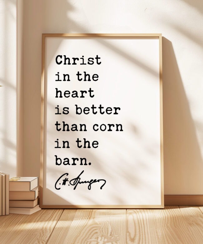 Find solace and inspiration with this meaningful typography art print featuring the profound words of Charles Spurgeon, “Christ in the heart is better than corn in the barn.”