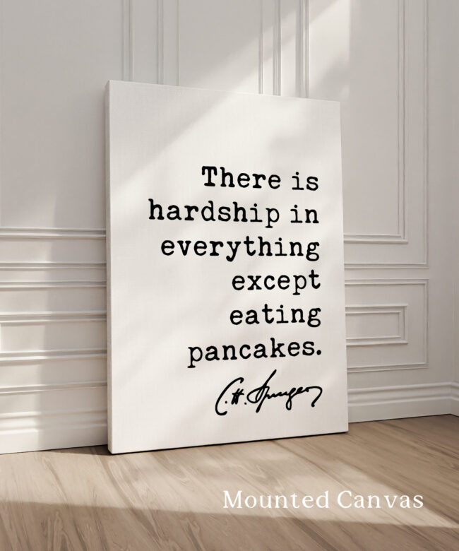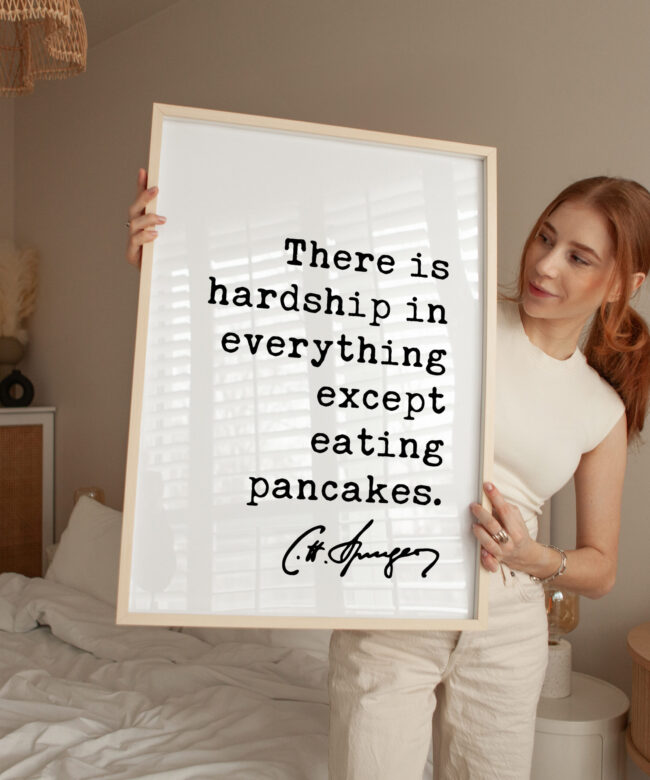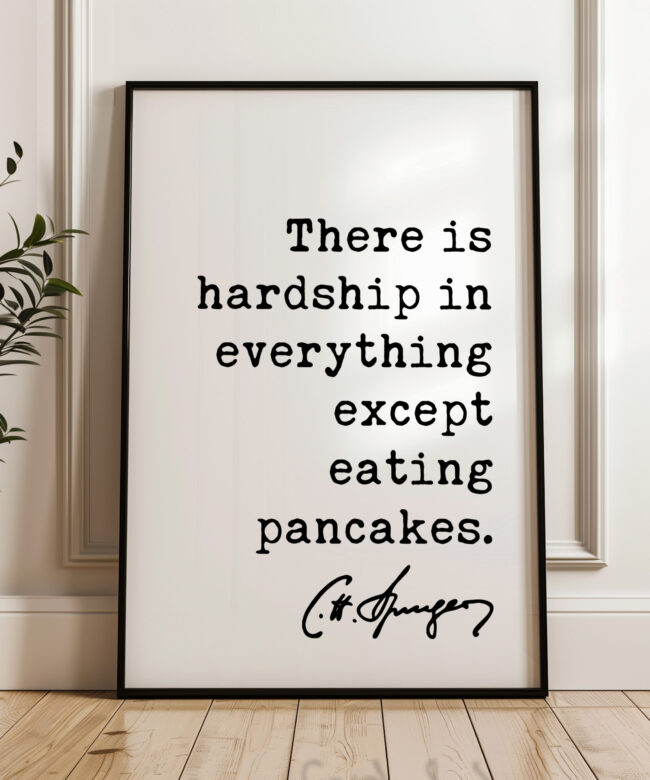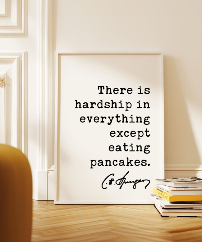 “There is hardship in everything except eating pancakes.” This charming print by C.H. Spurgeon brings a smile and a dose of truth to your kitchen, breakfast nook, or brunch station. A cheeky nod to life’s struggles—with a fluffy, syrupy exception.