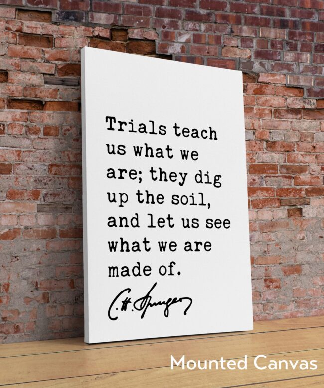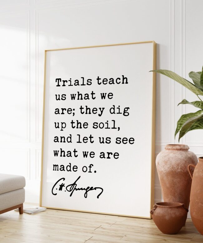 Charles Spurgeon Quote – Trials teach us what we are; they dig up the soil, and let us see what we are made of. Art Print – Christian Faith