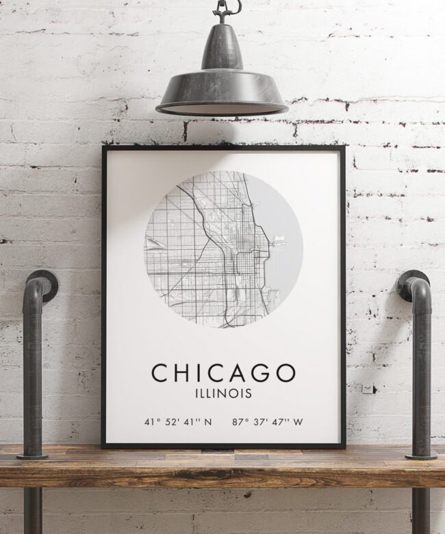 Chicago, Illinois City Street Map with GPS Coordinates Art Print – Office – Home Decor – Restaurant – Apartment – Condo – Typography
