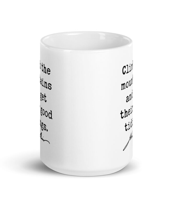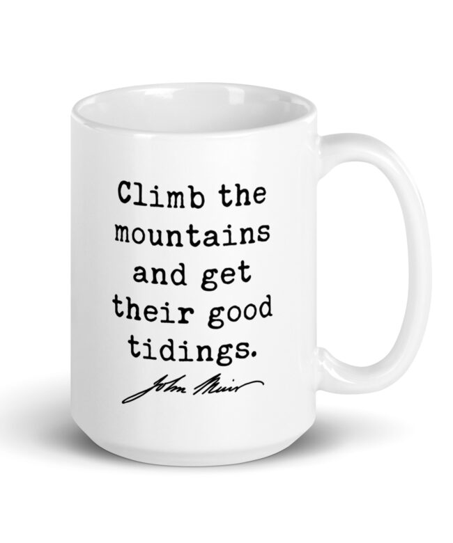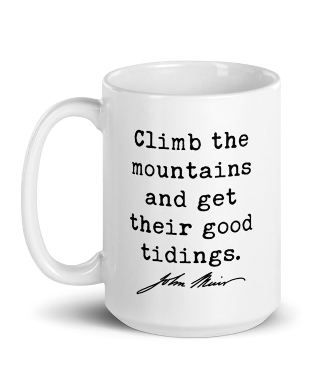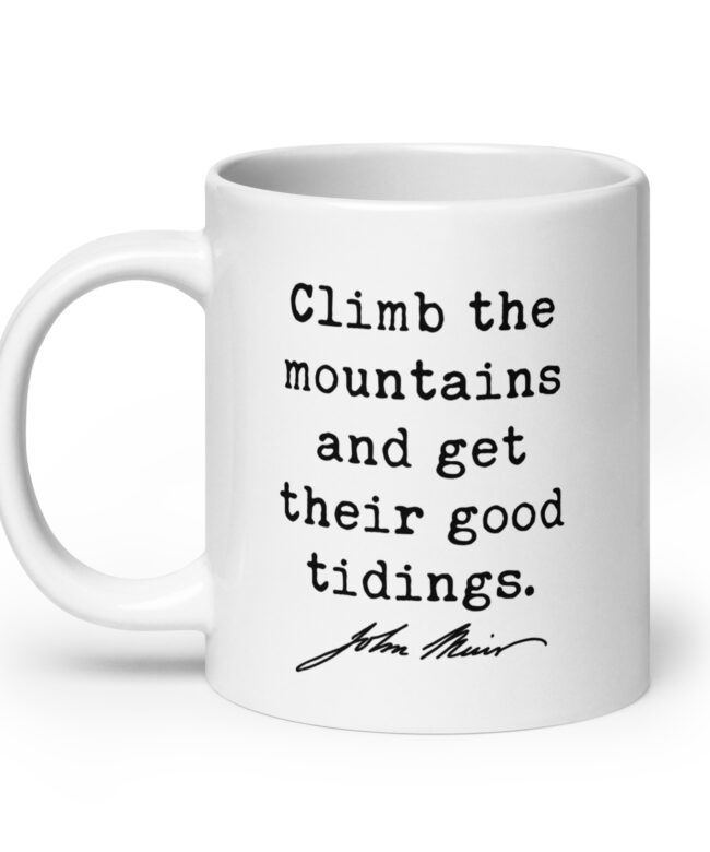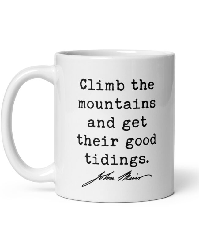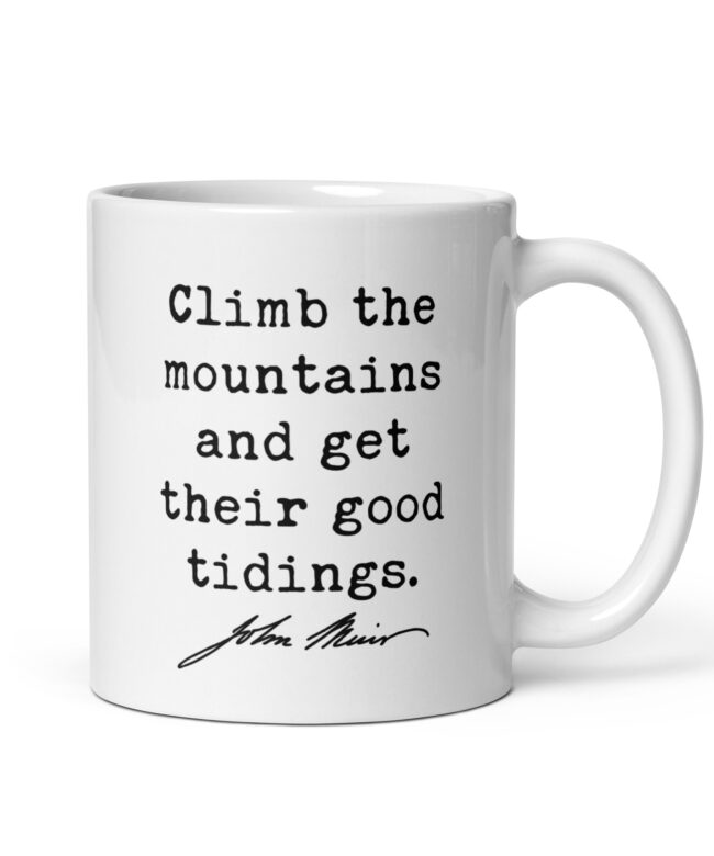 Fuel your love for the wild with this inspiring John Muir quote: “Climb the mountains and get their good tidings.” Perfect for adventurers, hikers, and nature lovers, this ceramic coffee mug serves as a daily reminder to seek peace and perspective in the great outdoors. Available in 11oz, 15oz, and 20oz sizes, it’s ideal for sipping your favorite beverage while dreaming of your next mountain escape. A meaningful gift for explorers at heart!