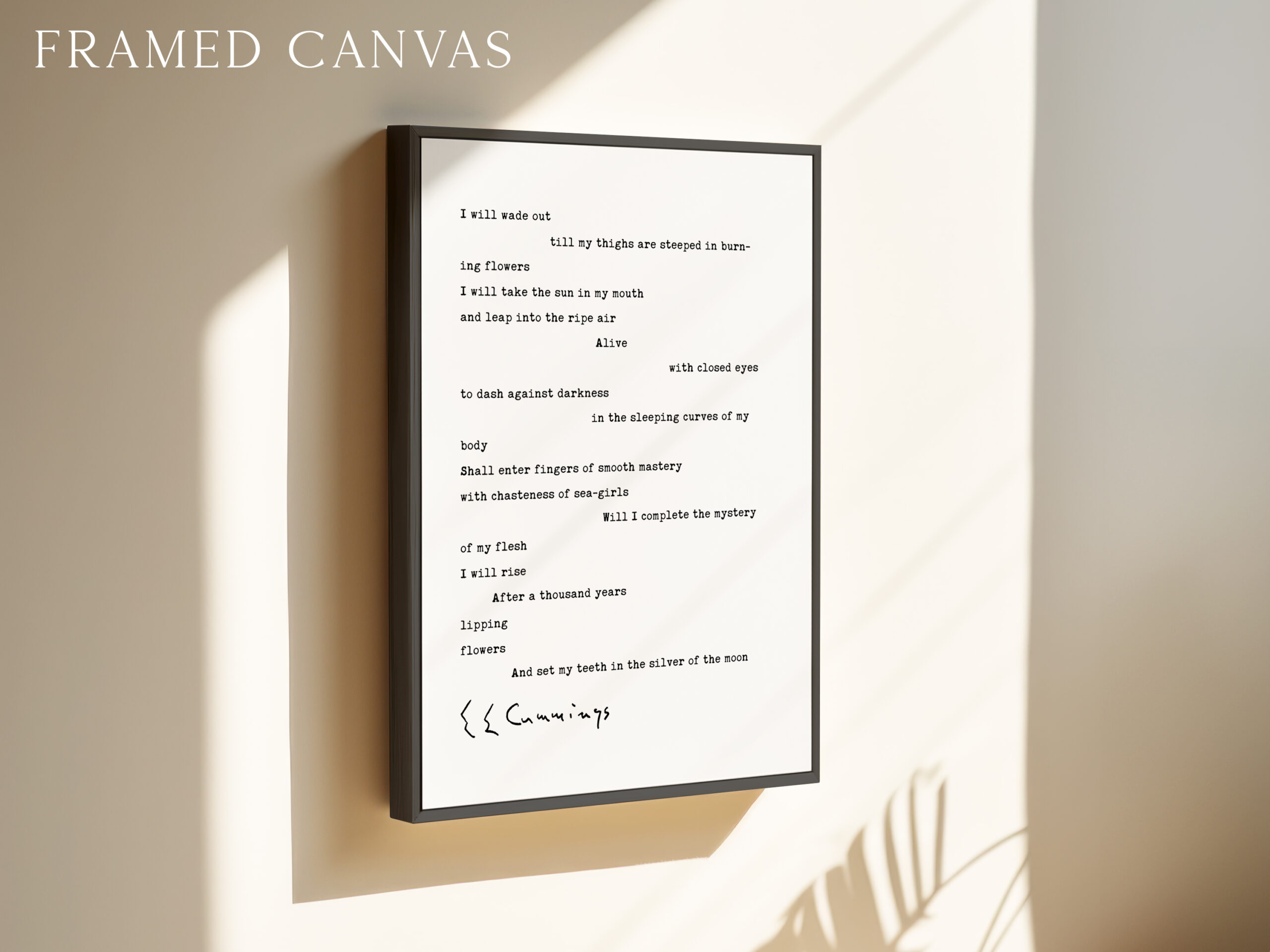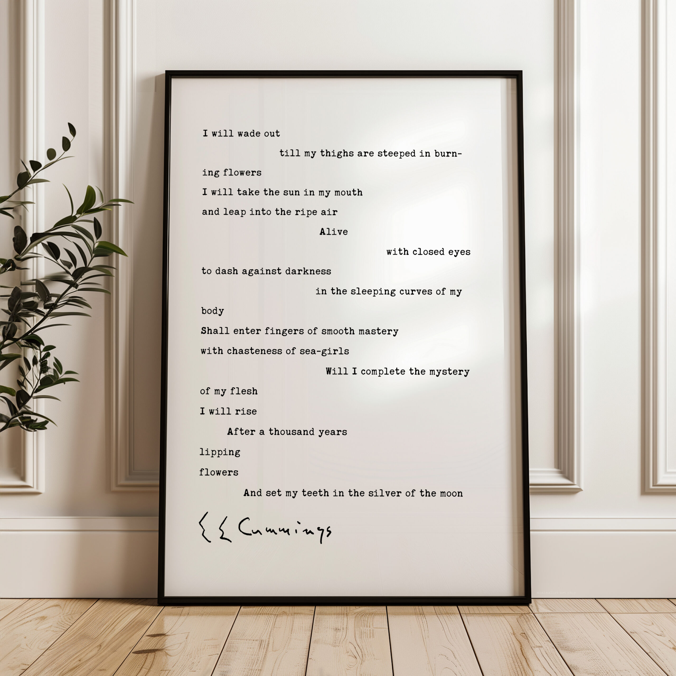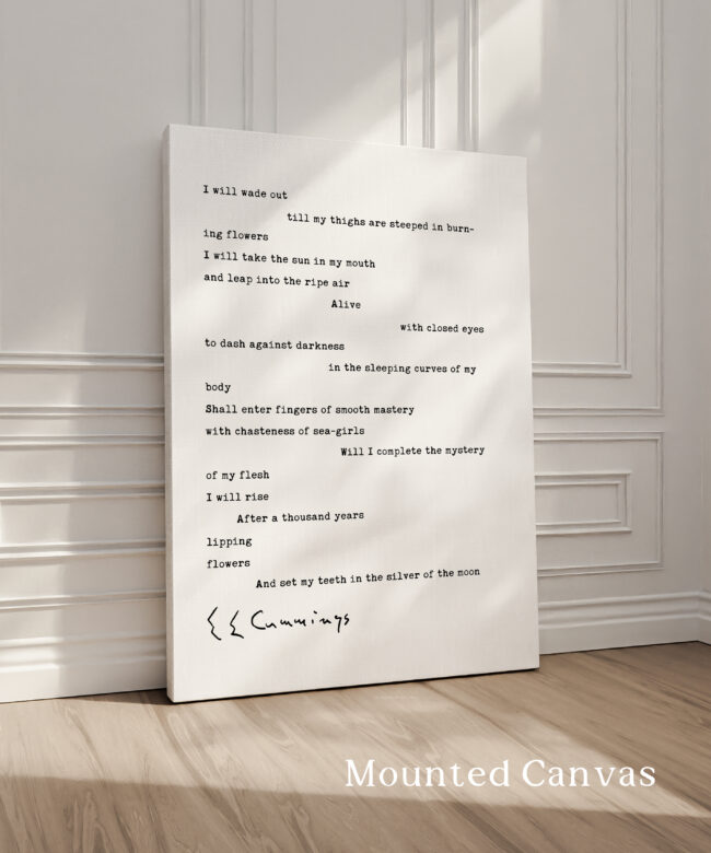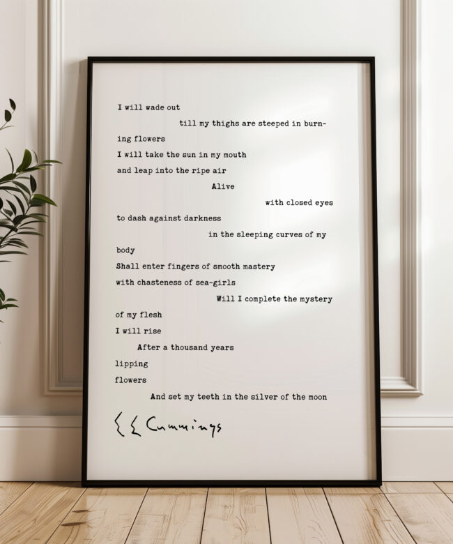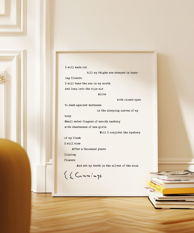 Celebrate the artistry of E. E. Cummings with this typography art print of his poem “I will wade out” (1923). Known for his experimental style and fearless imagery, Cummings invites readers into a world of intimacy and wonder. This minimalist print highlights the beauty of the words themselves, making it a centerpiece for any gallery wall or reading nook.