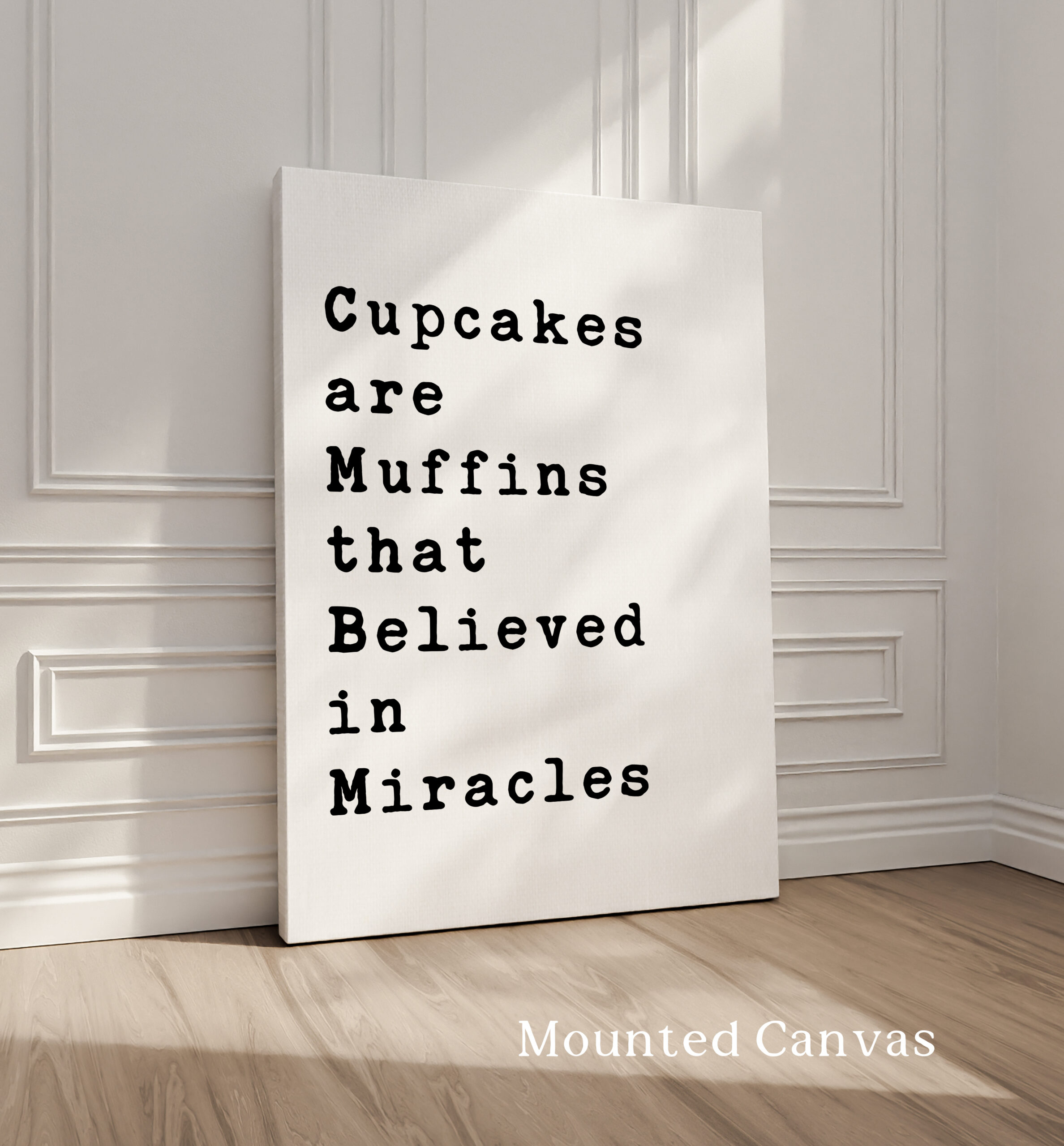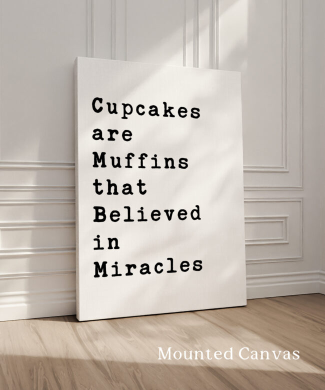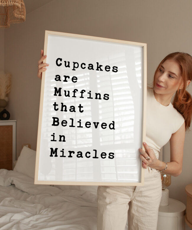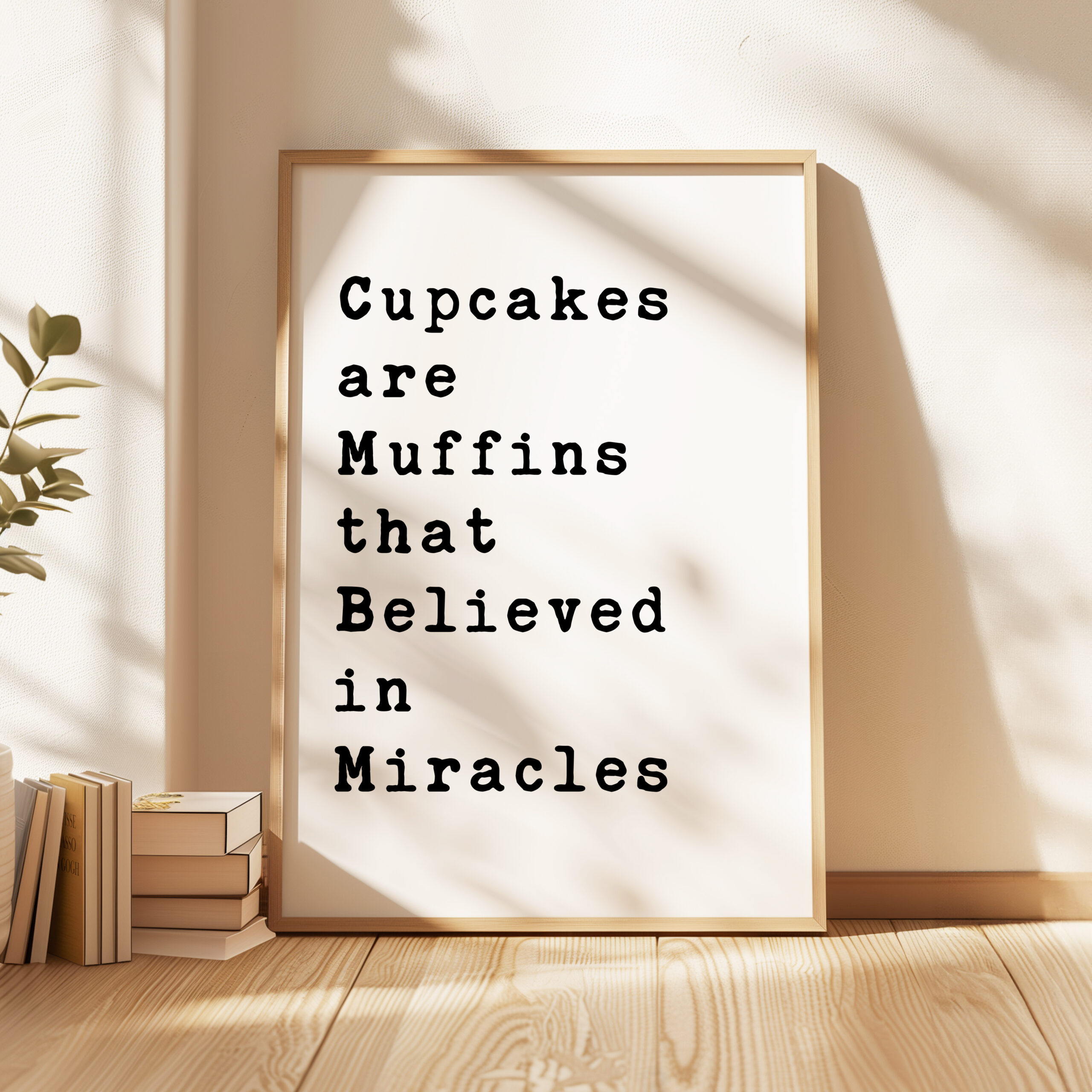 This quirky and whimsical typography art print offers a fun twist on your favorite baked treats. With the playful message, “Cupcakes are Muffins that Believed in Miracles,” this print adds humor and charm to any kitchen, dining room, or bakery. A great gift for food lovers, bakers, or anyone who enjoys a lighthearted, feel-good reminder that anything can happen with a little bit of belief. This art print is perfect for brightening up your space with joy and creativity!