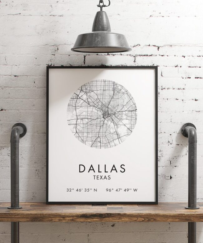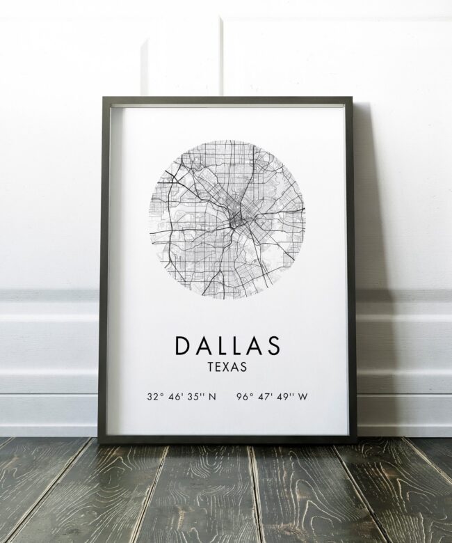 Dallas, Texas City Street Map with GPS Coordinates Art Print – Office – Home Decor – Restaurant – Apartment – Condo – Typography