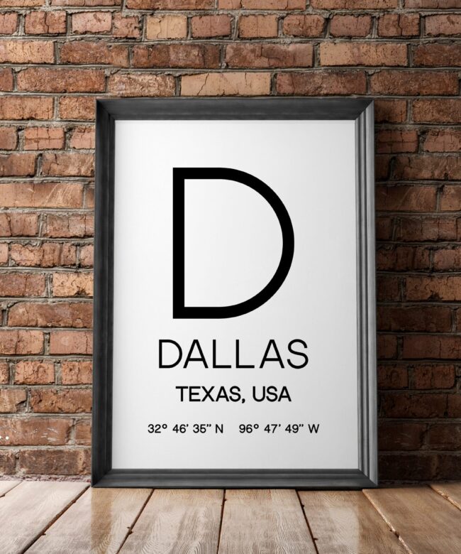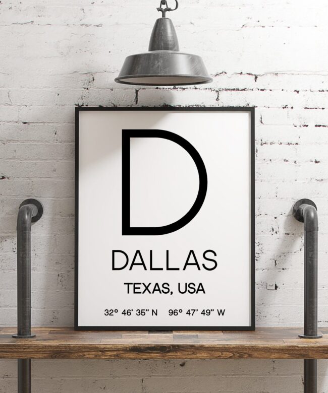 Dallas Texas with GPS Coordinates Typography Art Print – Office – Home Decor – Restaurant – Apartment – Condo – Typography