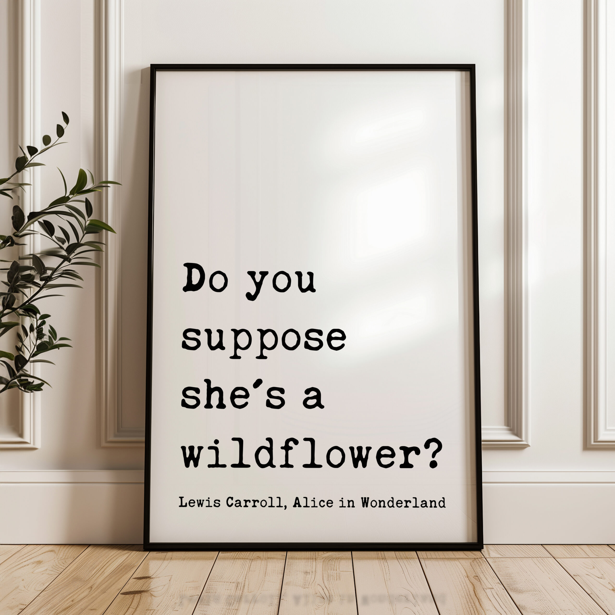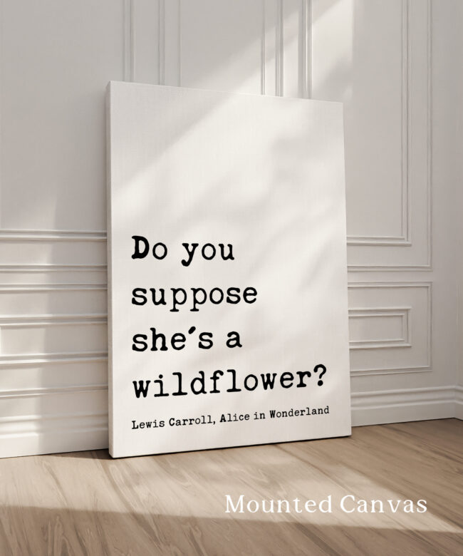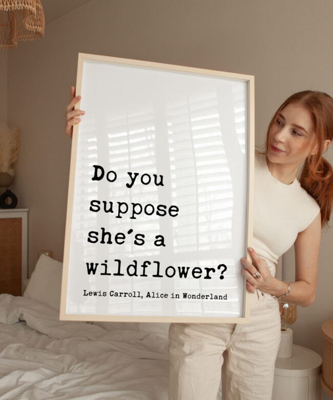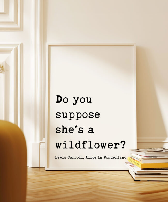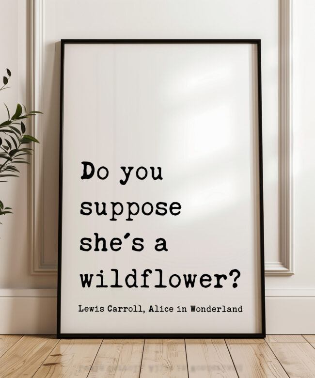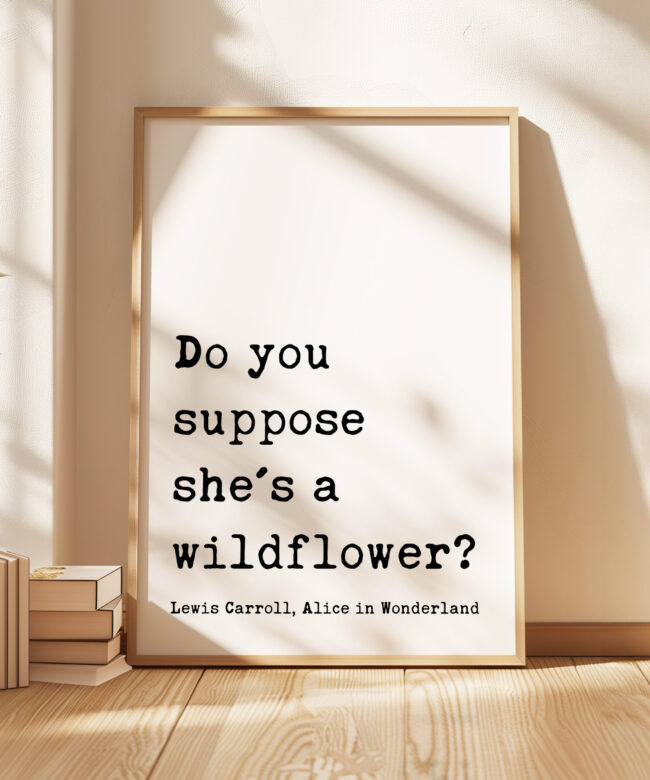 Bring a sense of whimsy and wonder to your space with this beautiful typography art print that reads, “Do you suppose she’s a wildflower?” — a beloved quote from Lewis Carroll, Alice in Wonderland. Designed in a classic typewriter-style font, this piece exudes vintage literary charm. It’s the perfect gift for free spirits, wild hearts, and lovers of timeless tales. Celebrate her uniqueness with a gift that feels as magical as she is. This print is a thoughtful and enchanting gift for birthdays, graduations, nursery decor, or simply to remind someone how wonderfully wild they are.