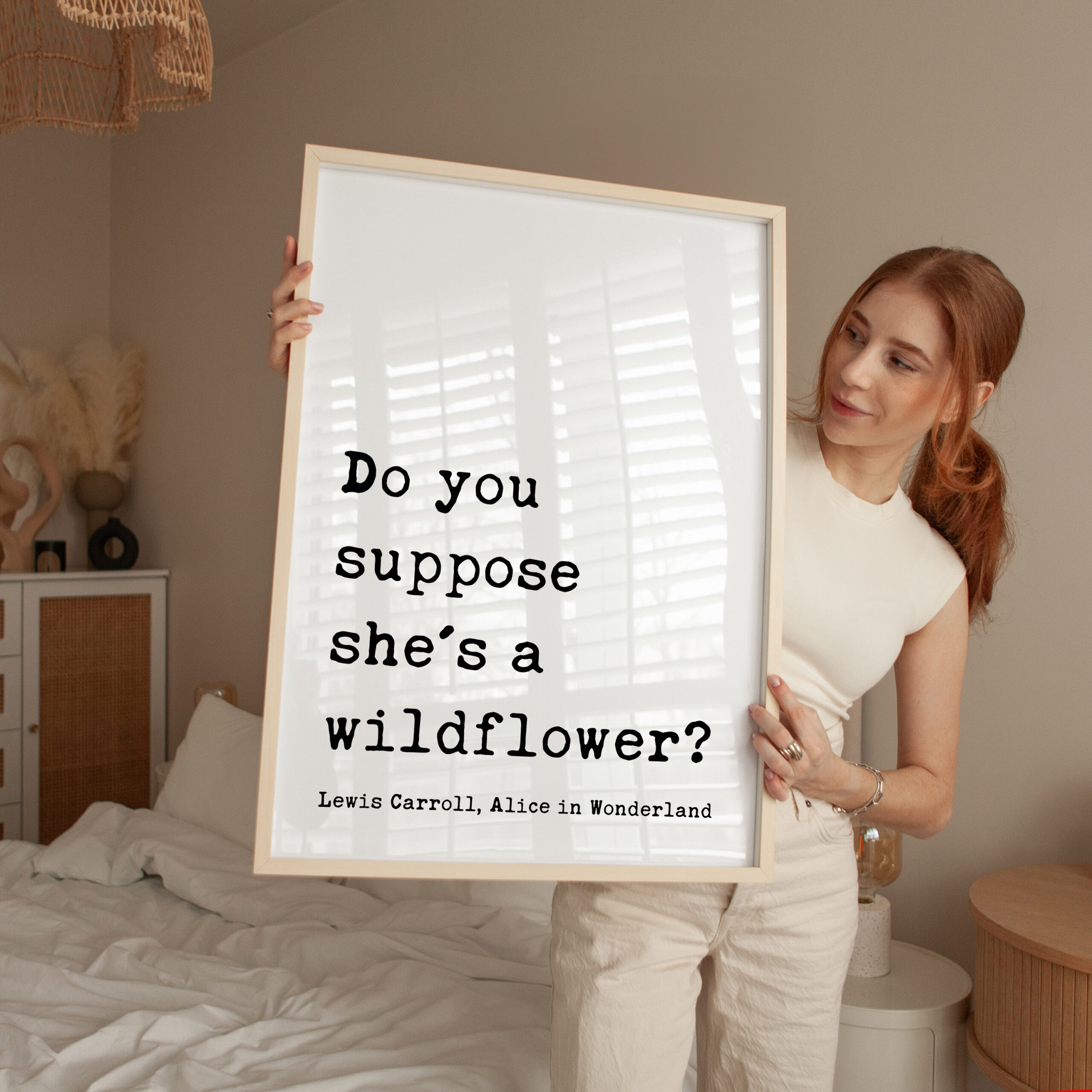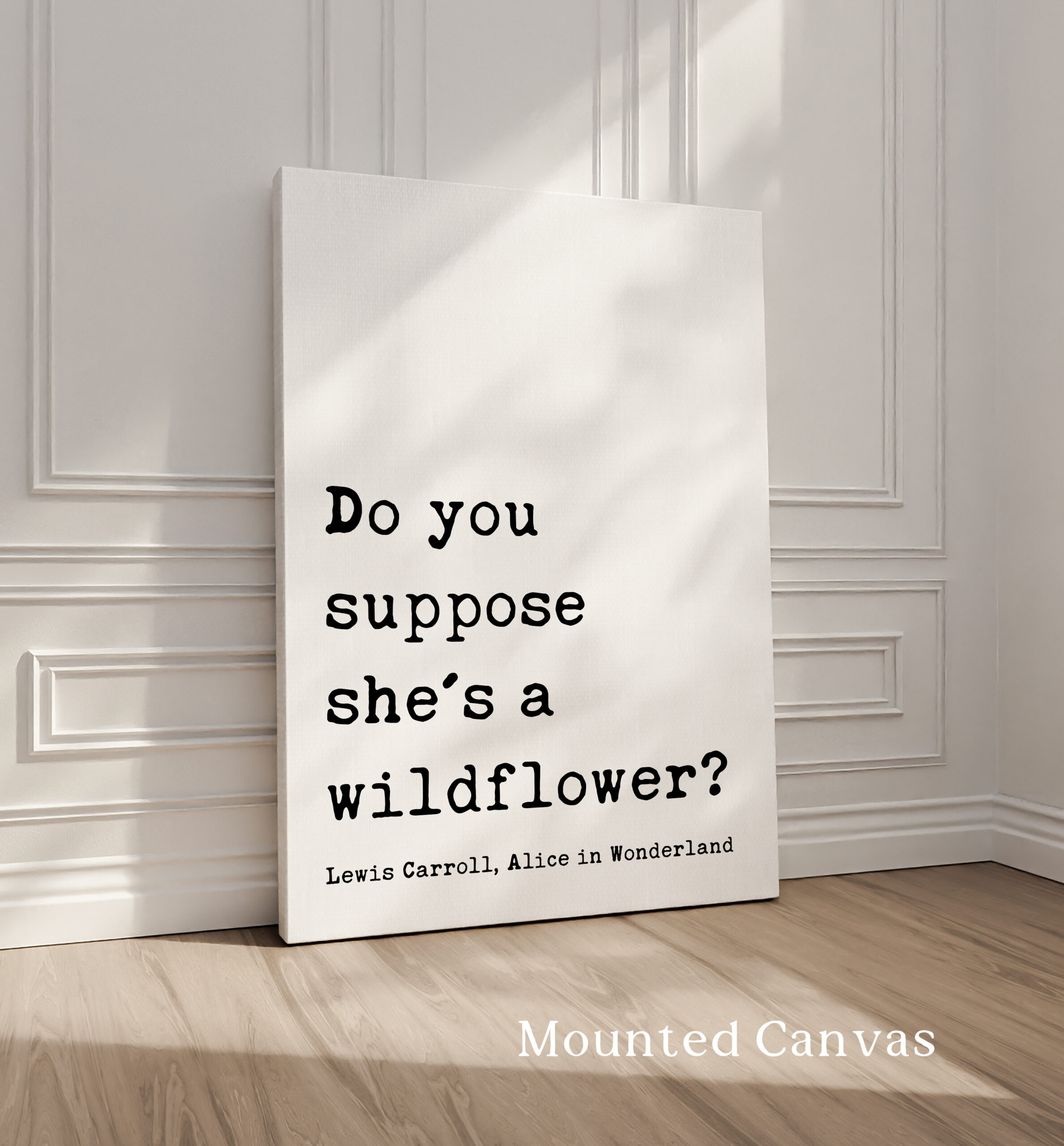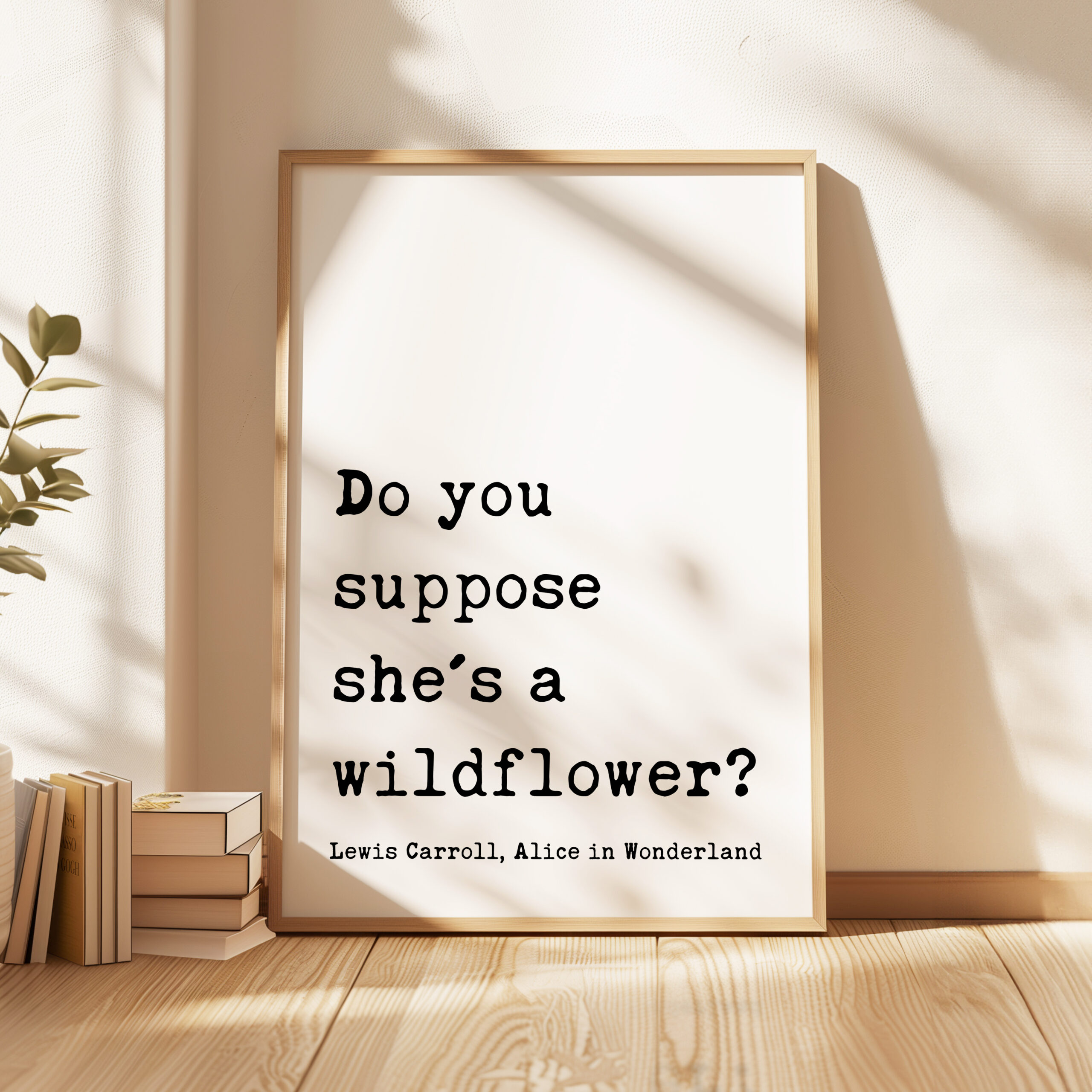 Bring a sense of whimsy and wonder to your space with this beautiful typography art print that reads, “Do you suppose she’s a wildflower?” — a beloved quote from Lewis Carroll, Alice in Wonderland. Designed in a classic typewriter-style font, this piece exudes vintage literary charm. It’s the perfect gift for free spirits, wild hearts, and lovers of timeless tales. Celebrate her uniqueness with a gift that feels as magical as she is. This print is a thoughtful and enchanting gift for birthdays, graduations, nursery decor, or simply to remind someone how wonderfully wild they are.