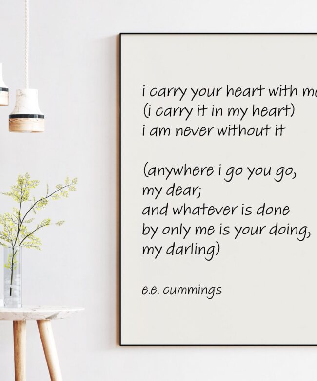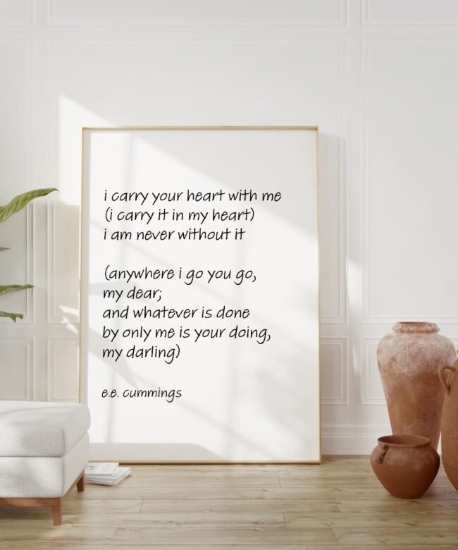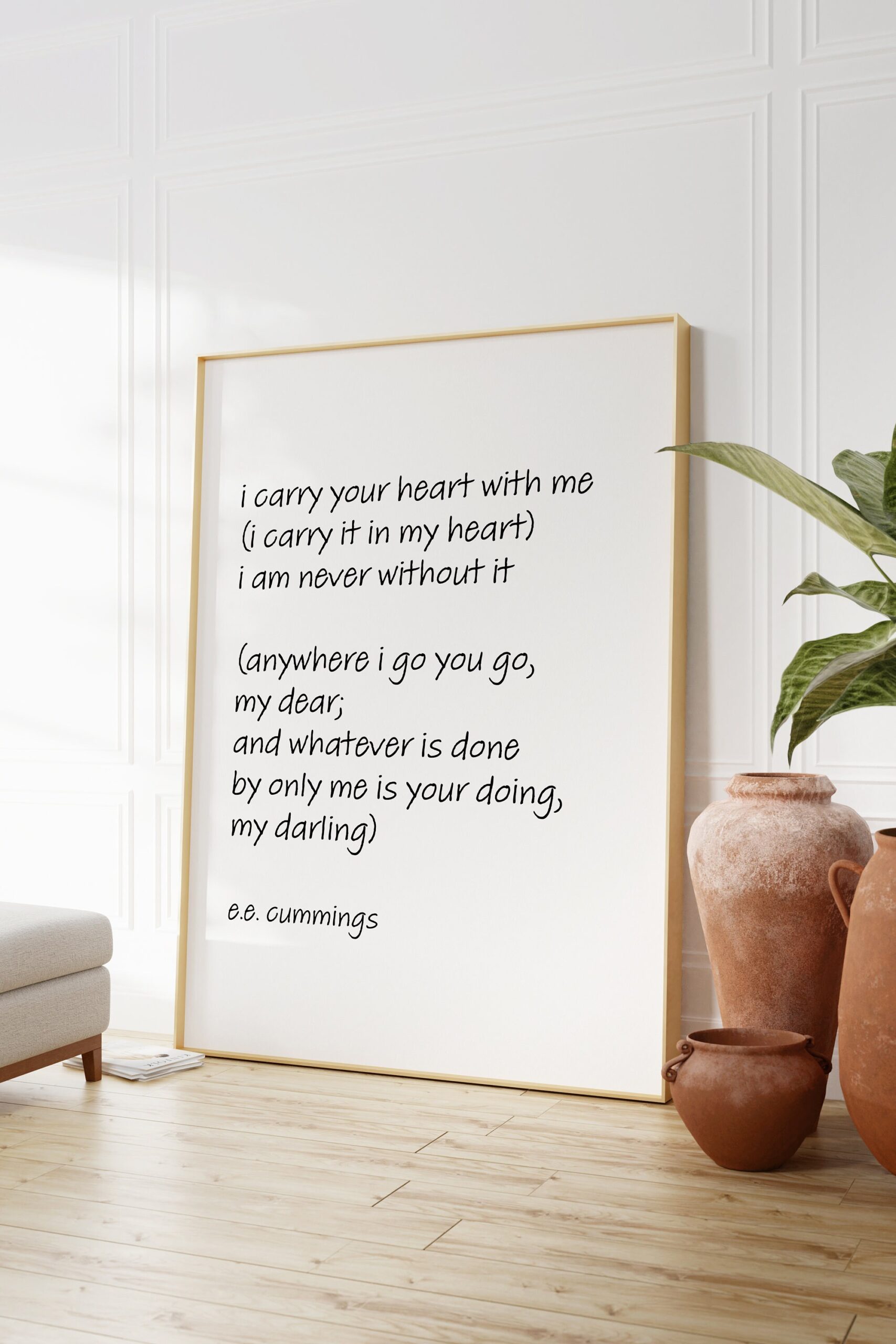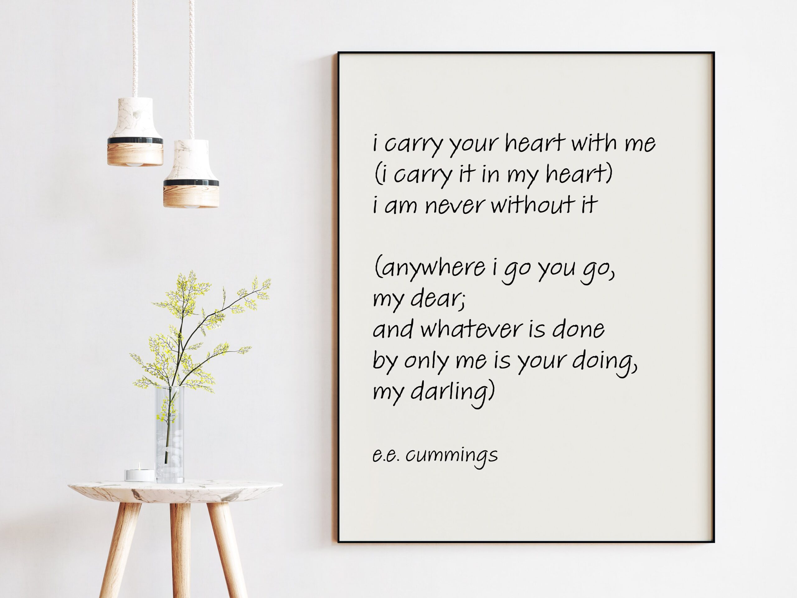 ee cummings Quote – I Carry Your Heart with Me ( I Carry it in My Heart) Art Print- Handwritten Love Poem, Wedding Gift, Quote, Friendship