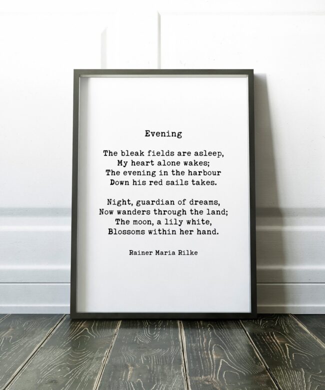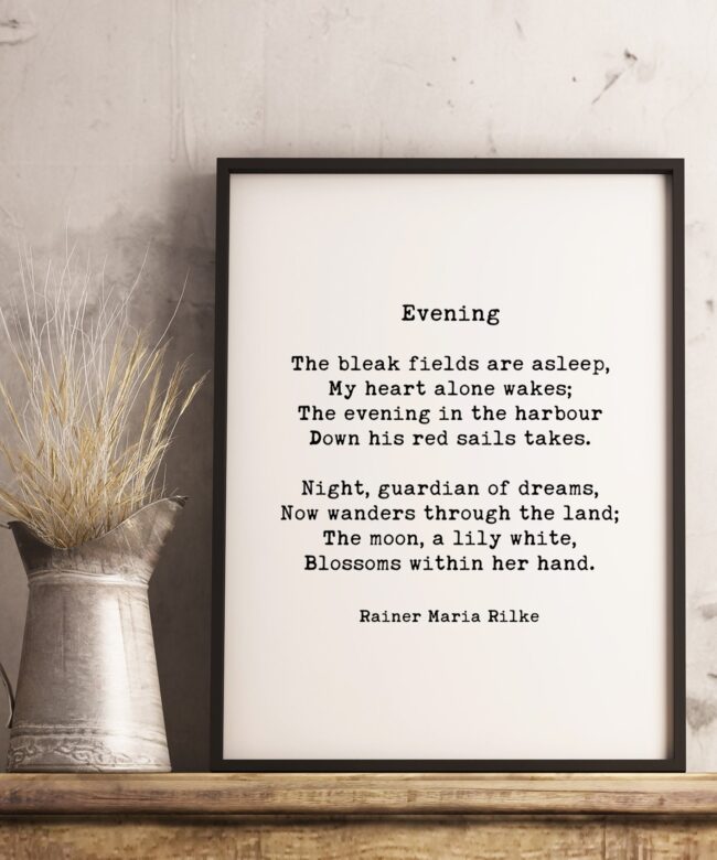 Evening, The bleak fields are asleep, My heart alone wakes; The evening in the harbour Down his red sails takes. – Rainer Maria Rilke