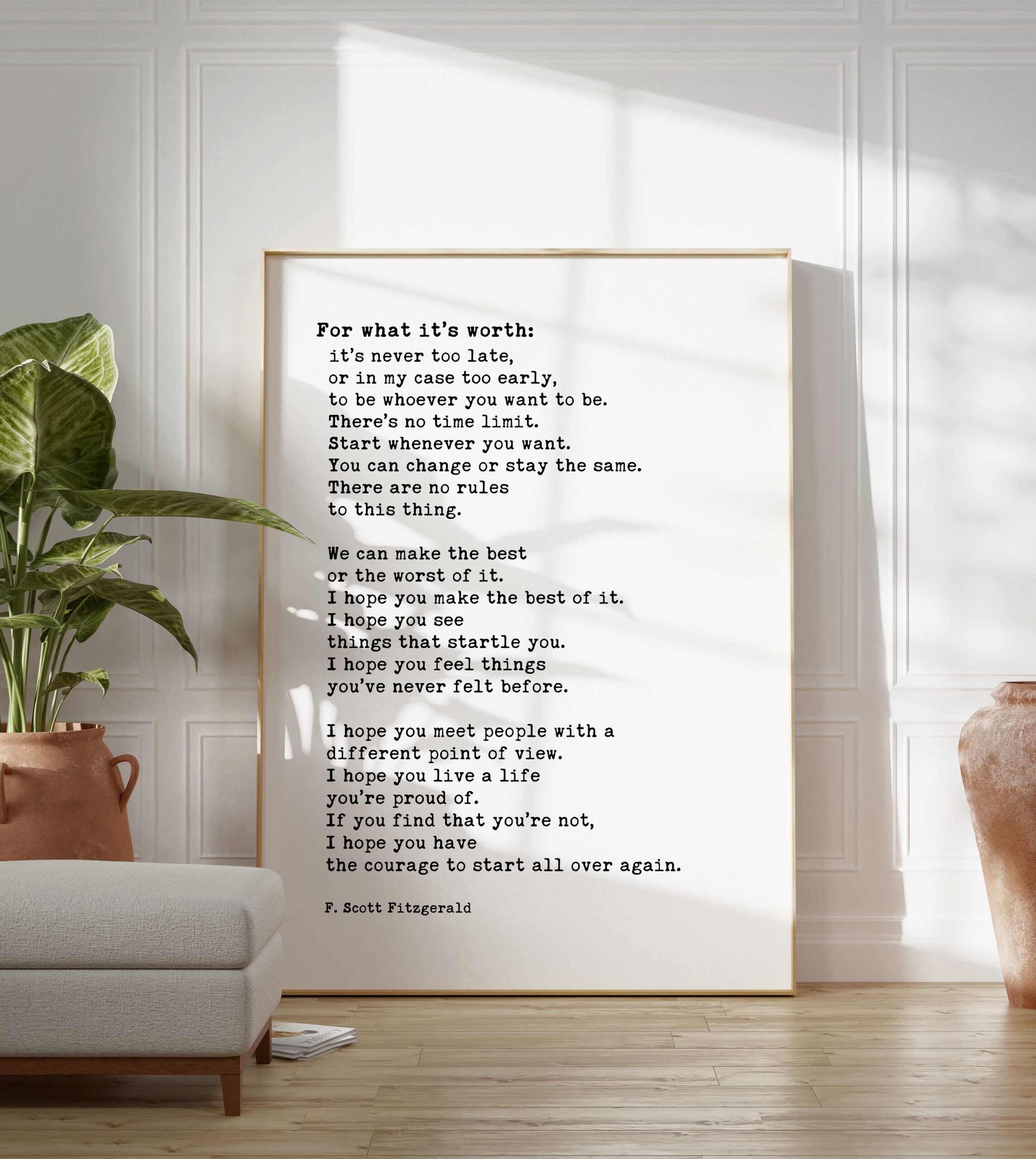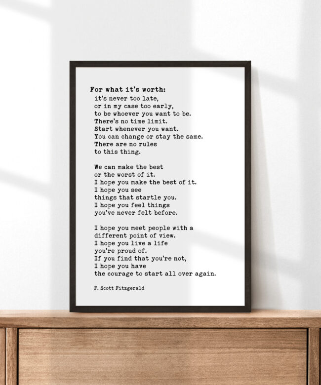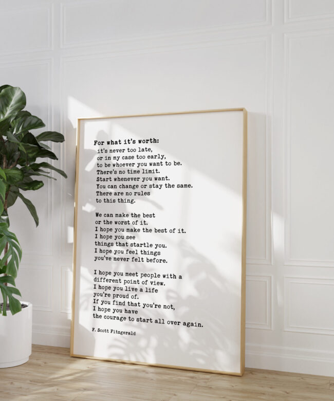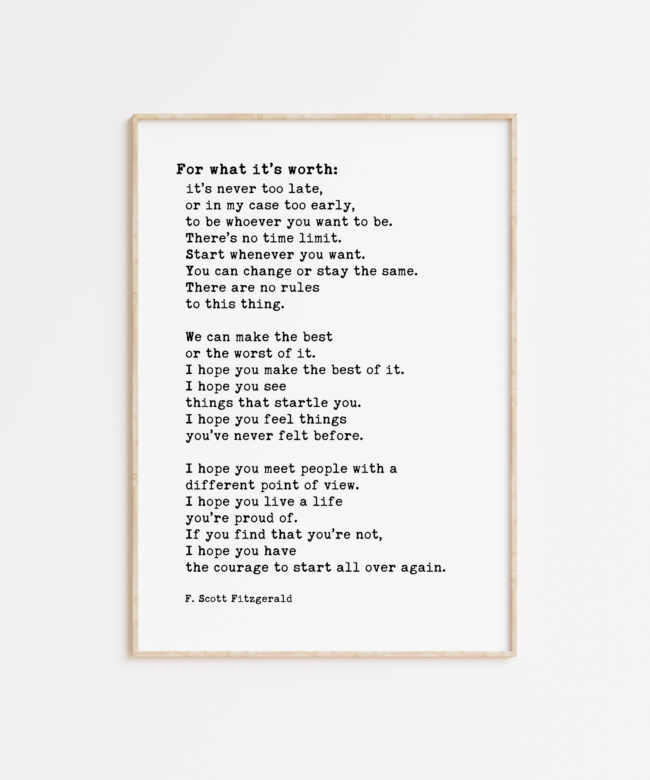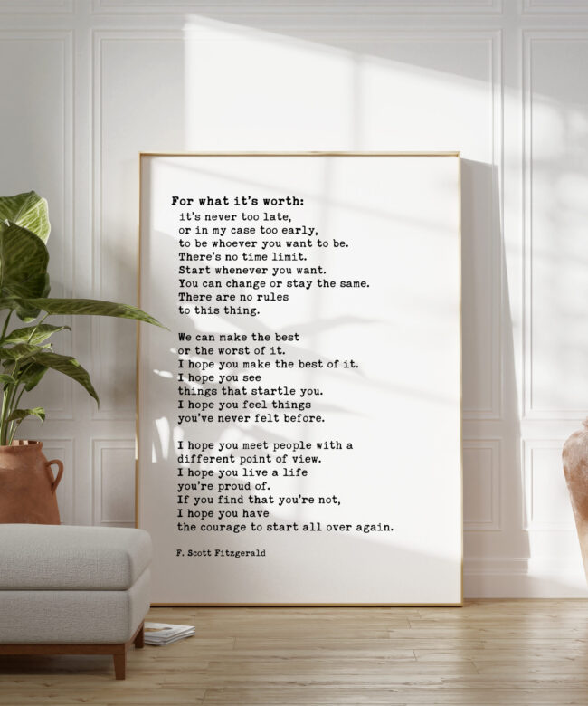Introducing our F. Scott Fitzgerald Quote – “For What It’s Worth, It’s Never Too Late” Typography Art Print, a timeless reminder that dreams are ageless and possibilities are boundless!