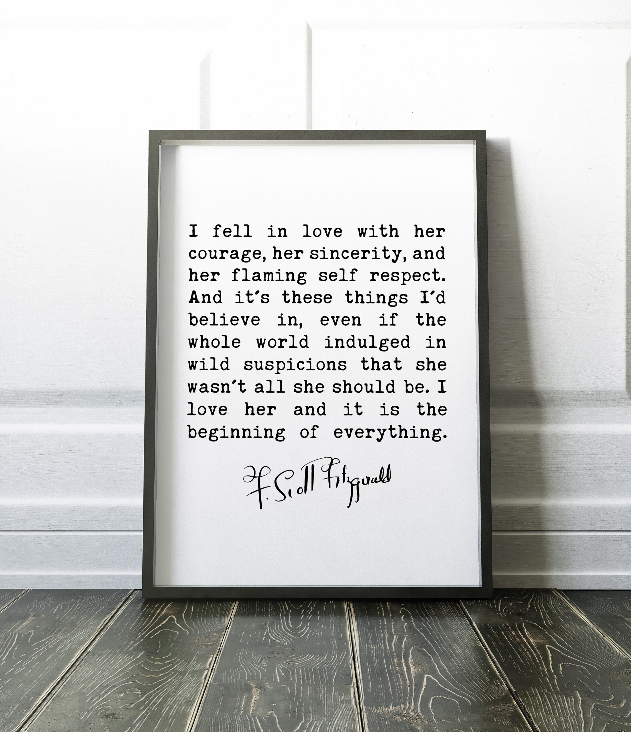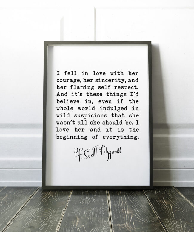 F. Scott Fitzgerald Quote – I fell in love with her courage, her sincerity, and her flaming self respect. Art Print – Love – Inspiration