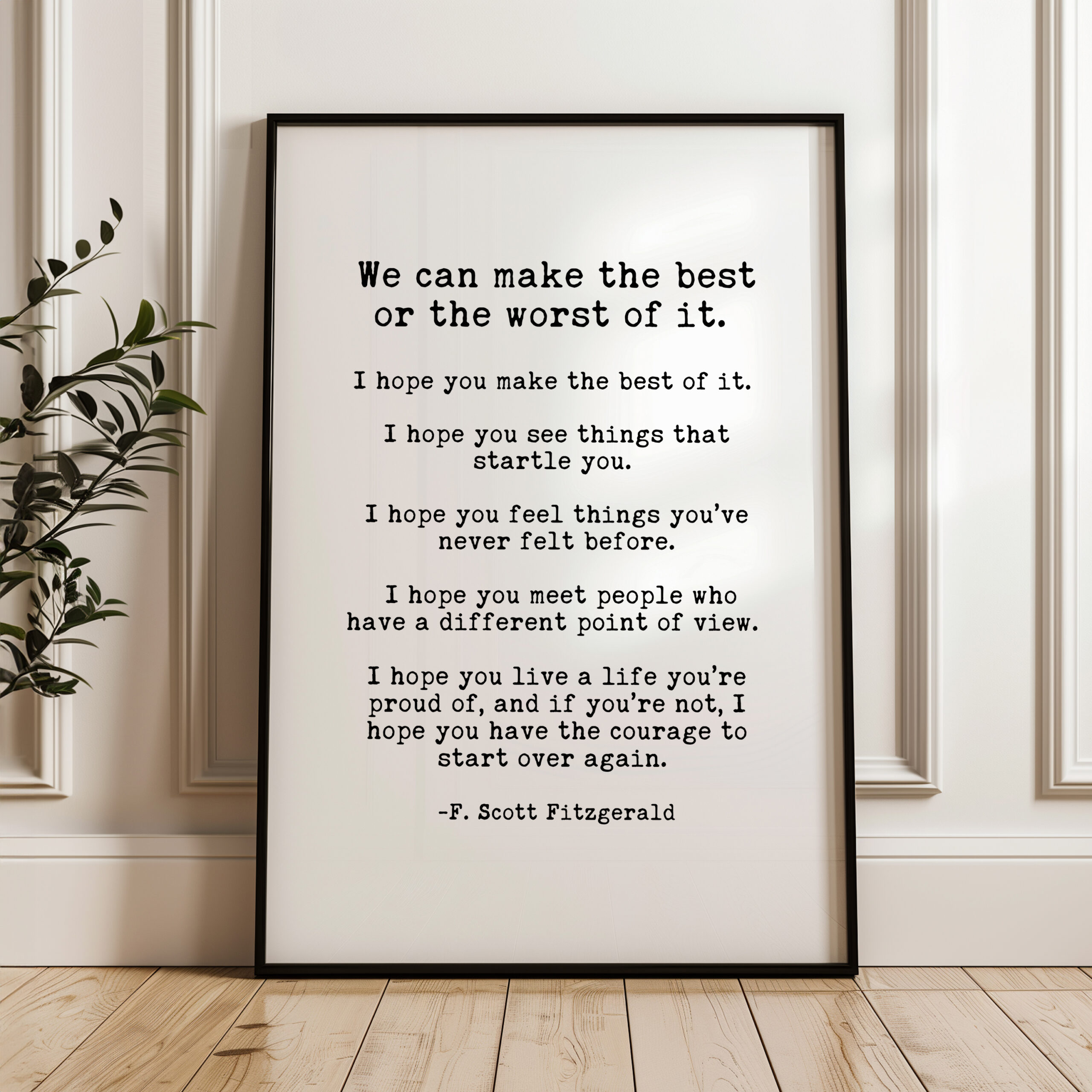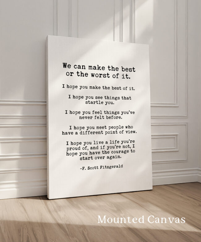 Thought-provoking and timeless, this art print features F. Scott Fitzgerald’s words: “I hope you make the best of it. I hope you see things that startle you…” and more. Each line invites reflection, making it a wonderful daily affirmation. Whether you’re decorating your space or looking for a thoughtful gift, this print adds depth and inspiration to any room.