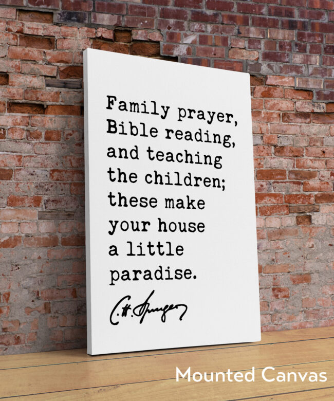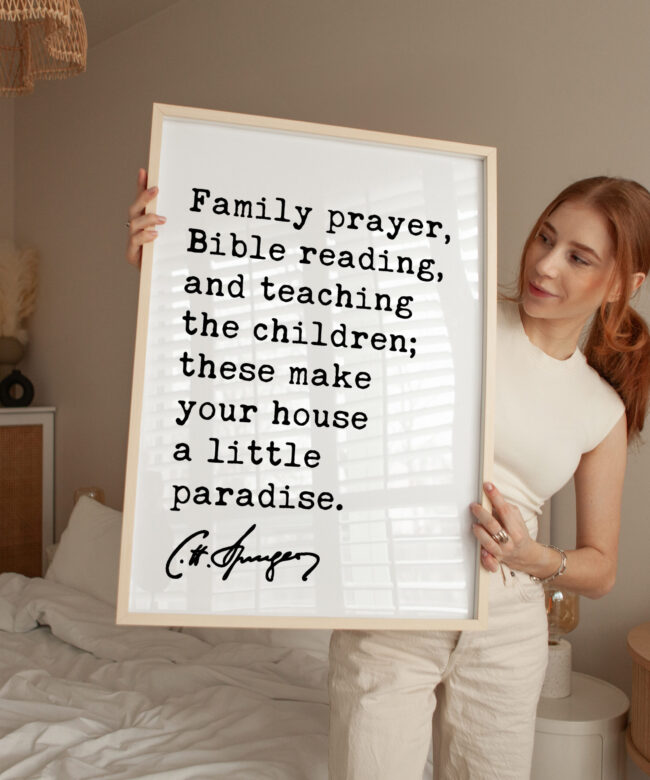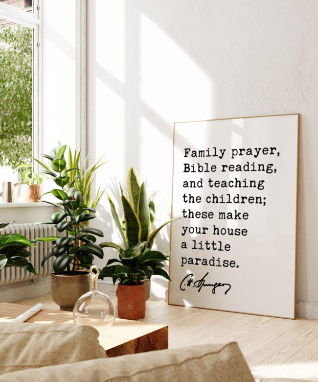 Create a peaceful and nurturing atmosphere in your home with this Typography Art Print featuring the heartfelt quote by Charles Spurgeon: “Family prayer, Bible reading, & teaching the children; these make your house a little paradise.” This beautiful reminder of faith, family, and love serves as a perfect addition to any family room or prayer space.