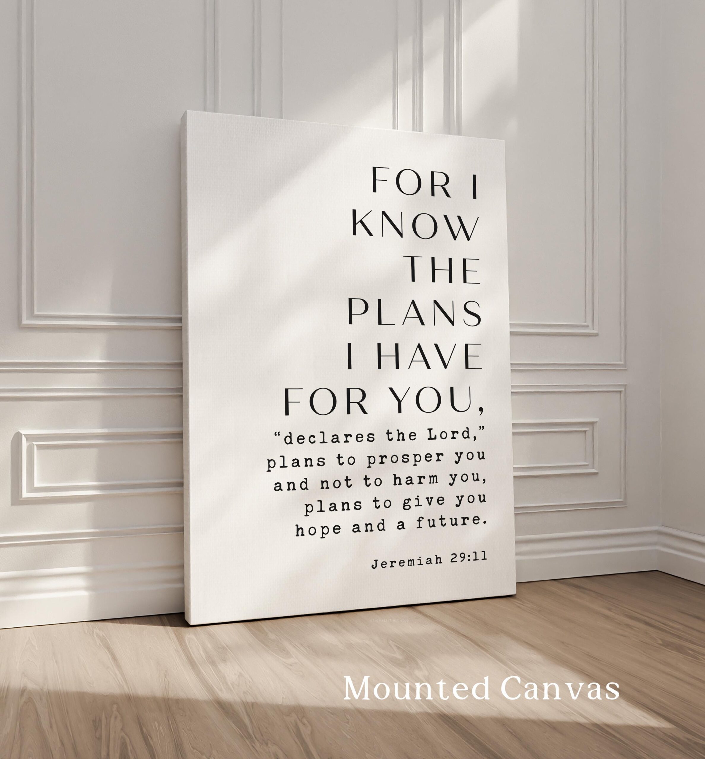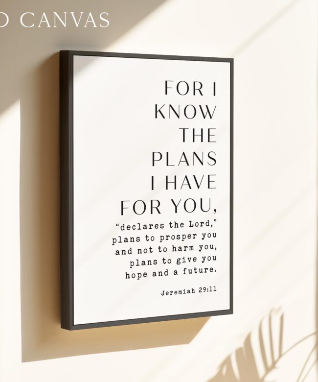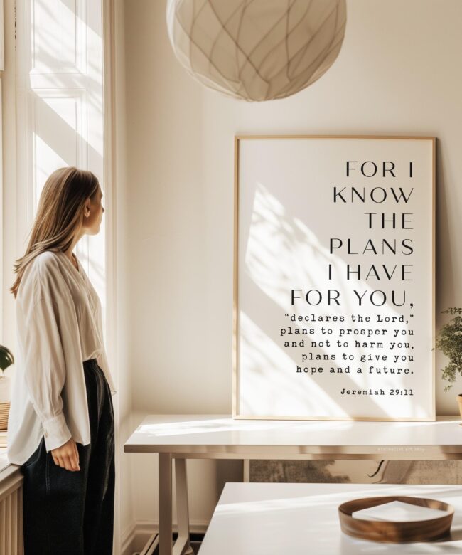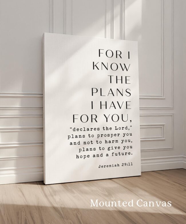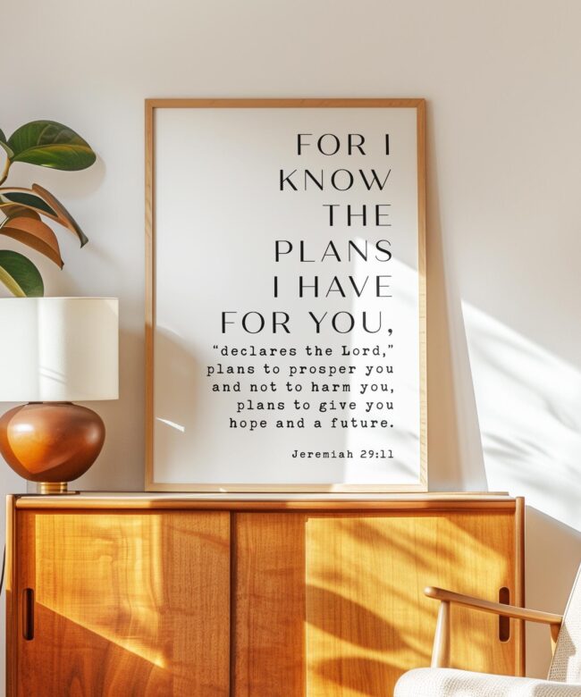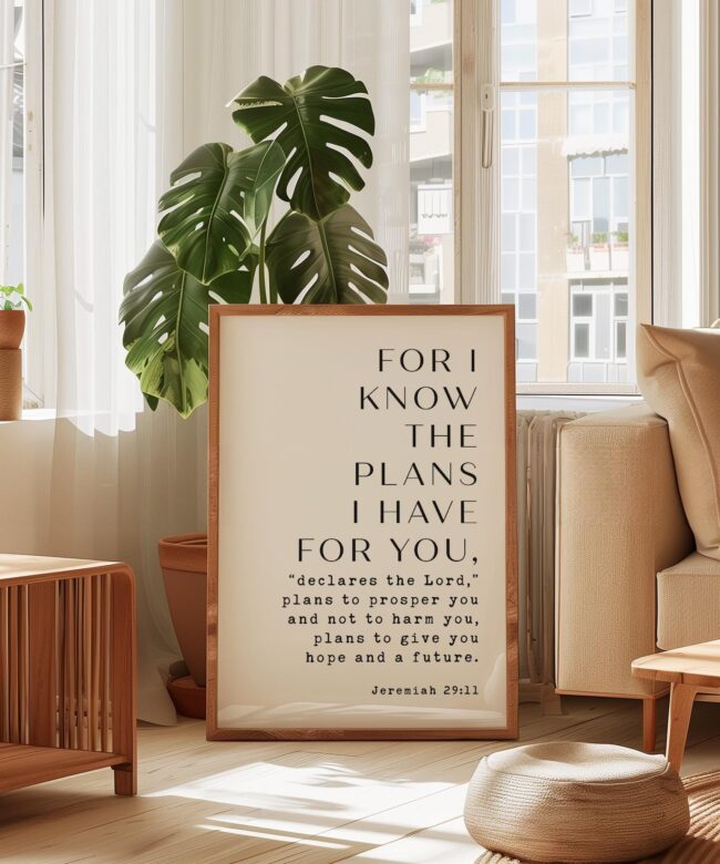 Bring encouragement and hope into your home with this beautifully crafted Jeremiah 29:11 typography print. Featuring the beloved verse “For I know the plans I have for you,” declares the Lord, “plans to prosper you and not to harm you, plans to give you hope and a future,” it’s a daily reminder of God’s promises.
