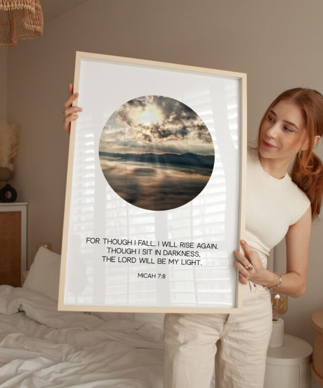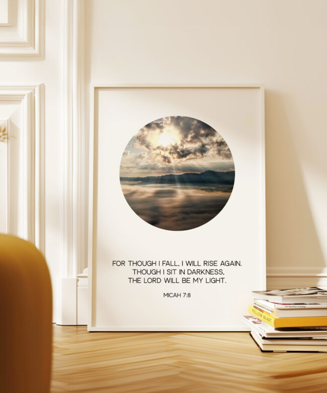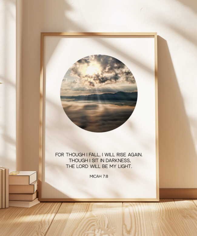 Elevate your space with this powerful Typography Art Print featuring the timeless verse: ‘FOR THOUGH I FALL, I WILL RISE AGAIN. THOUGH I SIT IN DARKNESS, THE LORD WILL BE MY LIGHT. MICAH 7:8.’ Designed to inspire resilience and faith, this print combines minimalist elegance with profound scripture, making it a perfect addition to your home, office, or sacred space.