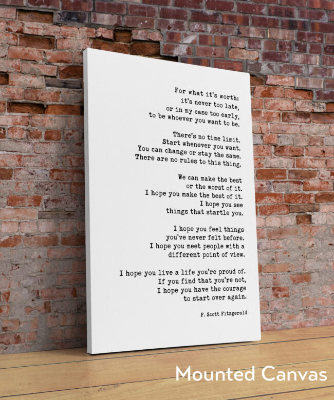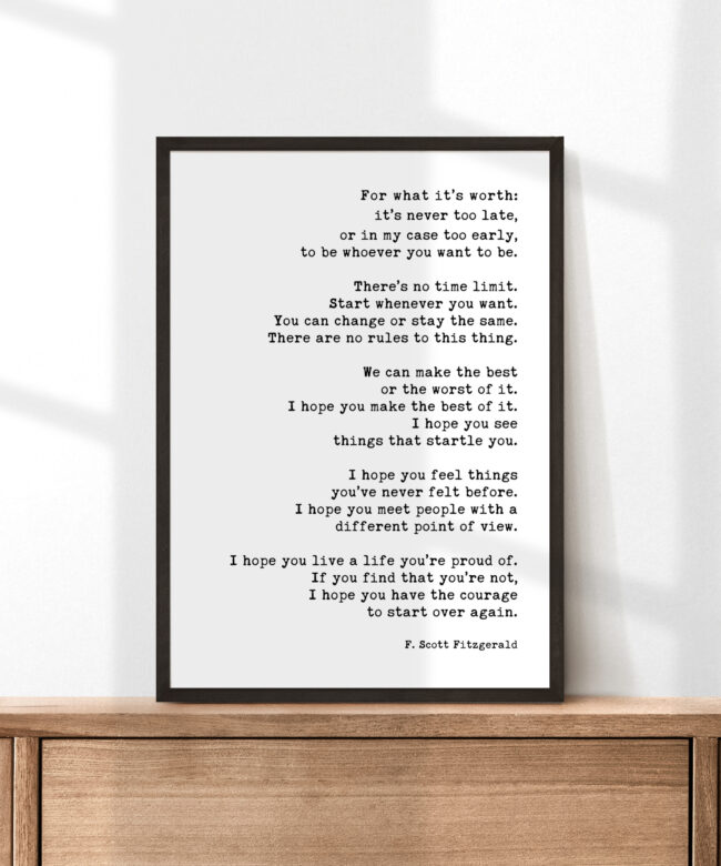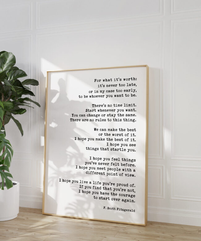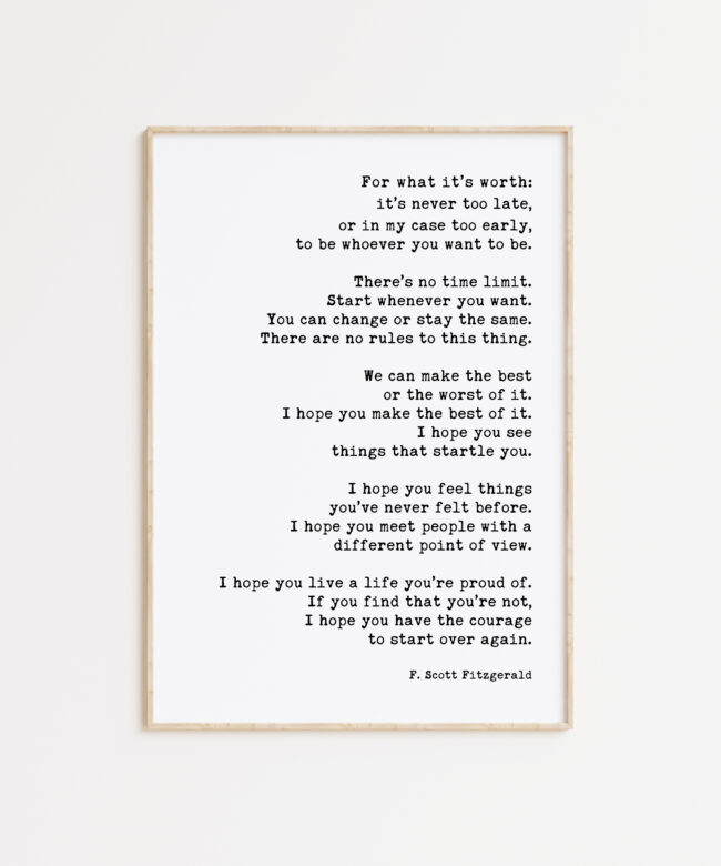 Introducing our captivating Typography Art Print, adorned with the timeless wisdom of F. Scott Fitzgerald. Let his profound words serve as a beacon of inspiration and encouragement in your journey of self-discovery and personal growth.
