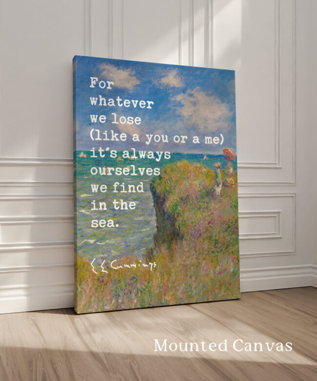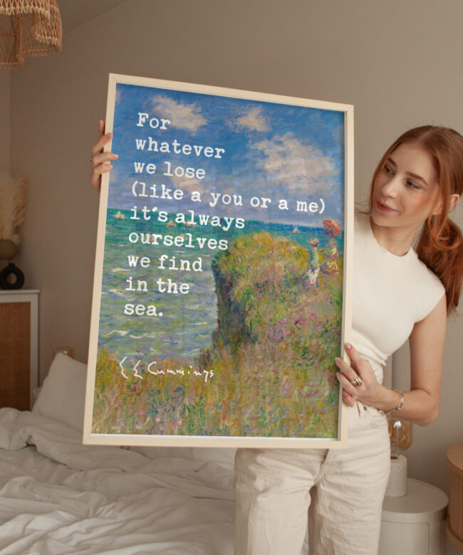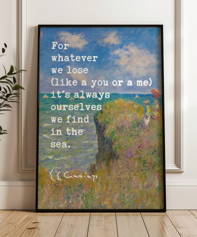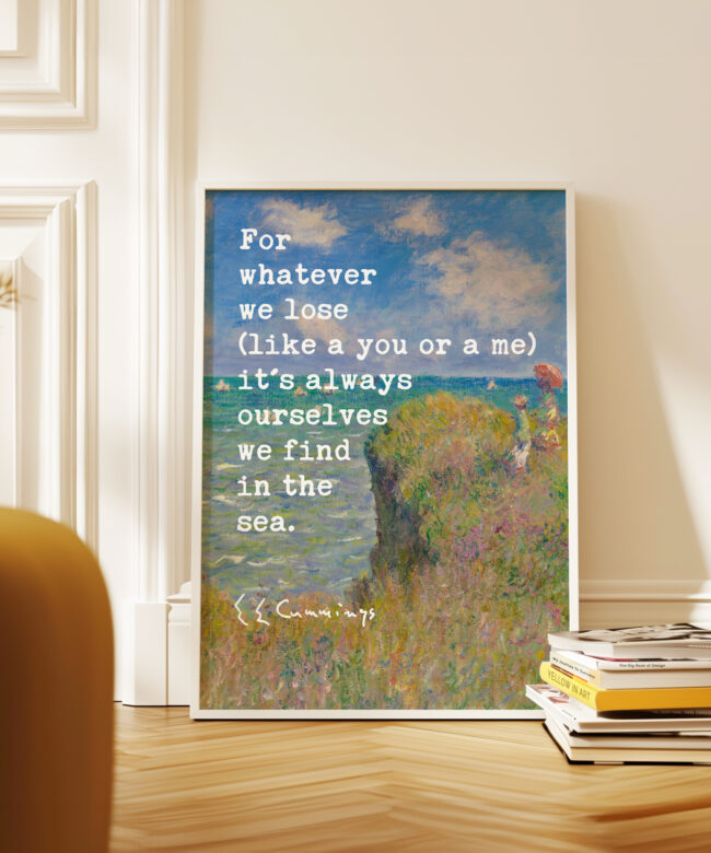 Embark on a journey of self-discovery amidst the breathtaking beauty of the ocean with this captivating typography art print featuring the evocative quote by E.E. Cummings, “For whatever we lose (like a you or a me) it’s always ourselves we find in the sea,” set against the backdrop of Claude Monet’s iconic “Cliff Walk, Pourville.”