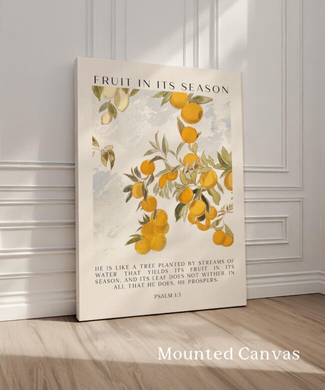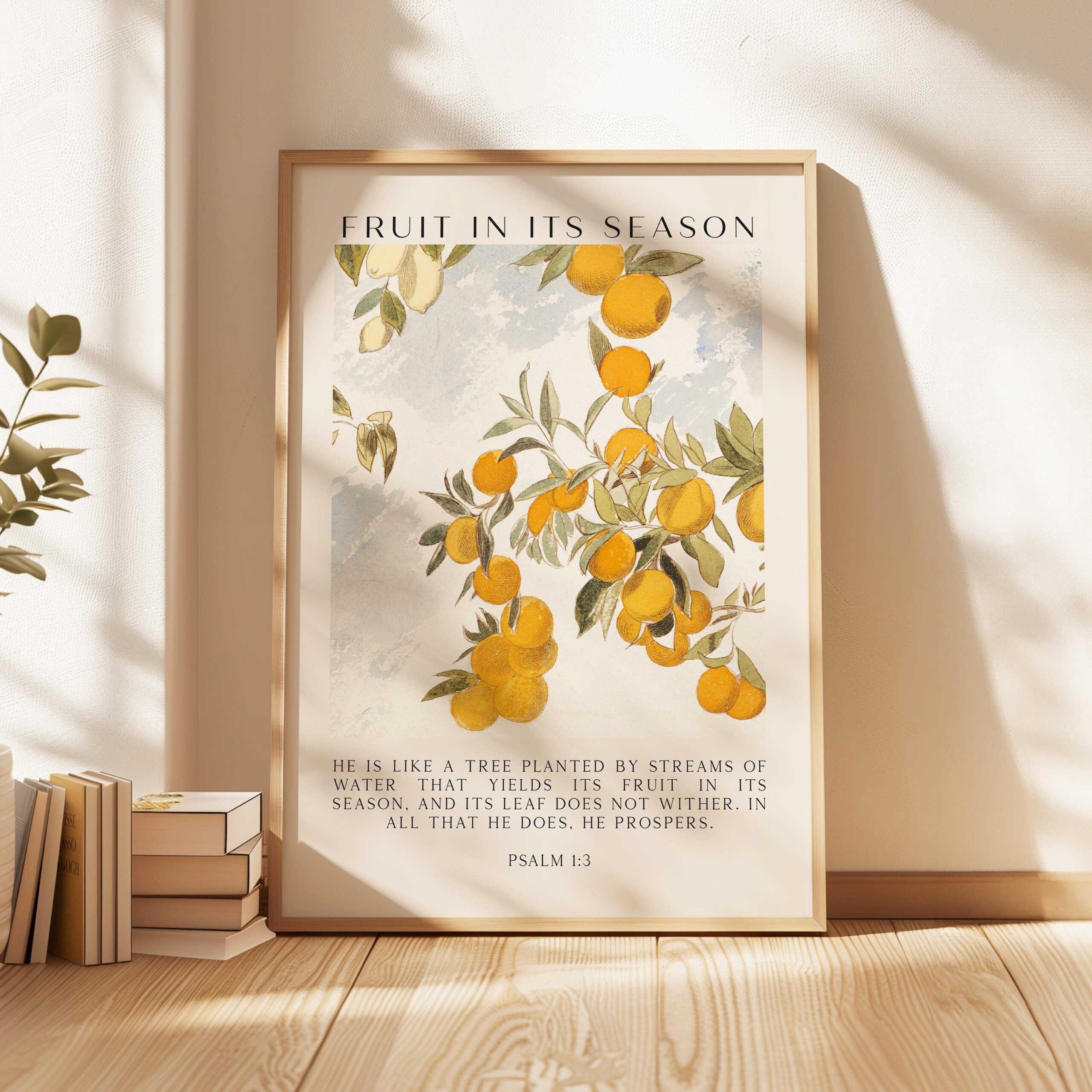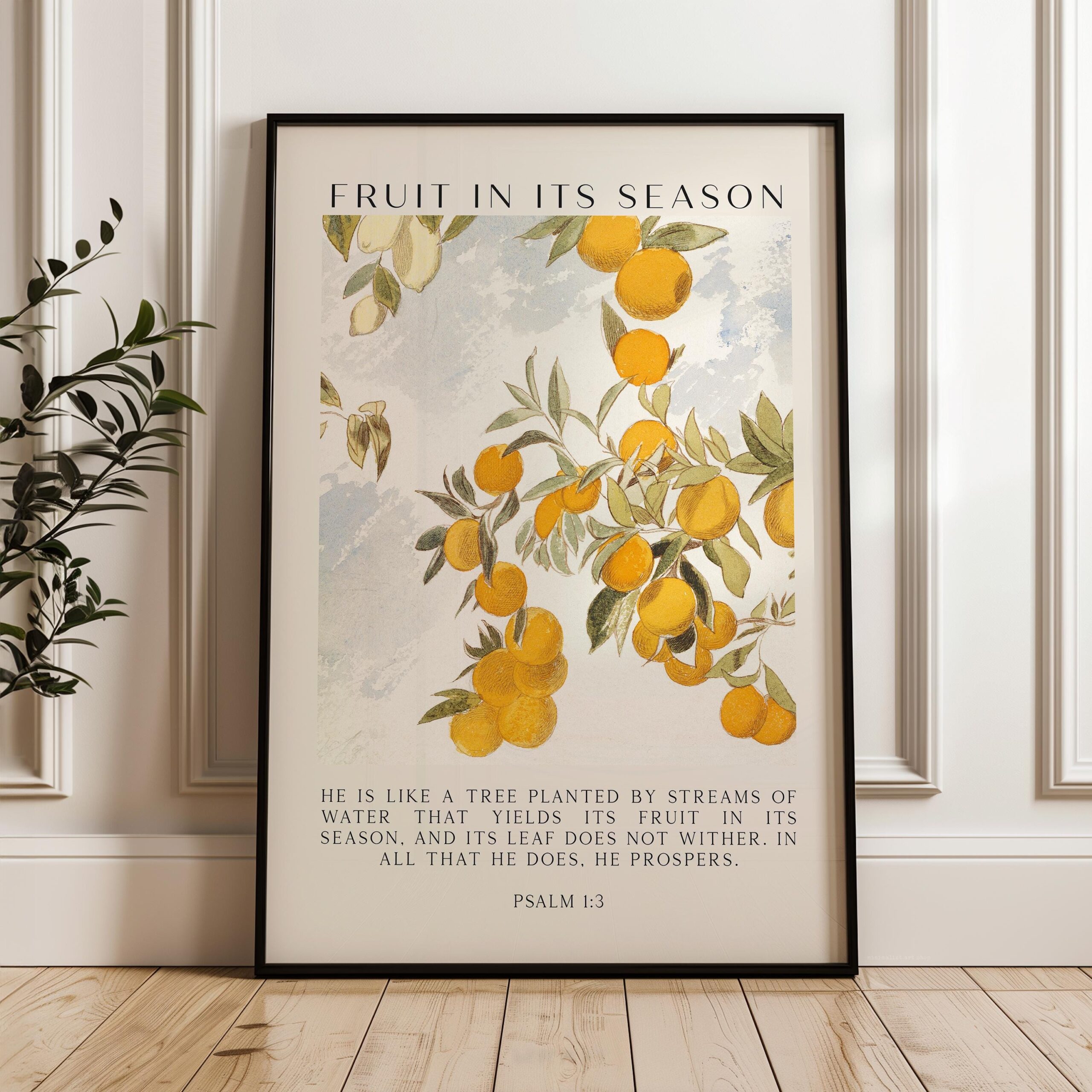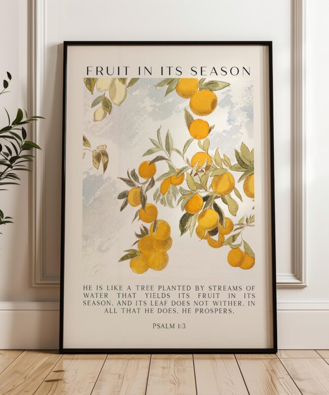 Bring timeless scripture and natural beauty into your home with this “Fruit in Its Season” typography art print. Featuring Psalm 1:3 alongside a vintage-style illustration of fruitful branches, this piece reminds us of God’s blessings and the flourishing that comes from living in faith. A meaningful gift for birthdays, housewarmings, or spiritual milestones, this artwork inspires peace and prosperity wherever it’s displayed.