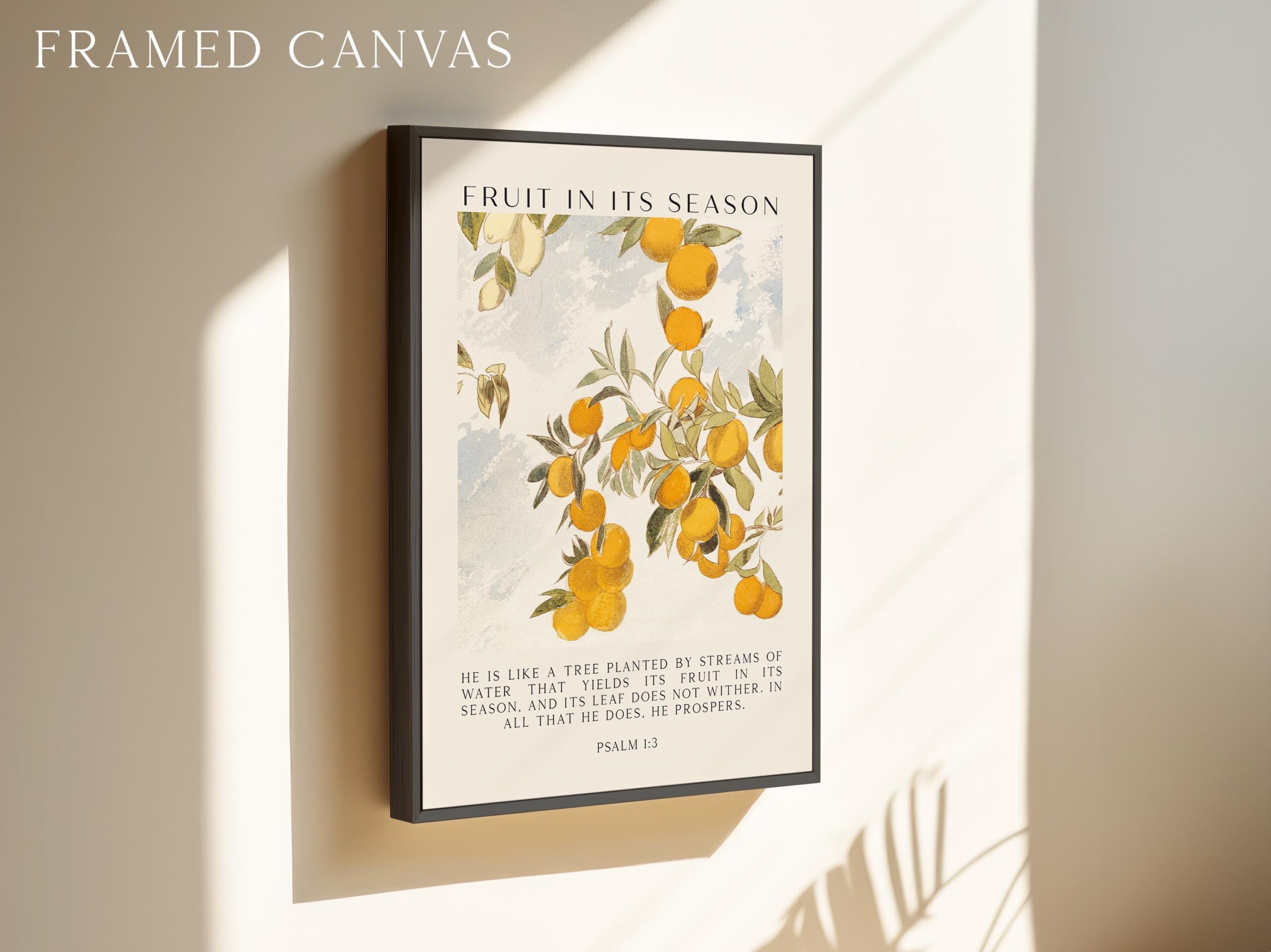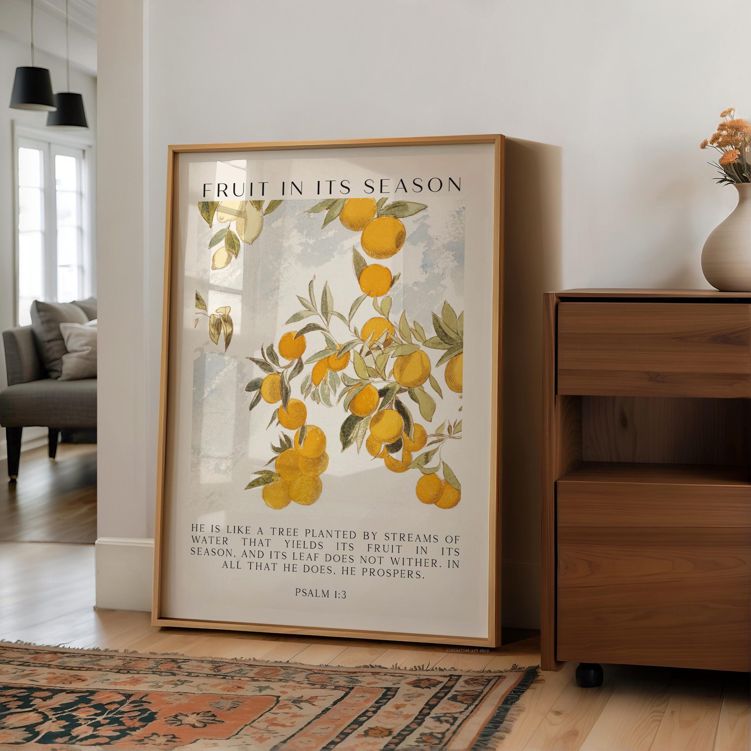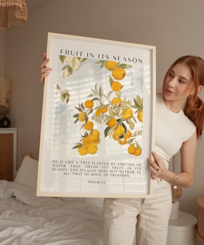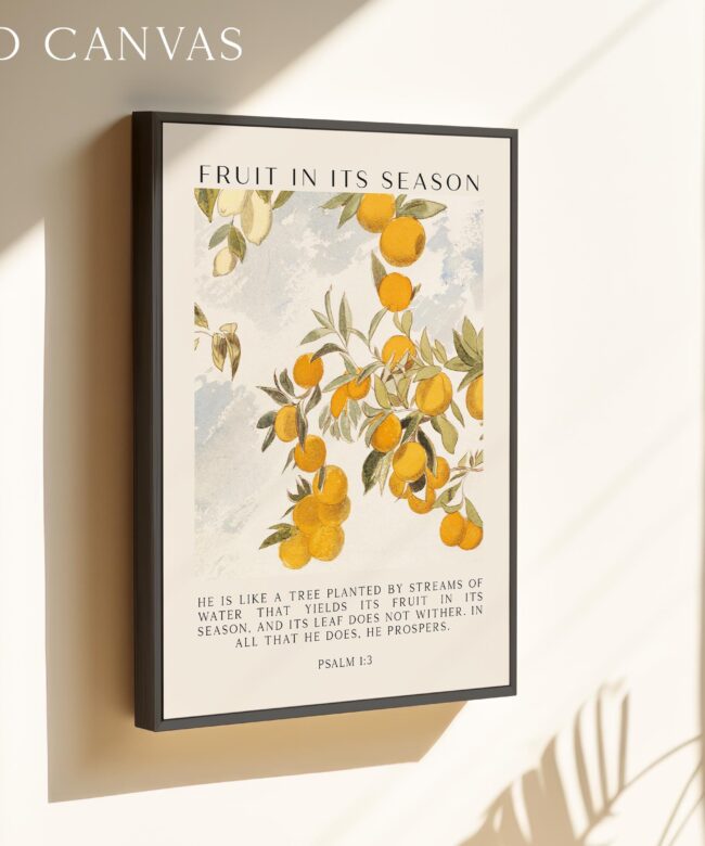 Bring timeless scripture and natural beauty into your home with this “Fruit in Its Season” typography art print. Featuring Psalm 1:3 alongside a vintage-style illustration of fruitful branches, this piece reminds us of God’s blessings and the flourishing that comes from living in faith. A meaningful gift for birthdays, housewarmings, or spiritual milestones, this artwork inspires peace and prosperity wherever it’s displayed.