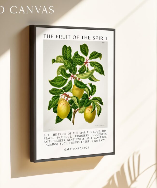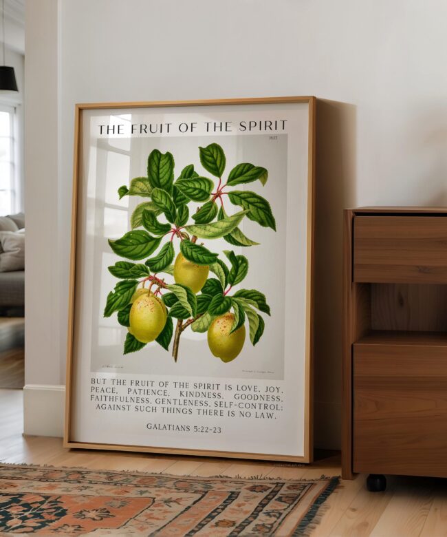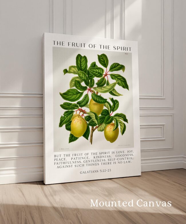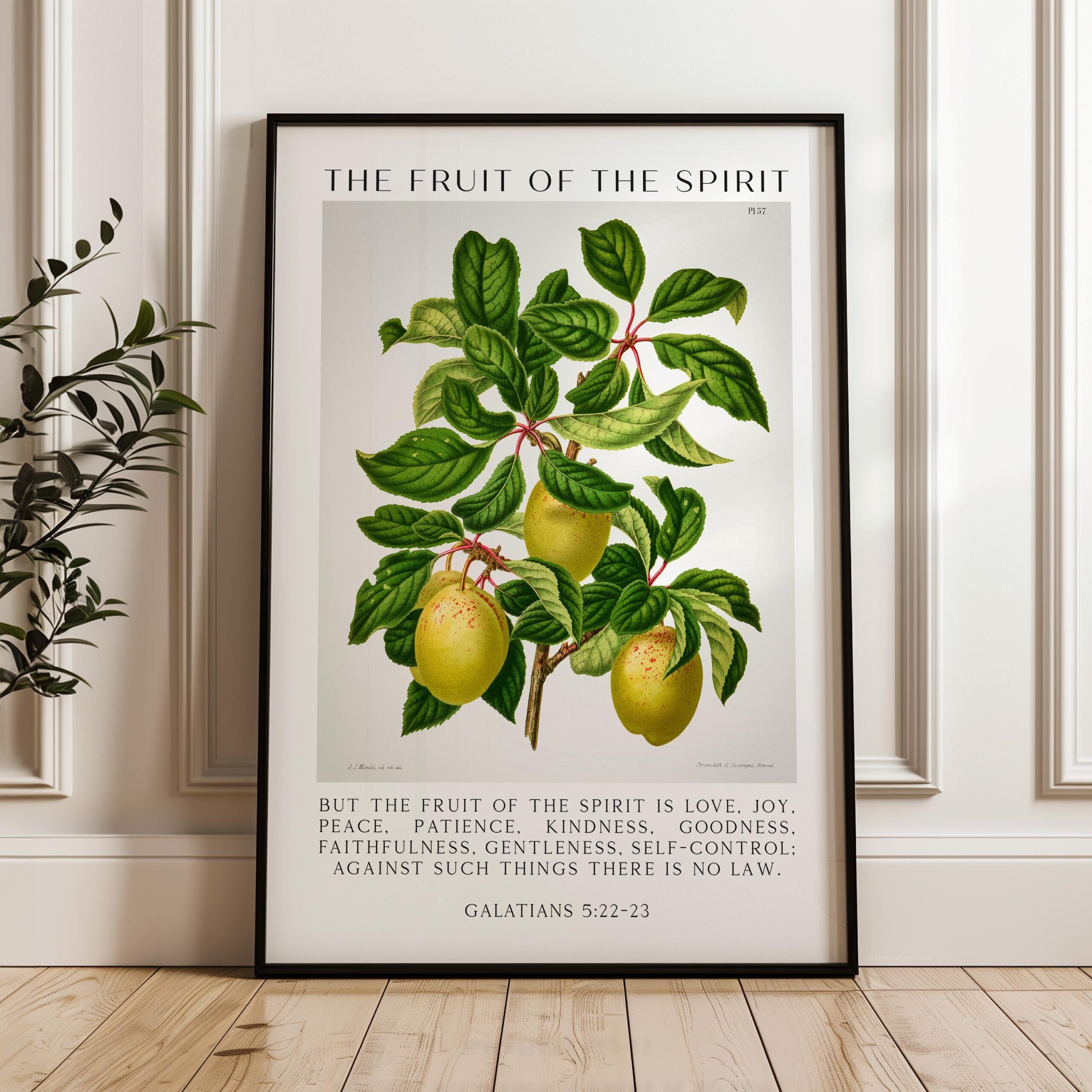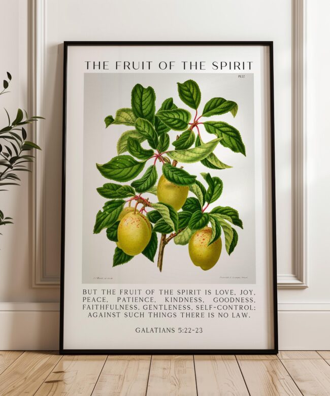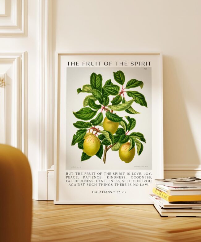 This Fruit of the Spirit Typography Art Print beautifully pairs an antique botanical illustration of Coe’s Golden Drop plum with the timeless words of Galatians 5:22–23. The verse lists the virtues of love, joy, peace, patience, kindness, goodness, faithfulness, gentleness, and self-control—fruits of a life lived in faith.