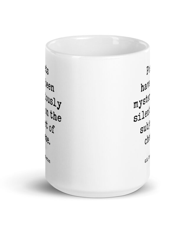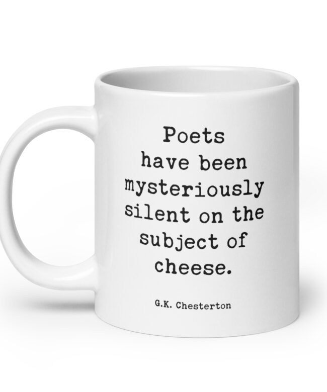 Introducing our G.K. Chesterton Quote “Poets have been mysteriously silent on the subject of cheese.” Coffee Tea Mug – the perfect blend of literary wit and your favorite beverage!