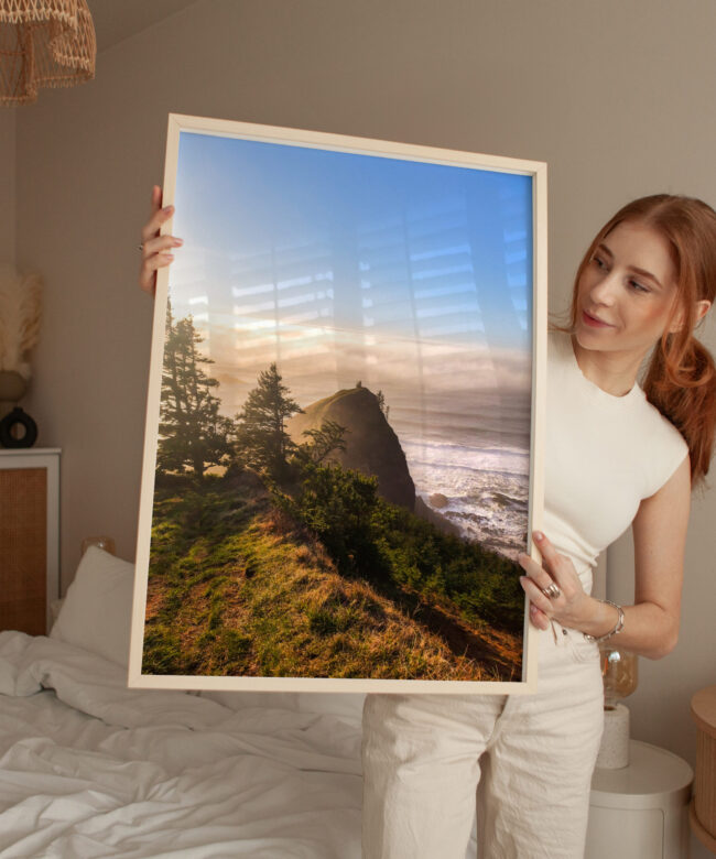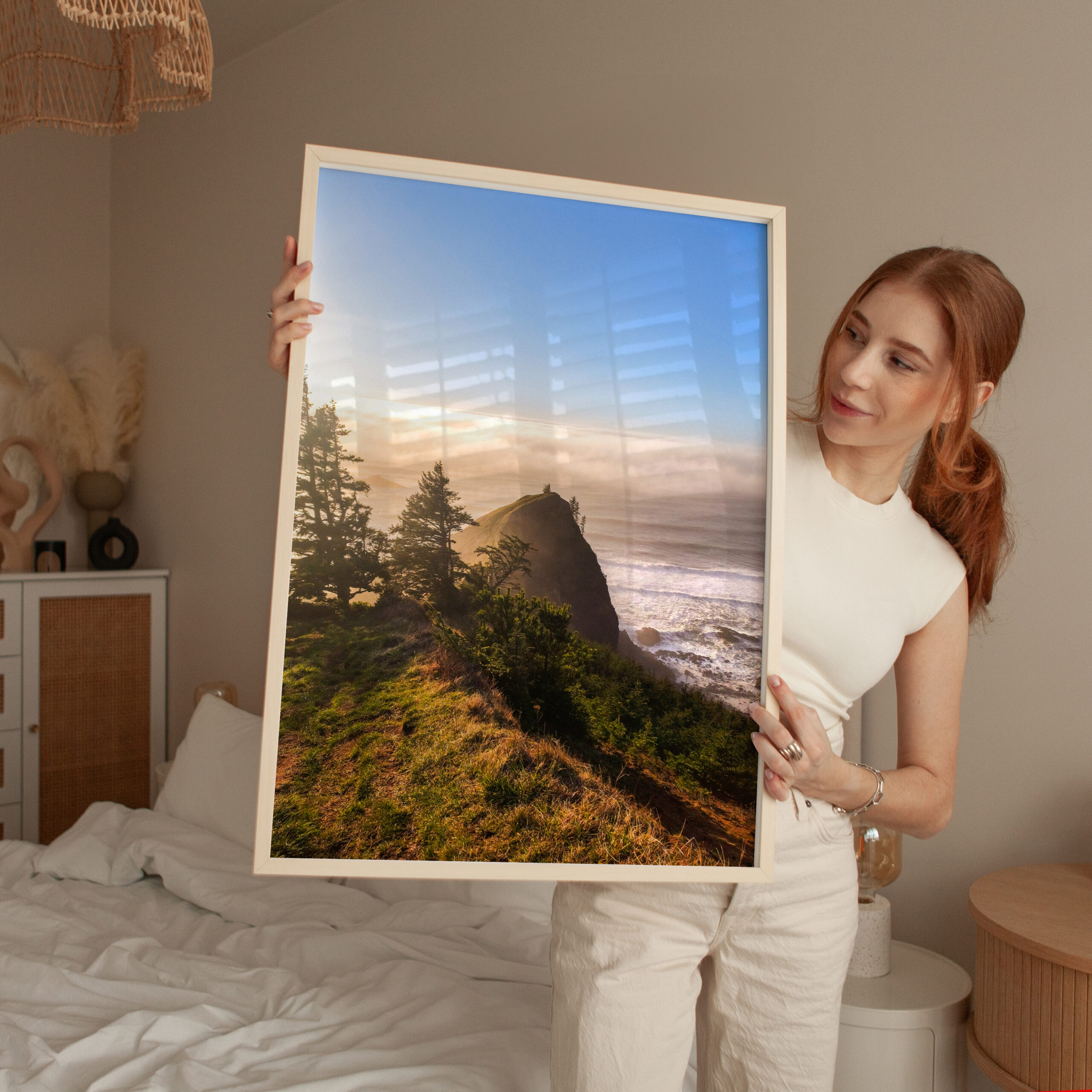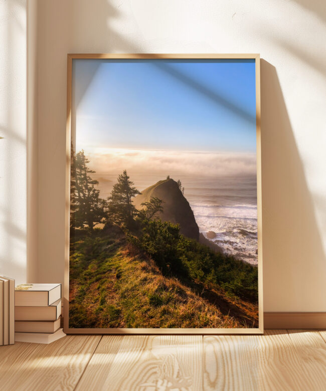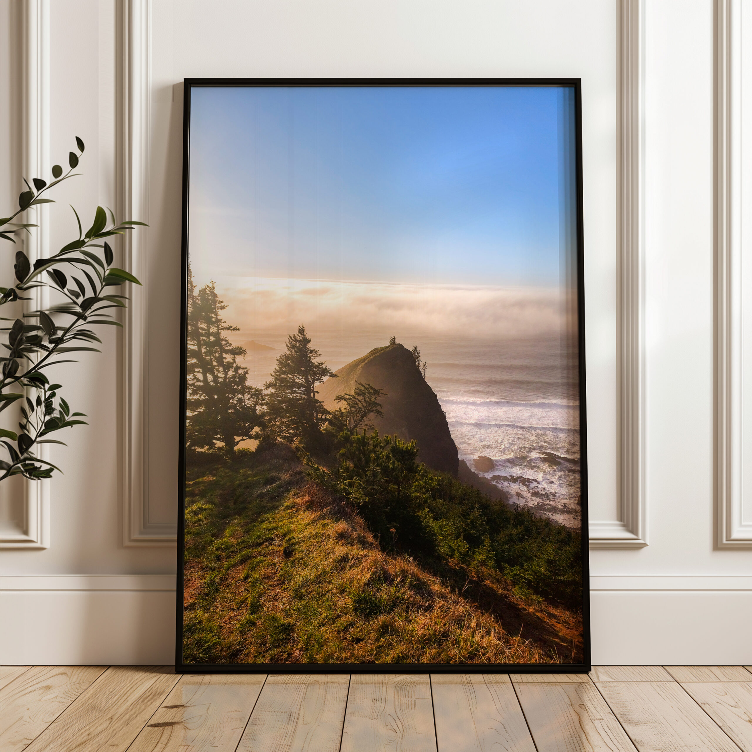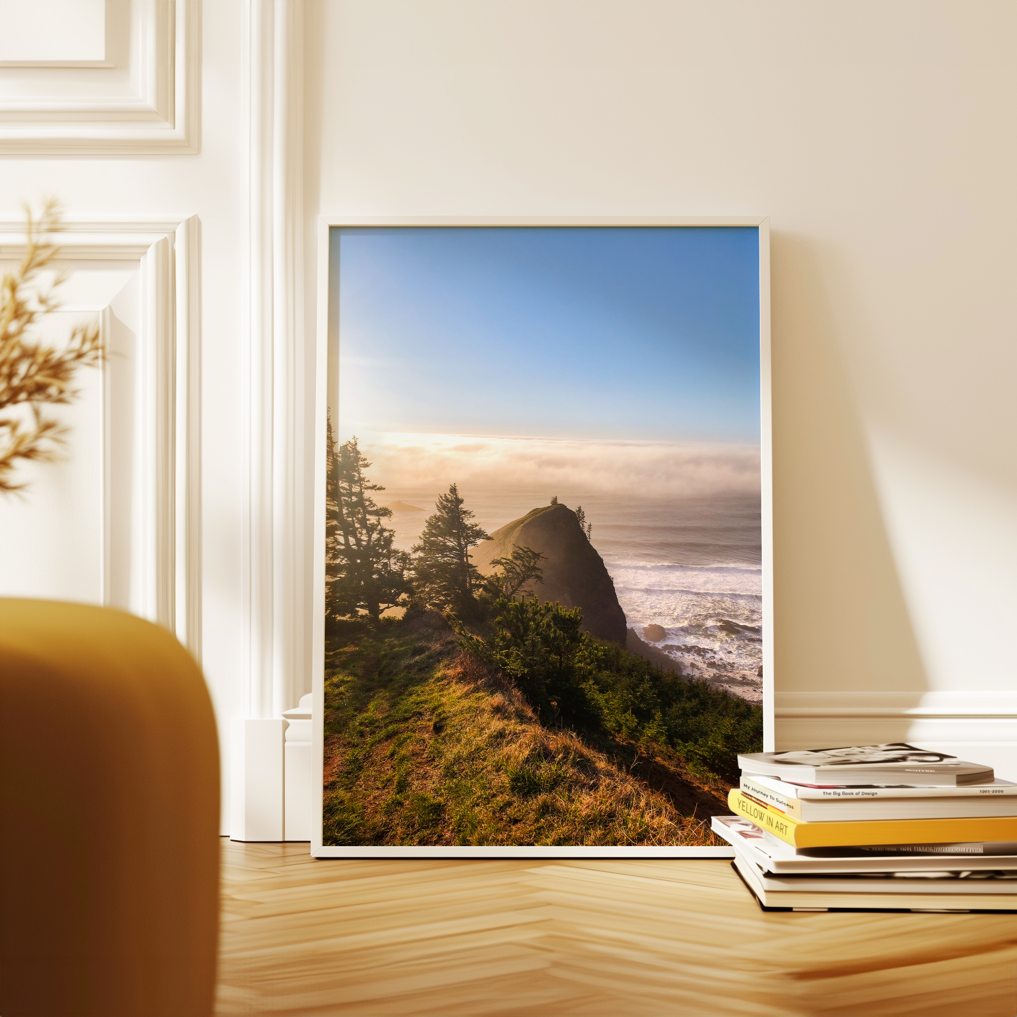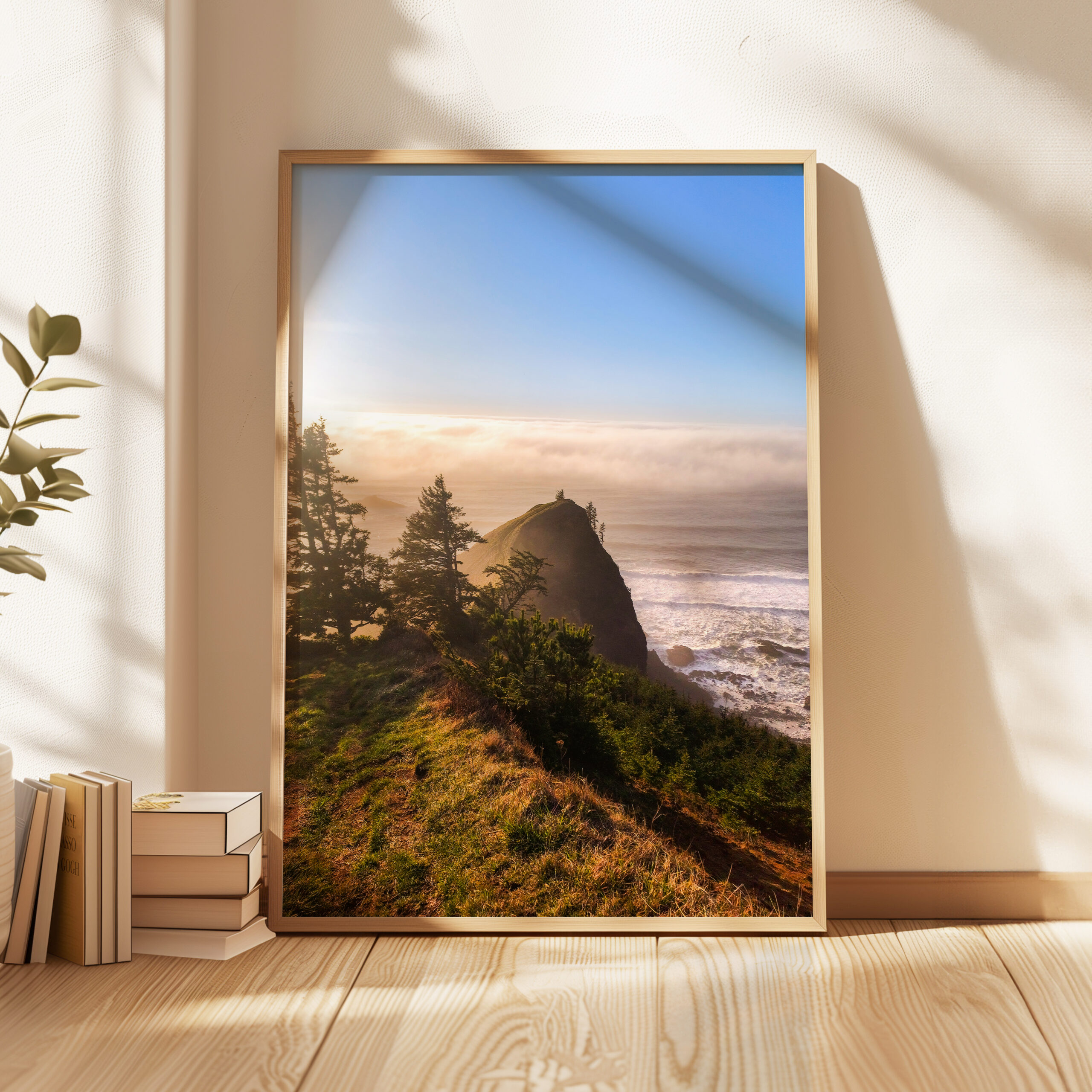 Experience the rugged charm of the Oregon Coast through the eyes of photographer Jessie Dysart. This visually compelling print features the famous God’s Thumb near Lincoln City, captured in March 2025. The image vividly portrays the dramatic landscape, from the verdant foreground trail to the powerful headland meeting the ocean waves. This photo offers a unique perspective on a beloved landmark, making a striking statement piece for travel enthusiasts and lovers of fine art photography.