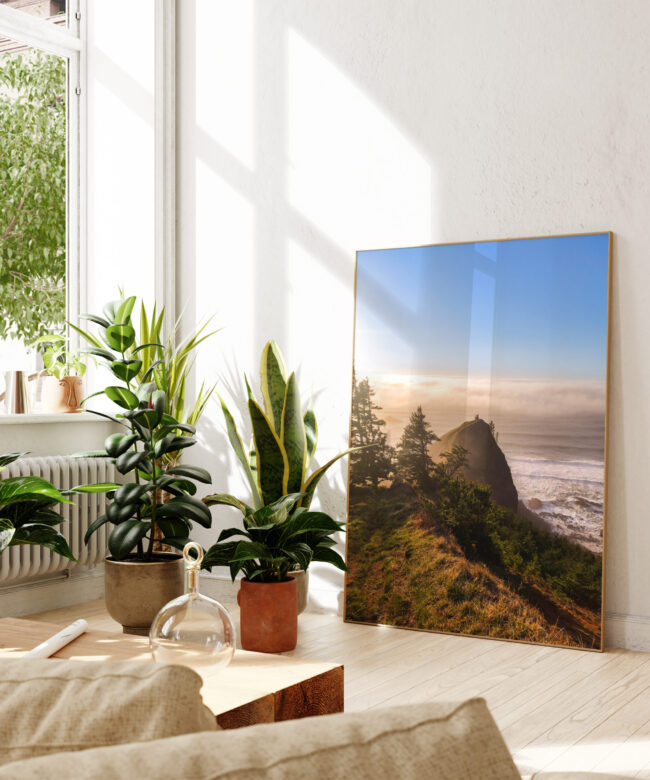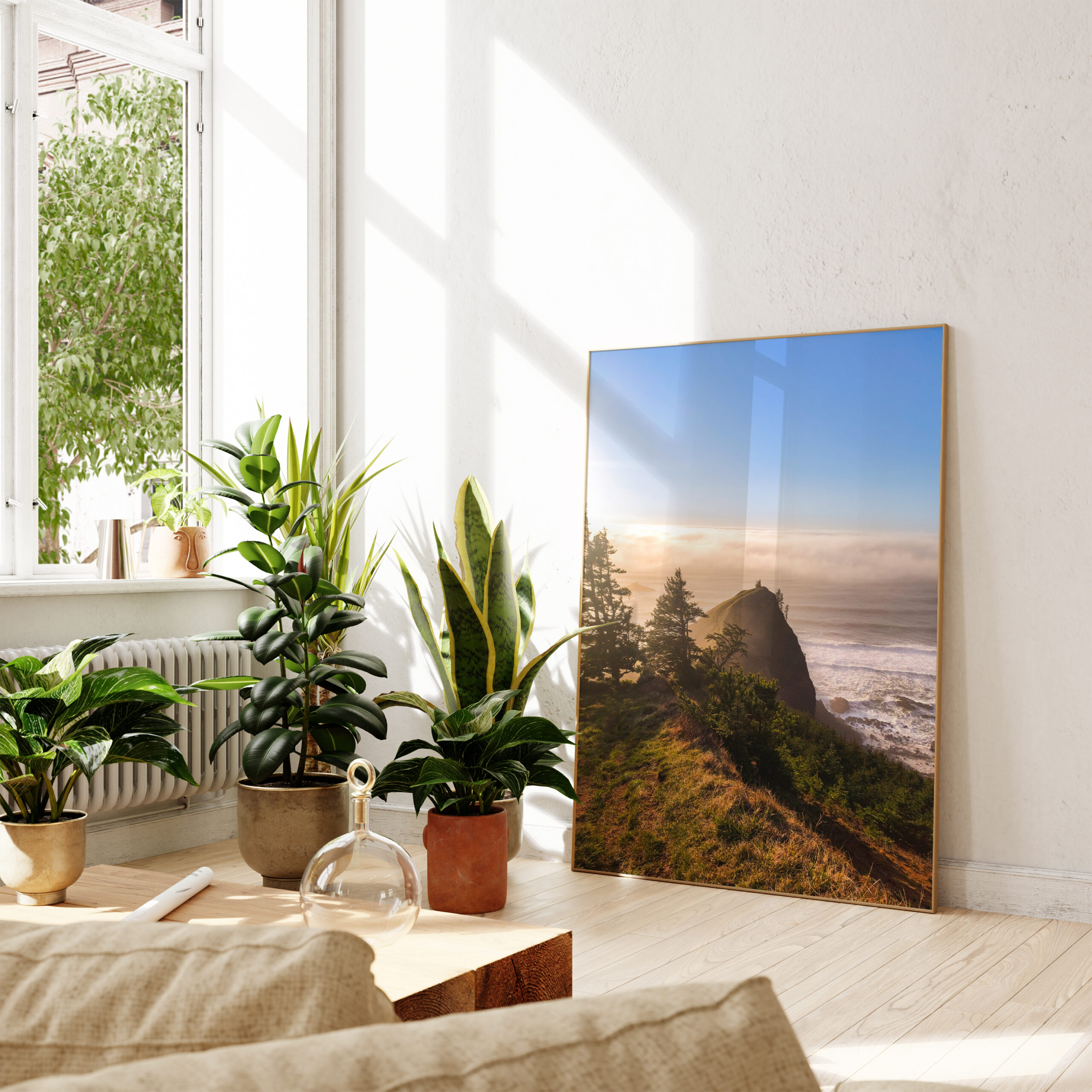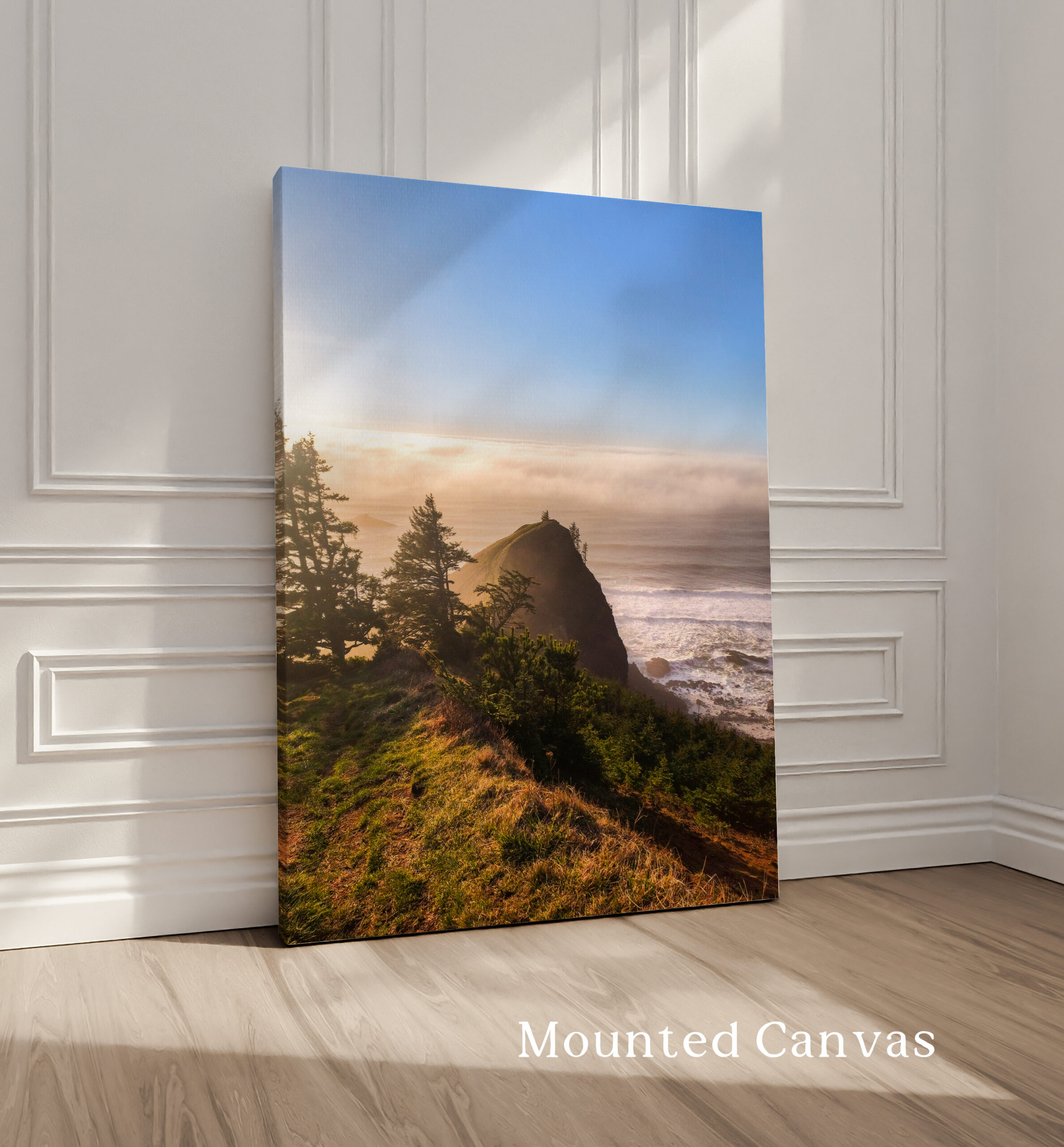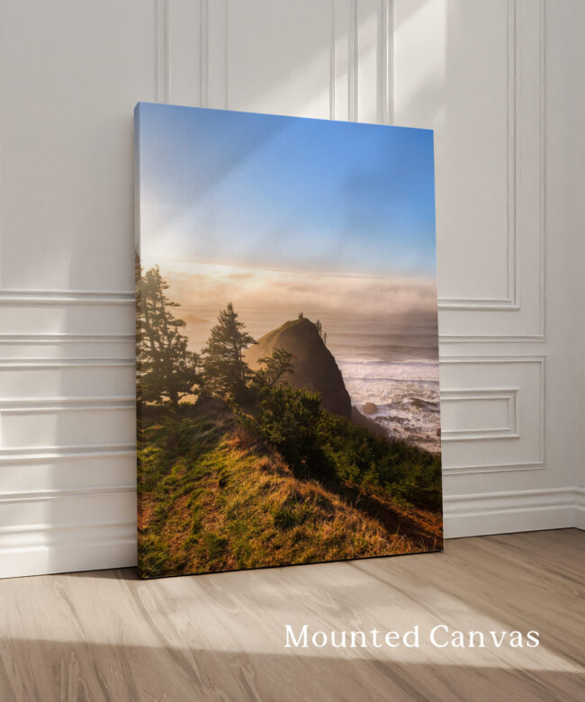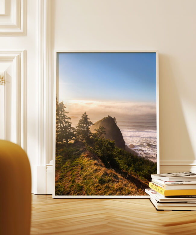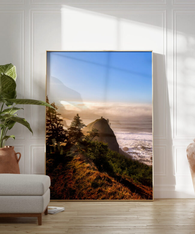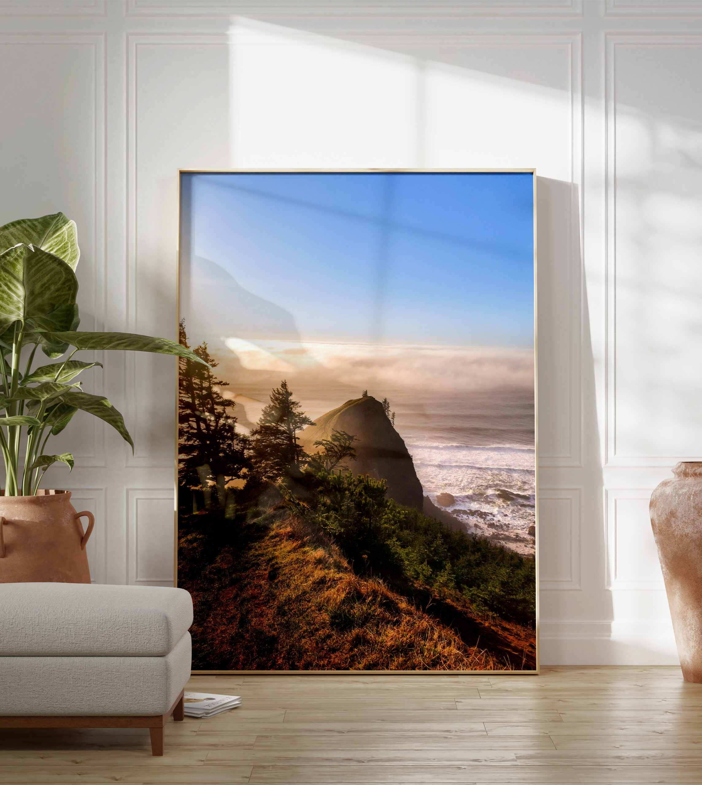 Experience the rugged charm of the Oregon Coast through the eyes of photographer Jessie Dysart. This visually compelling print features the famous God’s Thumb near Lincoln City, captured in March 2025. The image vividly portrays the dramatic landscape, from the verdant foreground trail to the powerful headland meeting the ocean waves. This photo offers a unique perspective on a beloved landmark, making a striking statement piece for travel enthusiasts and lovers of fine art photography.