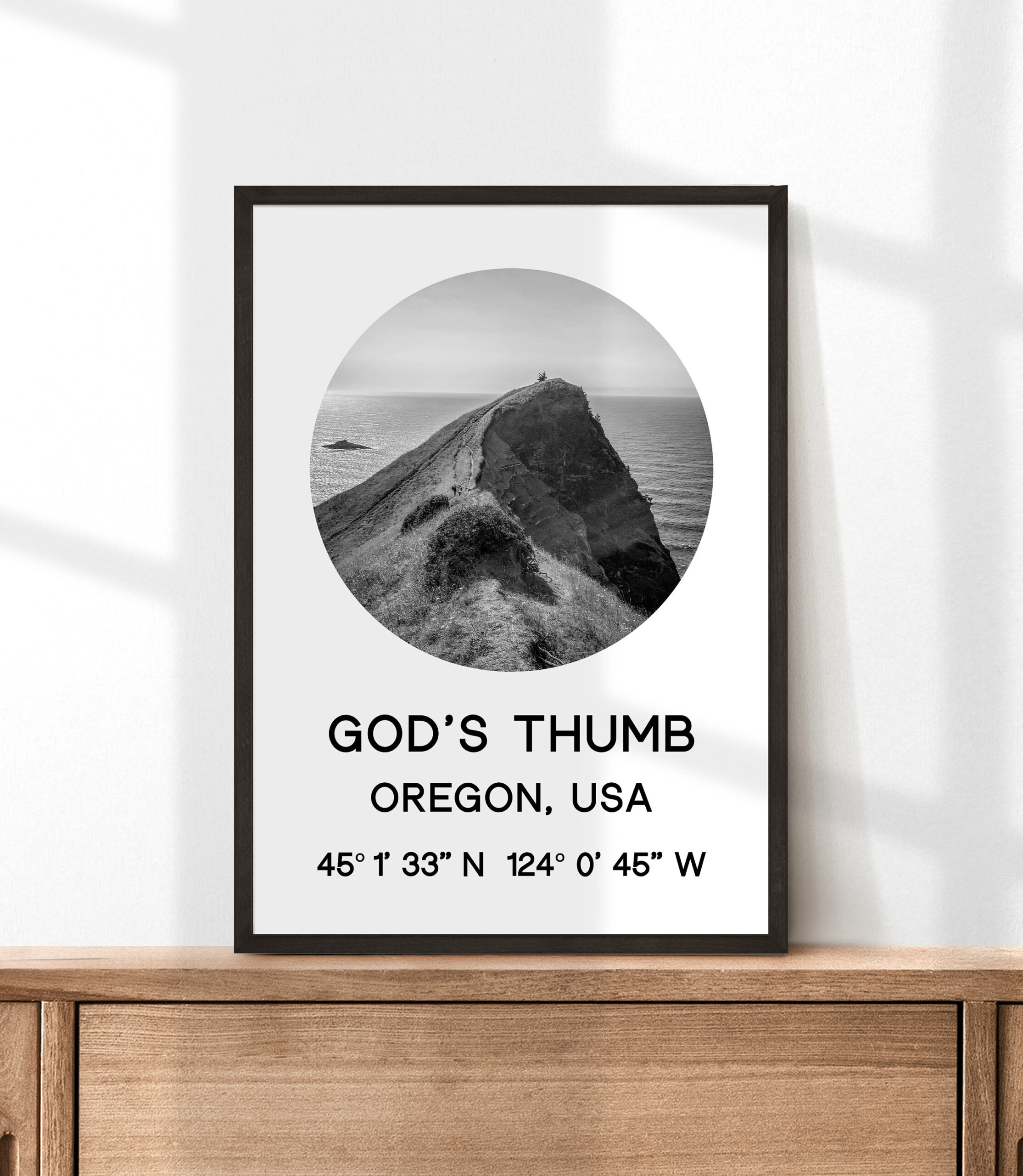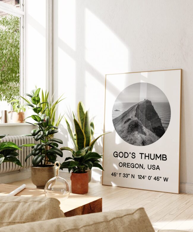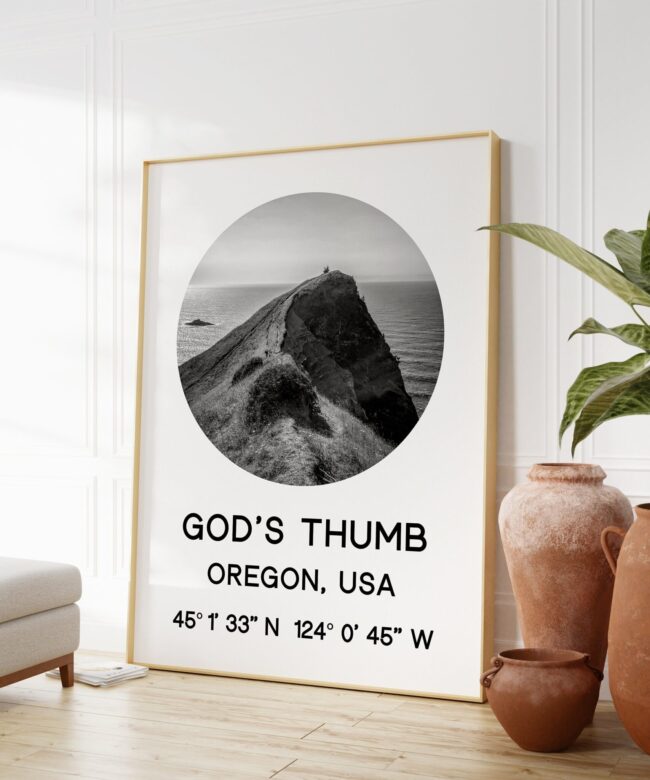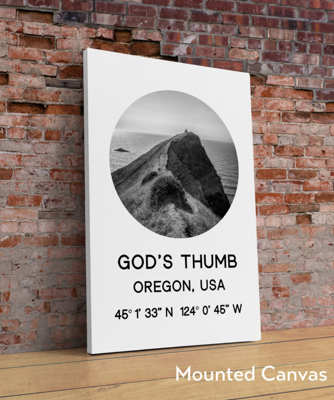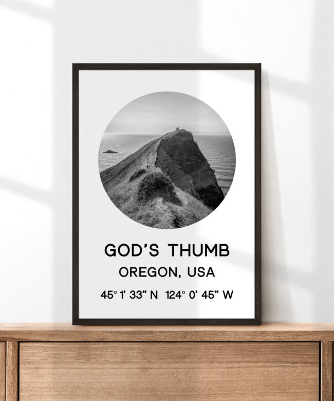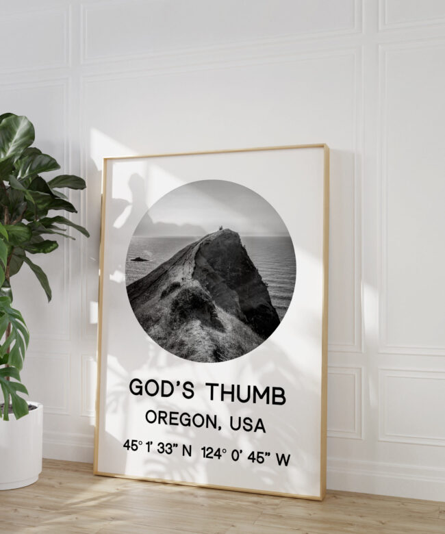 Immerse your space in the breathtaking beauty of God’s Thumb in Lincoln City, Oregon, with our Minimalist Art Print. This black and white photo, complemented by typography displaying the GPS coordinates, creates a visually stunning and modern piece.
