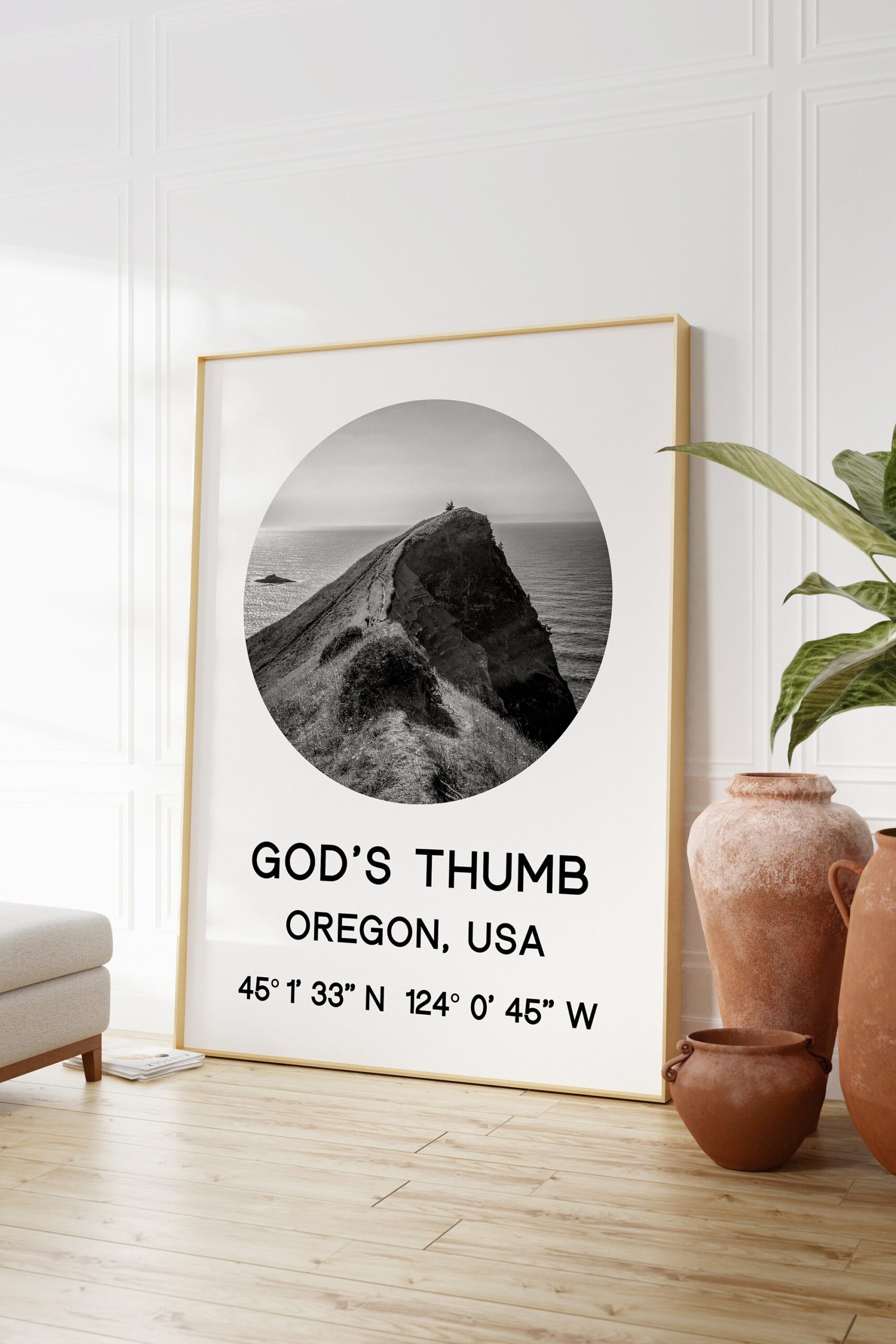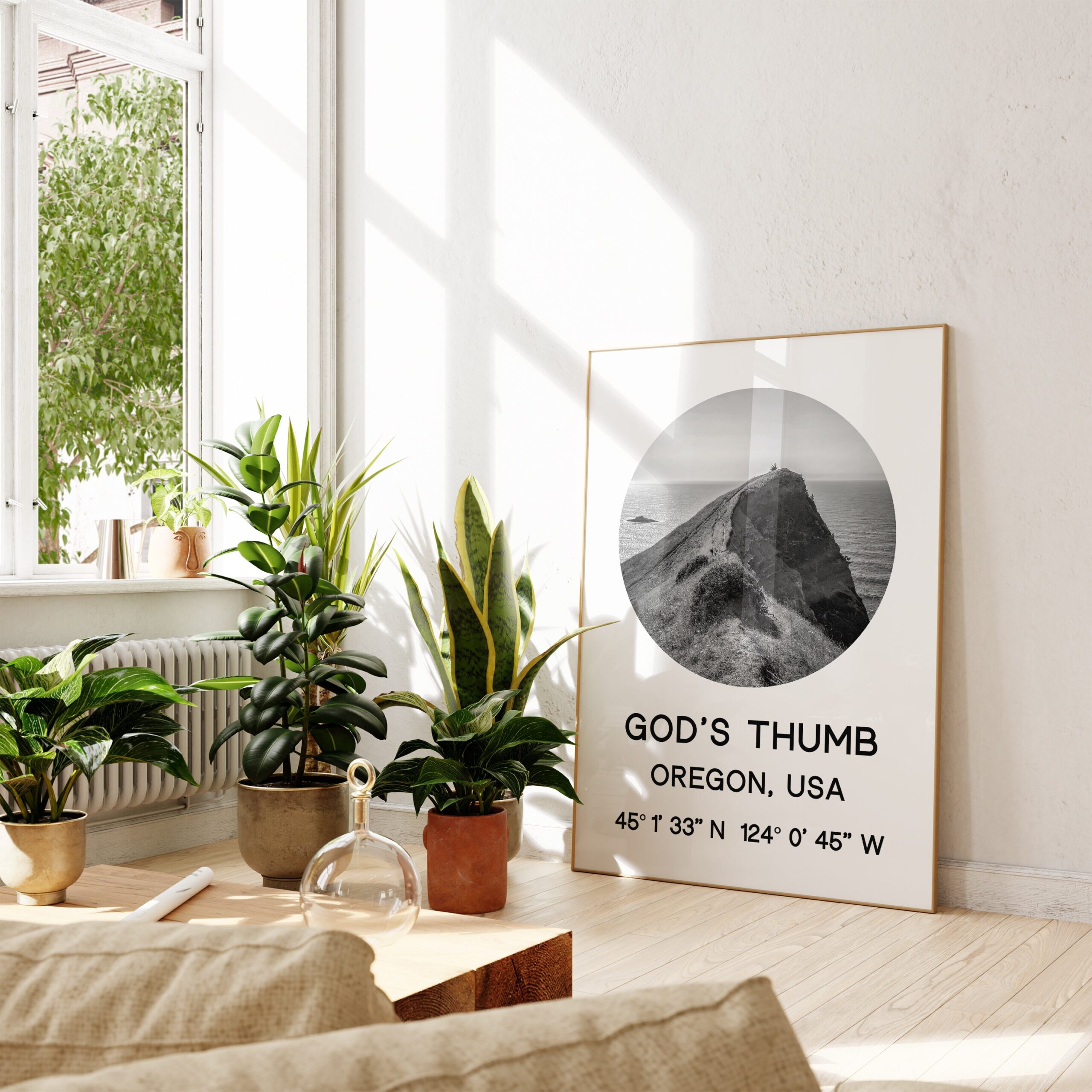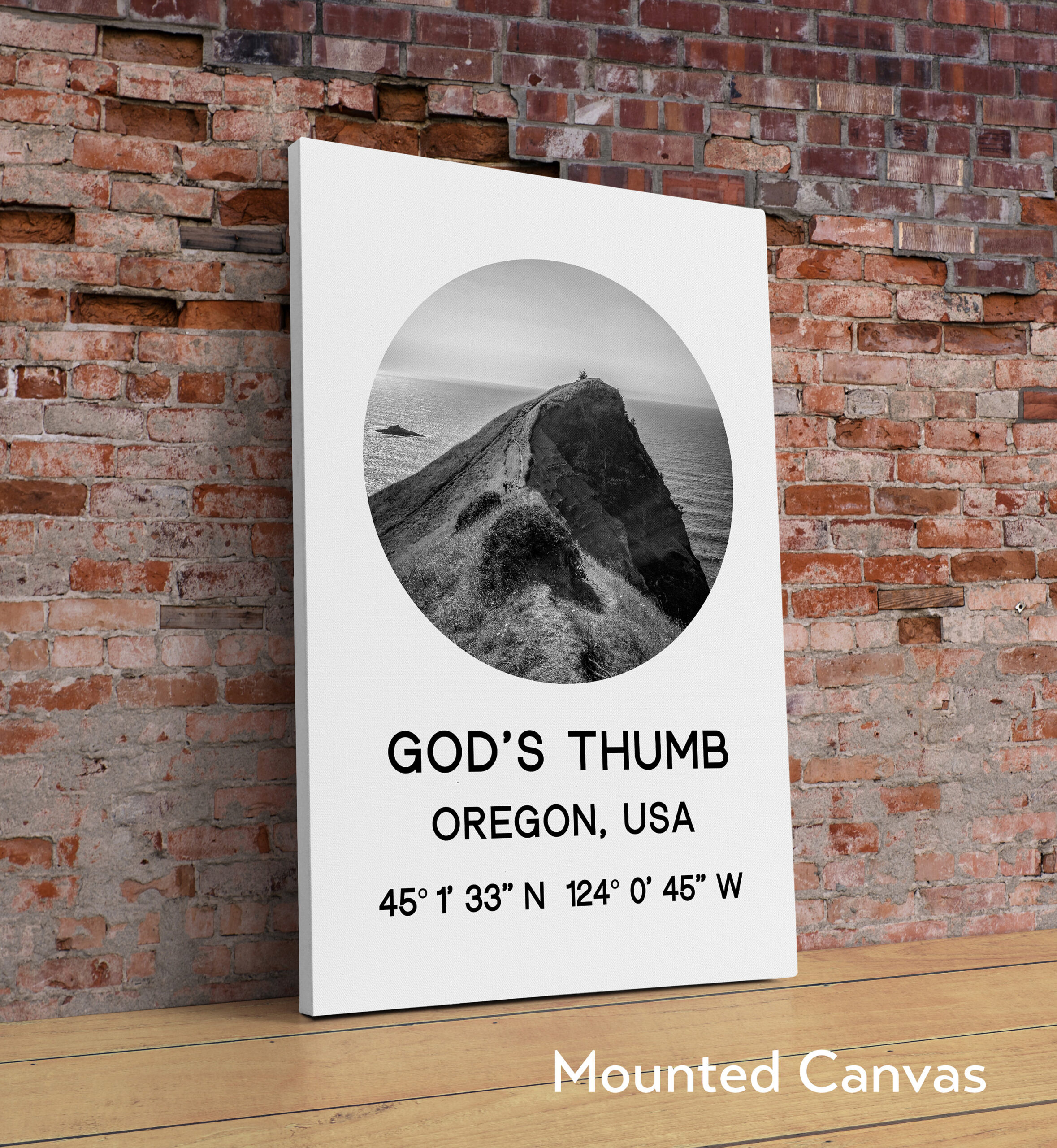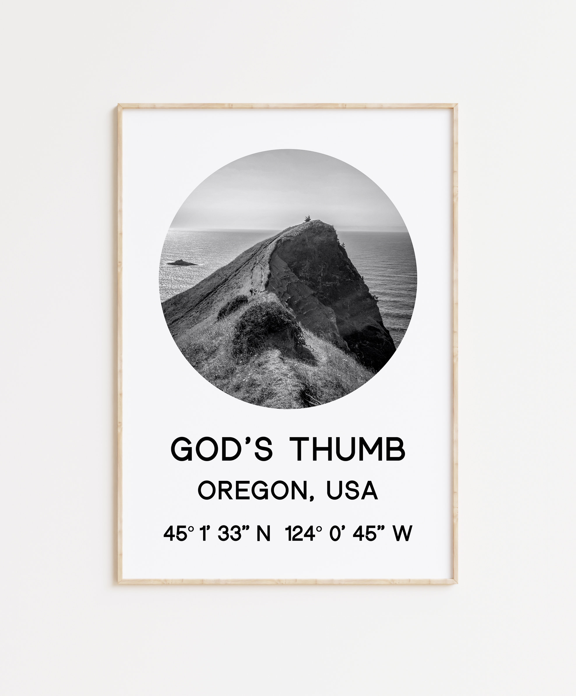 Immerse your space in the breathtaking beauty of God’s Thumb in Lincoln City, Oregon, with our Minimalist Art Print. This black and white photo, complemented by typography displaying the GPS coordinates, creates a visually stunning and modern piece.
