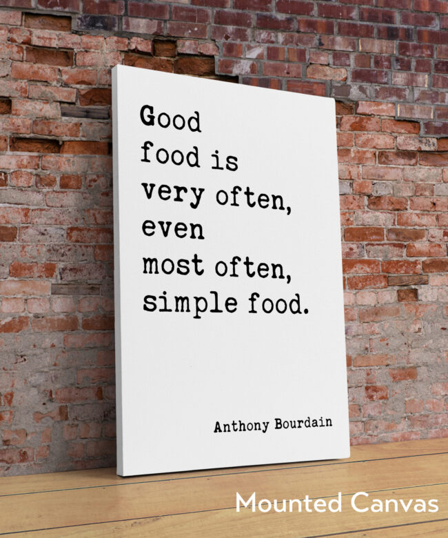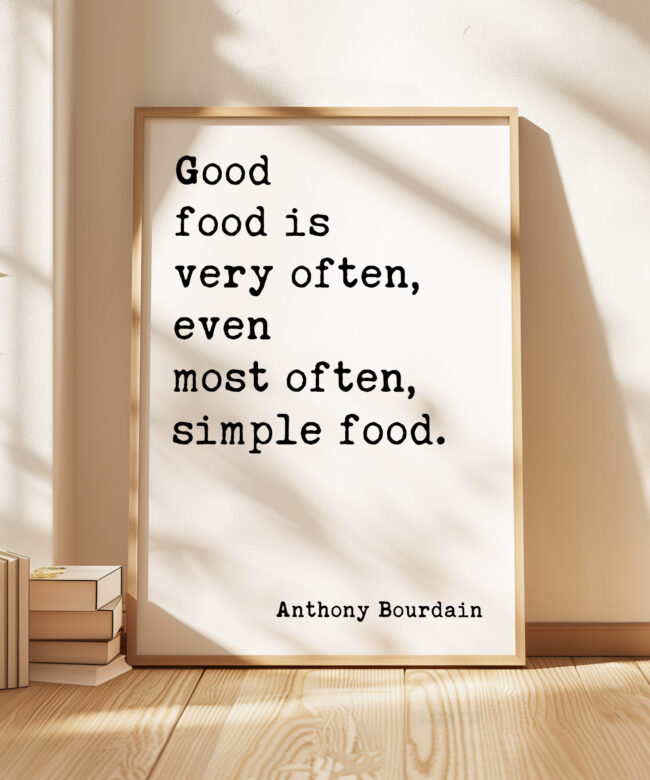 Enhance your kitchen or dining area with our Typography Art Print featuring Anthony Bourdain’s insightful words: “Good food is very often, even most often, simple food.” This art piece emphasizes the beauty of simplicity in culinary creations, making it a perfect addition for food enthusiasts and home cooks alike. Whether displayed in your kitchen or dining space, this print serves as a daily reminder that the best meals often come from simple ingredients and heartfelt preparation.