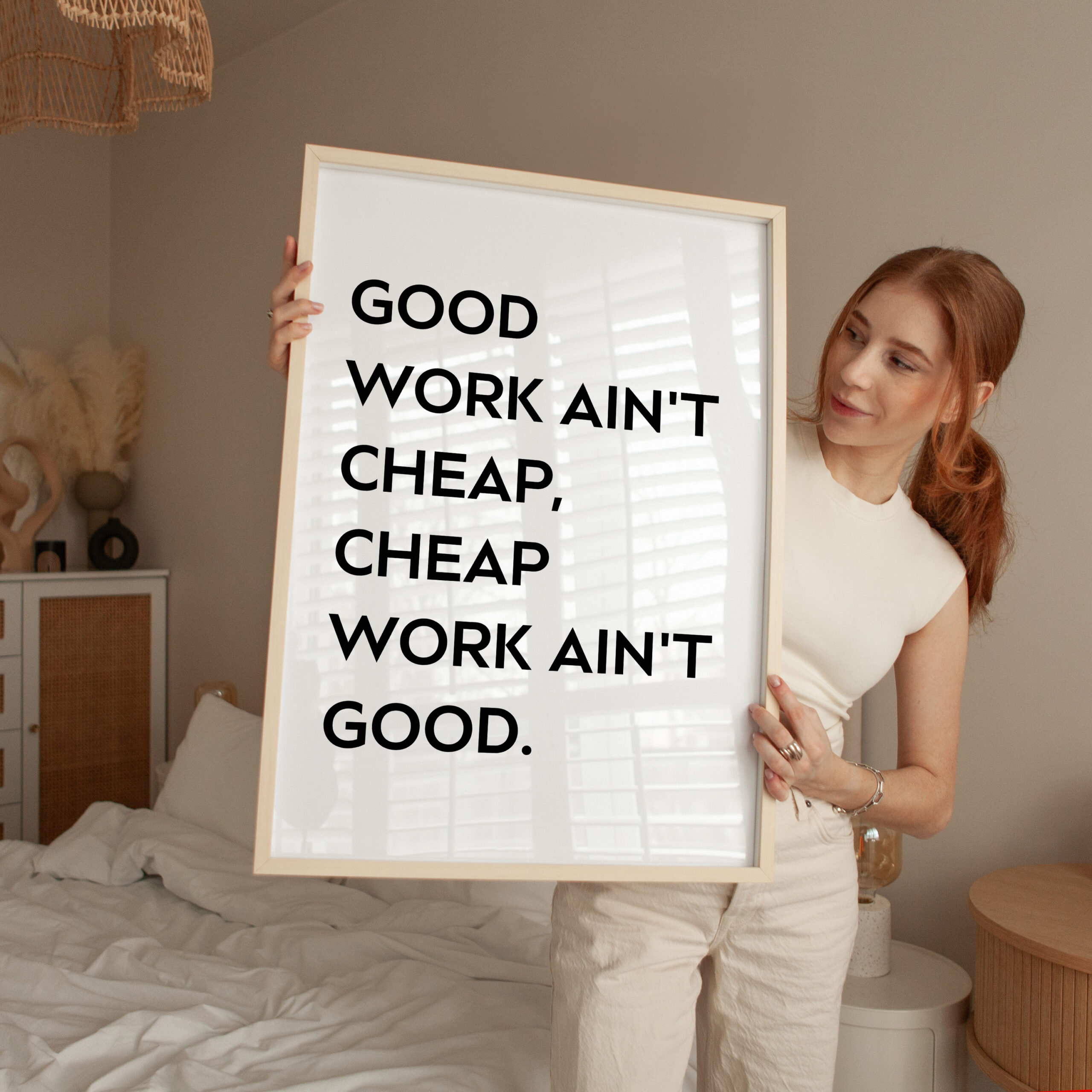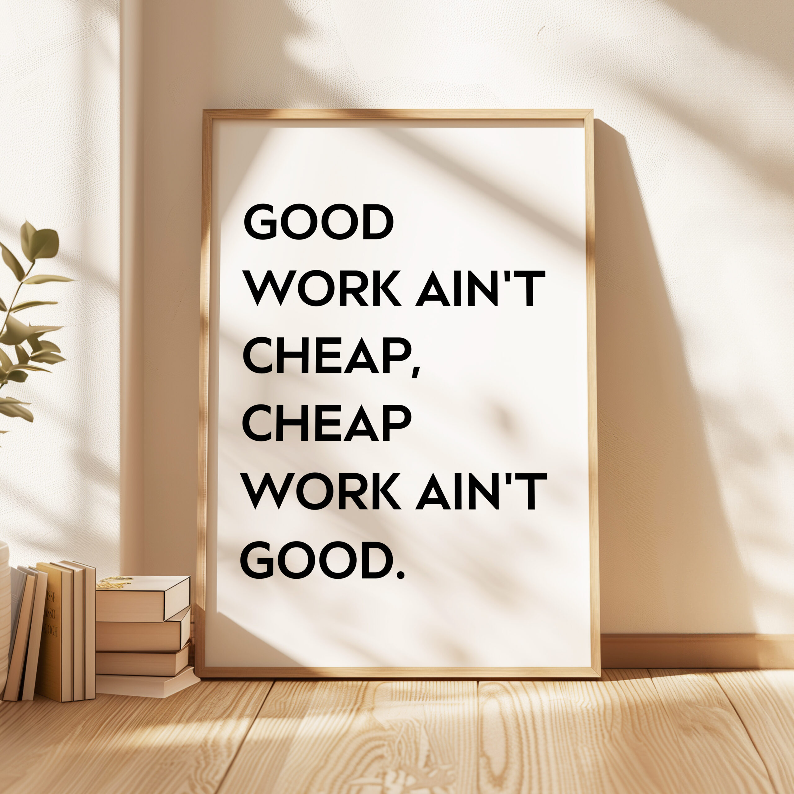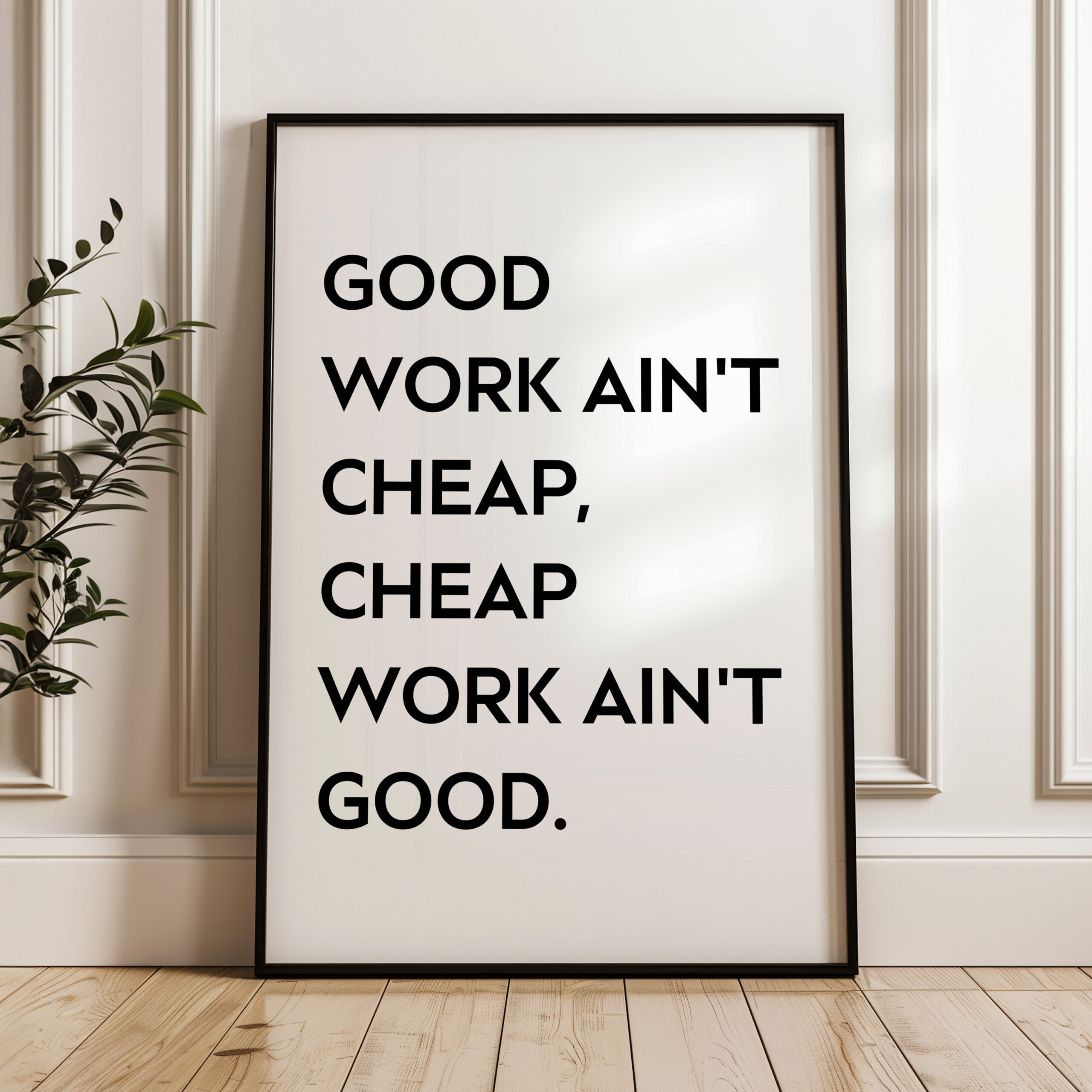 This bold and motivational typography art print is a reminder that quality work requires time, effort, and investment. Featuring the phrase “Good work ain’t cheap, cheap work ain’t good,” it’s perfect for professionals, creatives, and anyone who values the craft behind the work. This print serves as an empowering piece to hang in an office, studio, or workspace to encourage a commitment to excellence.