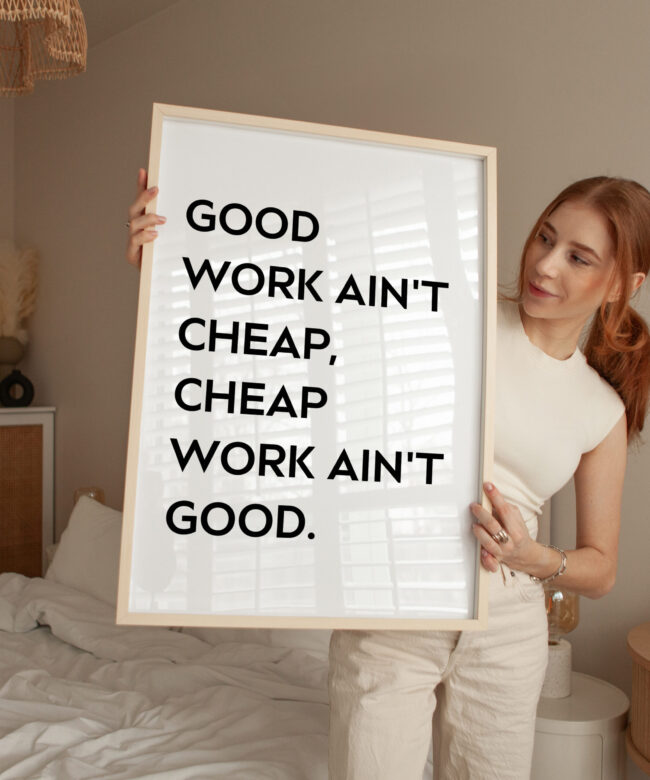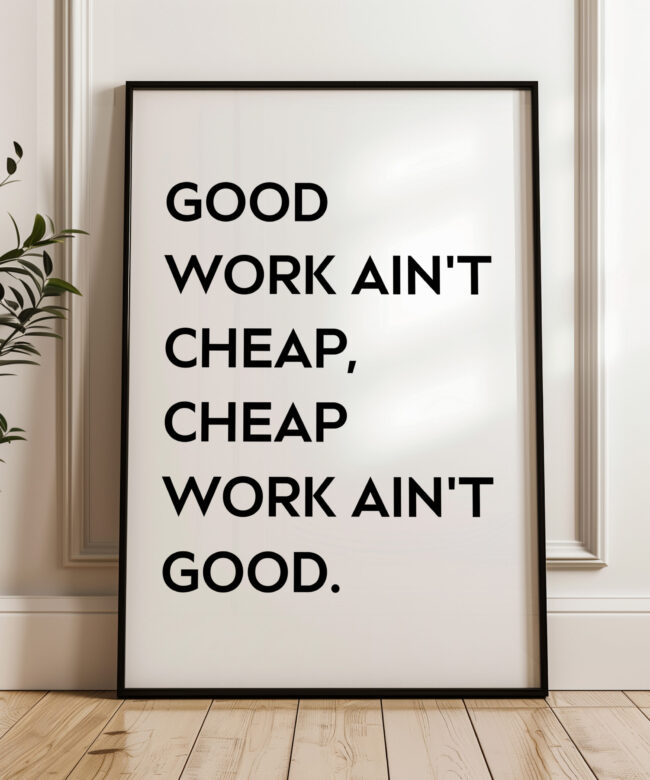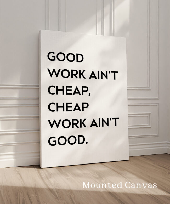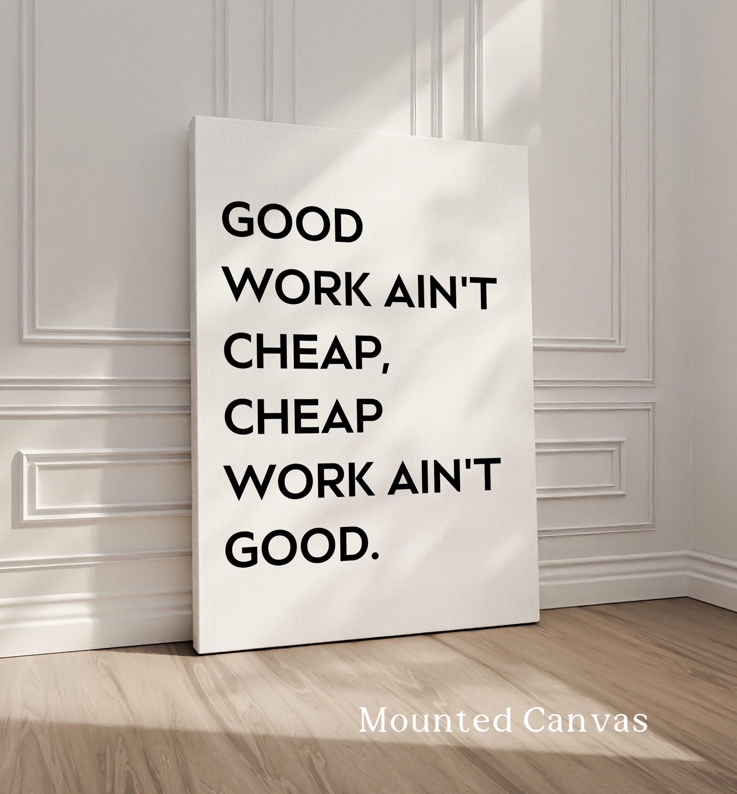 This bold and motivational typography art print is a reminder that quality work requires time, effort, and investment. Featuring the phrase “Good work ain’t cheap, cheap work ain’t good,” it’s perfect for professionals, creatives, and anyone who values the craft behind the work. This print serves as an empowering piece to hang in an office, studio, or workspace to encourage a commitment to excellence.