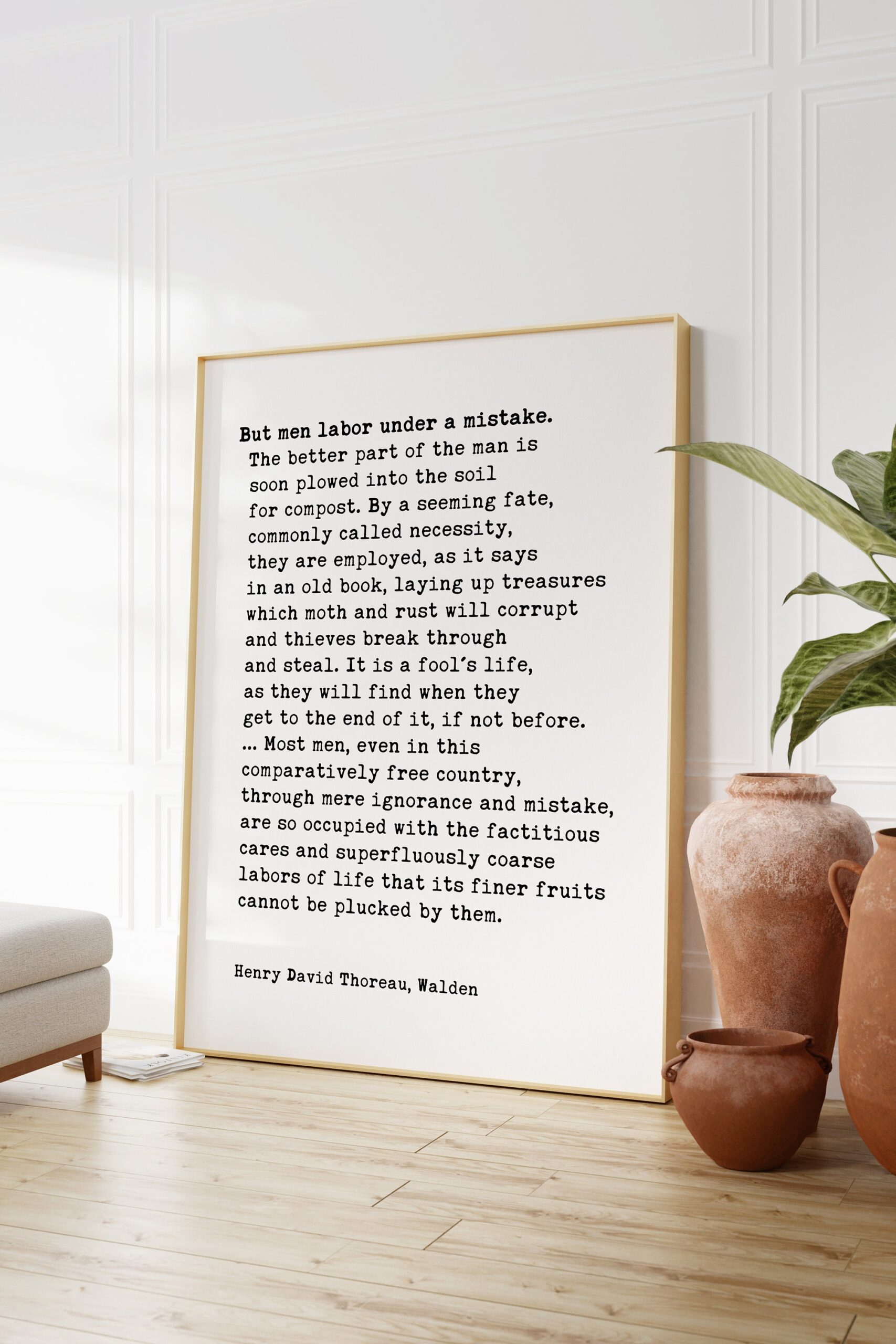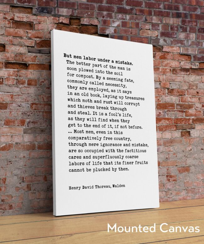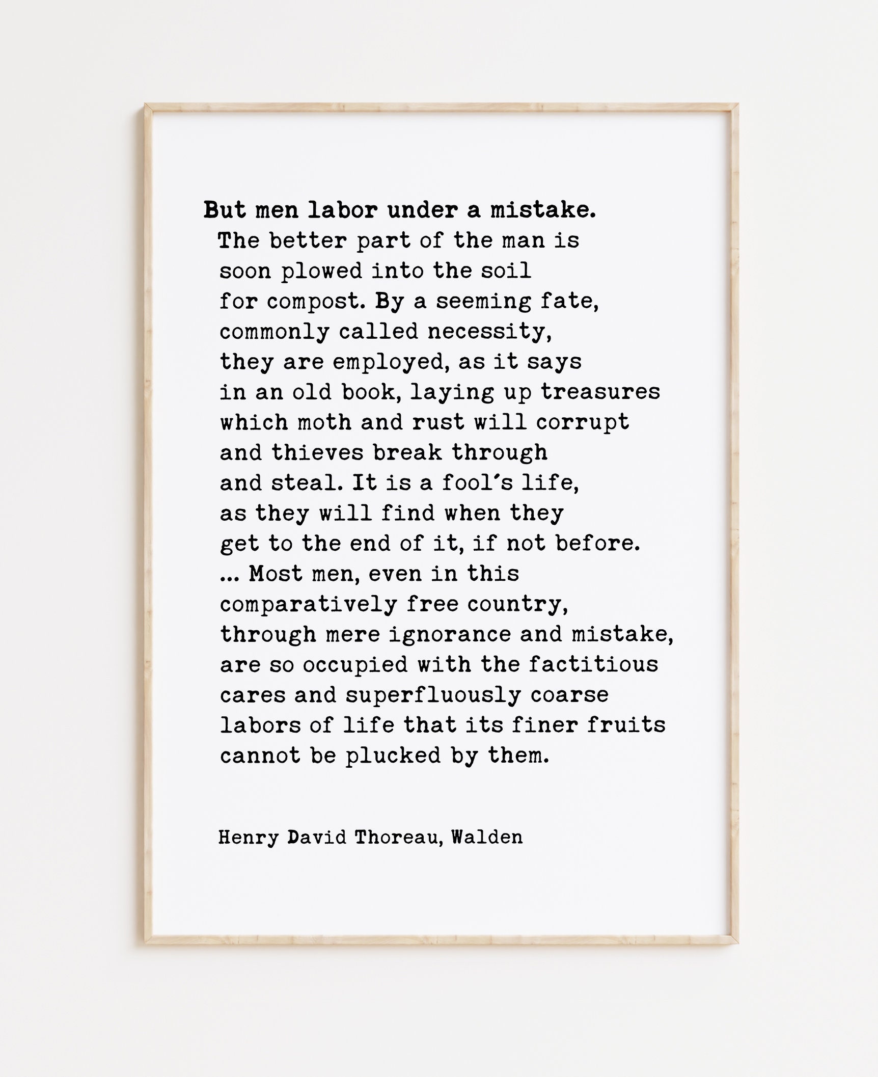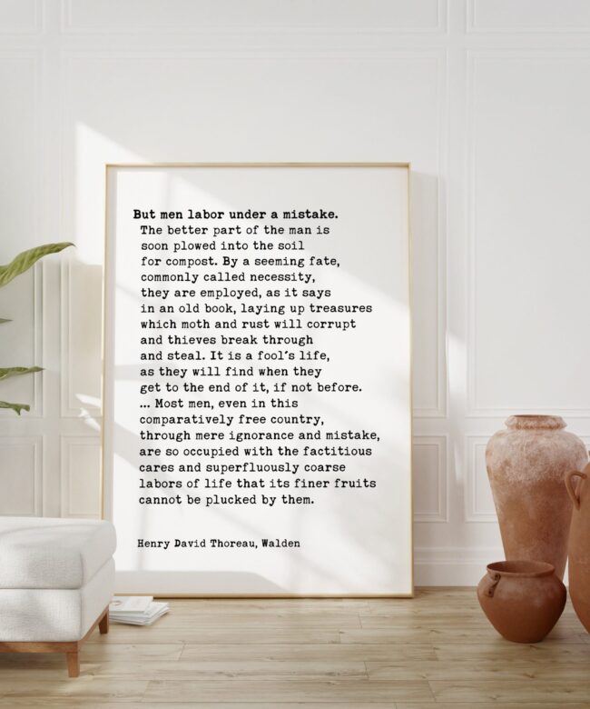 But men labor under a mistake. The better part of the man is soon plowed into the soil for compost. By a seeming fate, commonly called necessity, they are employed, as it says in an old book, laying up treasures which moth and rust will corrupt and thieves break through and steal. It is a fool’s life, as they will find when they get to the end of it, if not before. … Most men, even in this comparatively free country, through mere ignorance and mistake, are so occupied with the factitious cares and superfluously coarse labors of life that its finer fruits cannot be plucked by them.