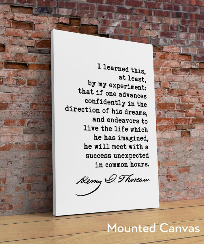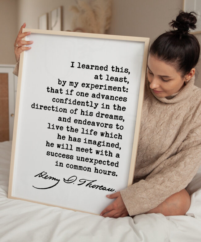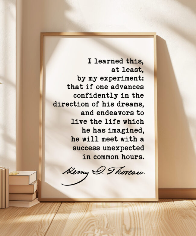 Embrace the adventure of life and pursue your passions with this captivating typography art print. Featuring the timeless words of Henry David Thoreau, “I learned this, at least, by my experiment; that if one advances confidently in the direction of his dreams, and endeavors to live the life which he has imagined, he will meet with a success unexpected in common hours,” this artwork serves as a powerful reminder to chase your dreams and live a life of purpose.