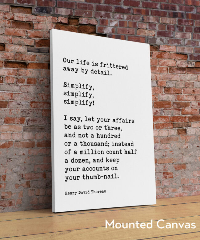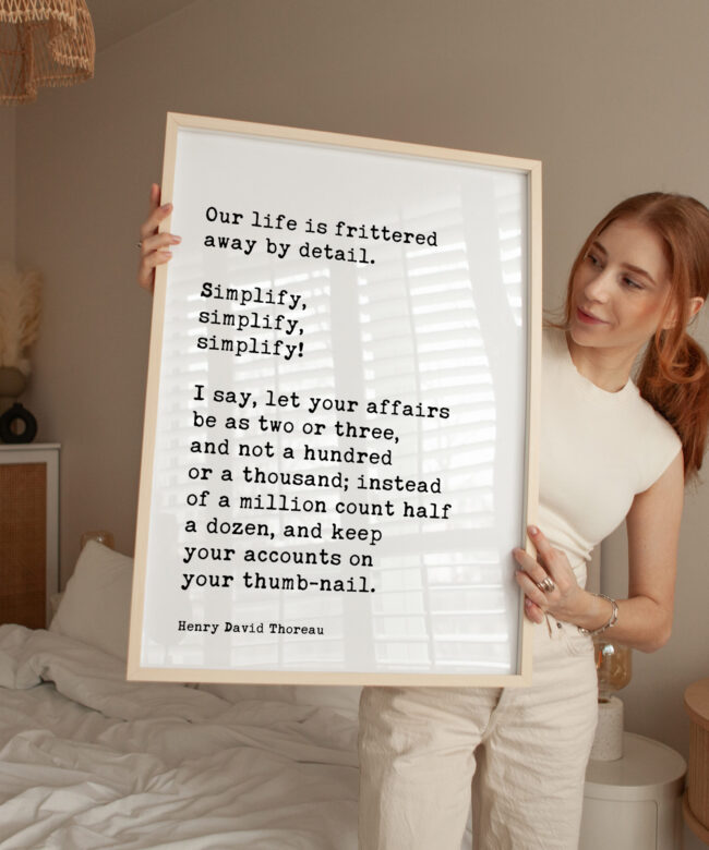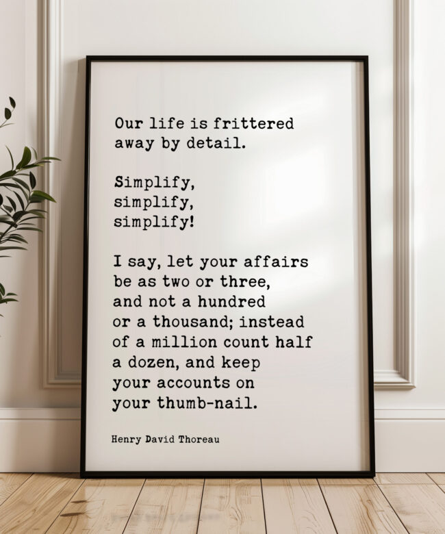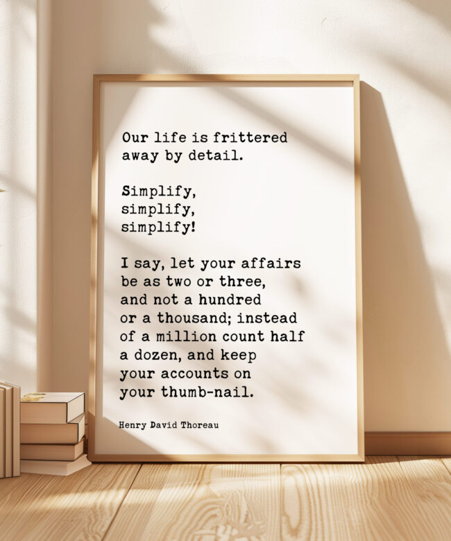 Embrace the wisdom of simplicity with this Typography Art Print featuring the thought-provoking quote by Henry David Thoreau: “Our life is frittered away by detail. Simplify, simplify, simplify! I say, let your affairs be as two or three, and not a hundred or a thousand; instead of a million count half a dozen, and keep your accounts on your thumb-nail.” This beautifully crafted print captures the essence of Thoreau’s philosophy, encouraging a life focused on what truly matters.